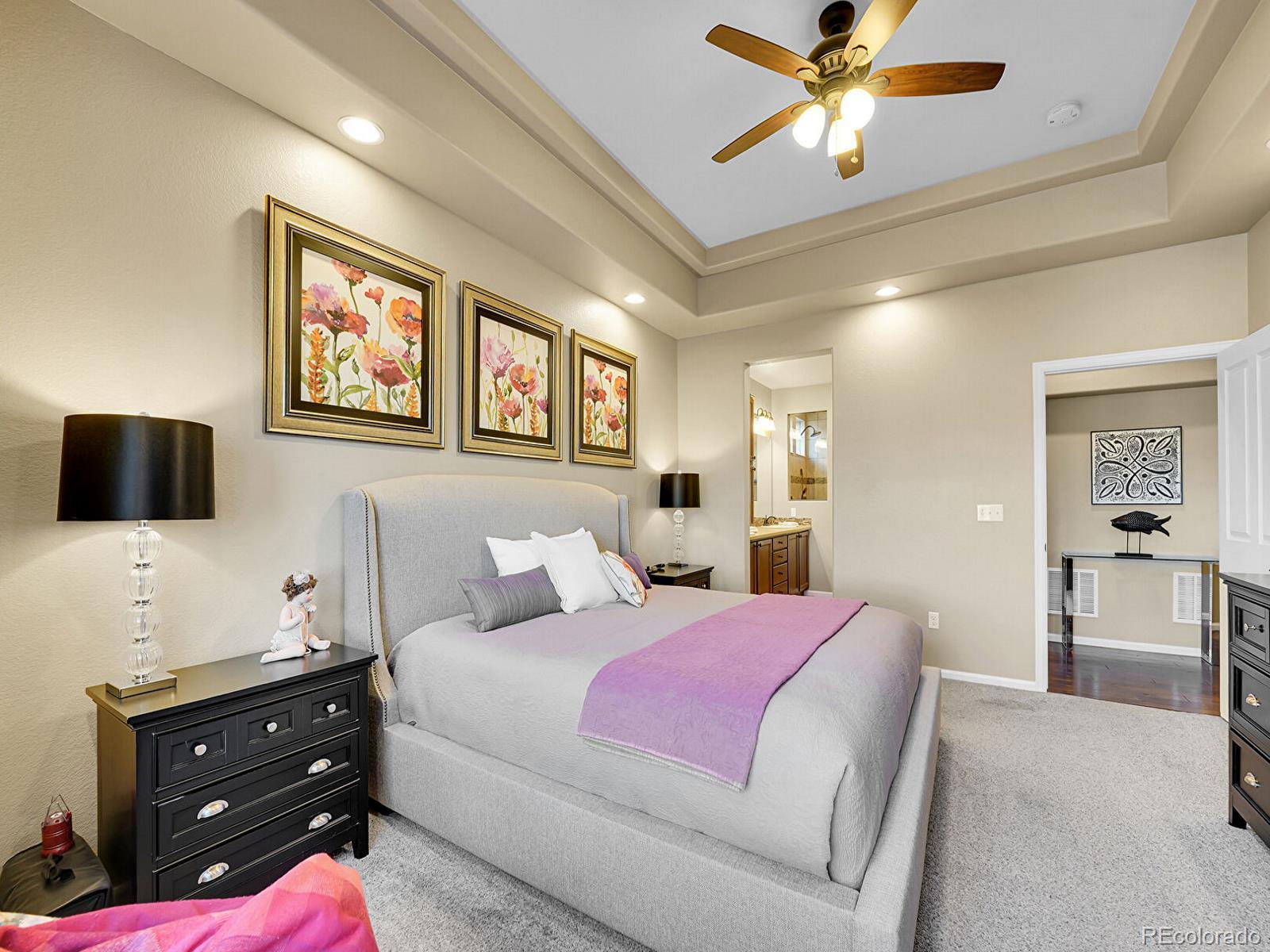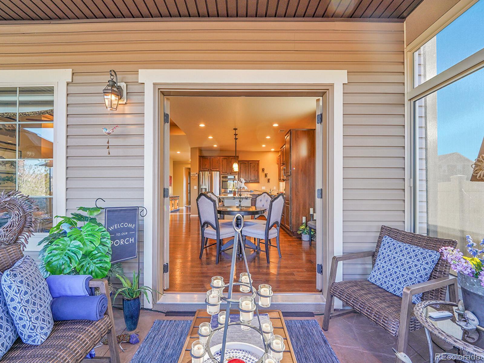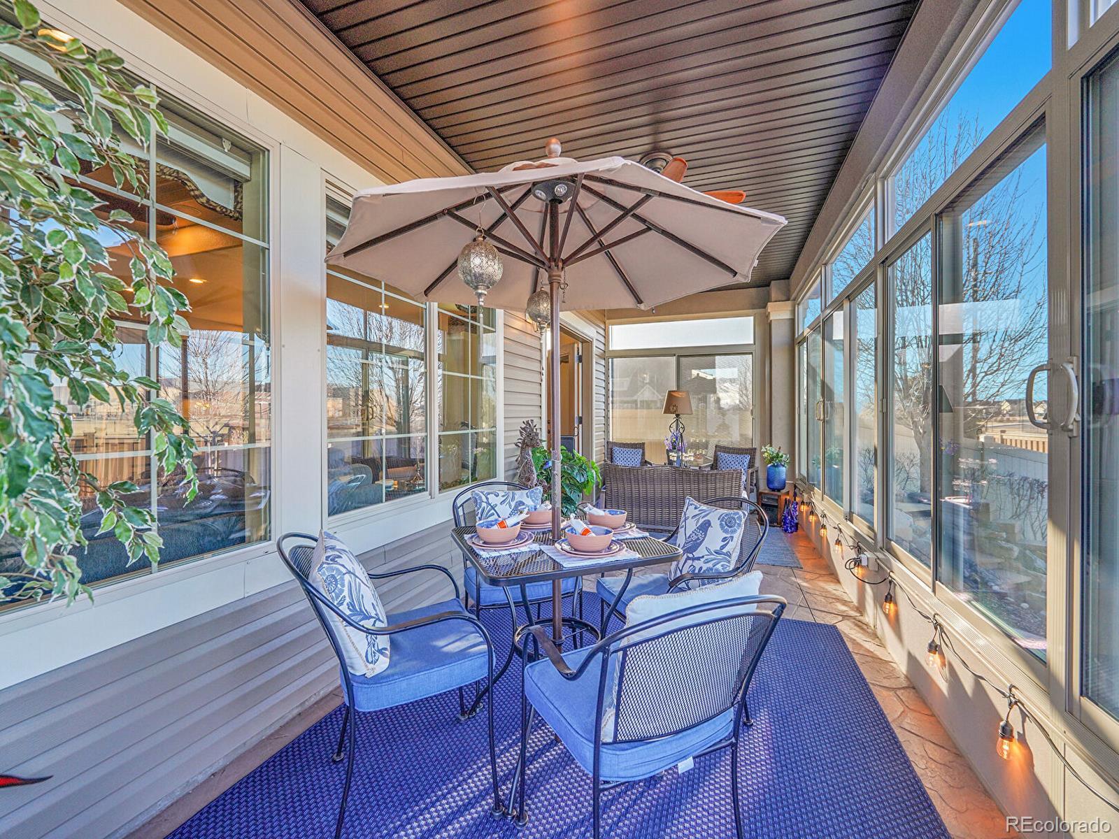 Welcome to 19509 E 55th Ave, a beautifully updated ranch in the desirable Fairway Villas, an active 55+ community in Green Valley Ranch! Positioned on a sunny corner lot with a maintenance-free exterior and xeriscaped landscaping, this home offers low-maintenance living with outstanding upgrades throughout. Inside, over 2,800 finished square feet unfold across a bright, open main level with stunning engineered hardwood floors and thoughtful architectural details. The inviting open living room is anchored by a stacked stone gas fireplace and elegant coffered ceiling, and flows seamlessly into the dining area which connects an oversized kitchen island with a sprawling sunroom to create an entertainer’s paradise. The hallmark of this home’s open floorplan, the gourmet kitchen features granite countertops, upgraded cabinetry, pantry storage, stainless steel appliances, double ovens, and a 5-burner gas cooktop for the most seasoned chef. The primary suite is a relaxing retreat with tray ceilings, a spacious walk-in closet, and a spa-inspired bath with dual sinks and a large walk-in glass shower with bench seating. A second main-level bedroom and full bath with soaking tub are perfect for guests, while a spacious foyer and outstanding office create character. Convenient main-level laundry room with storage and utility sink, perfect for single-level living. Upstairs, the expansive loft with half-bath provides flexible space for an additional bedroom suite PLUS an additional living space! Enjoy year-round comfort in the glass-enclosed sunroom filled with natural light and peek-a-boo mountain views, or step outside to the tiered patio with a tranquil water feature and fully fenced yard. Attached two-car garage! Residents of Fairway Villas enjoy access to a private clubhouse with a pool, fitness center, library, coffee bar, and more, just minutes from walking trails and Green Valley Ranch Golf Club. Enjoy low-maintenance Colorado living at its finest.