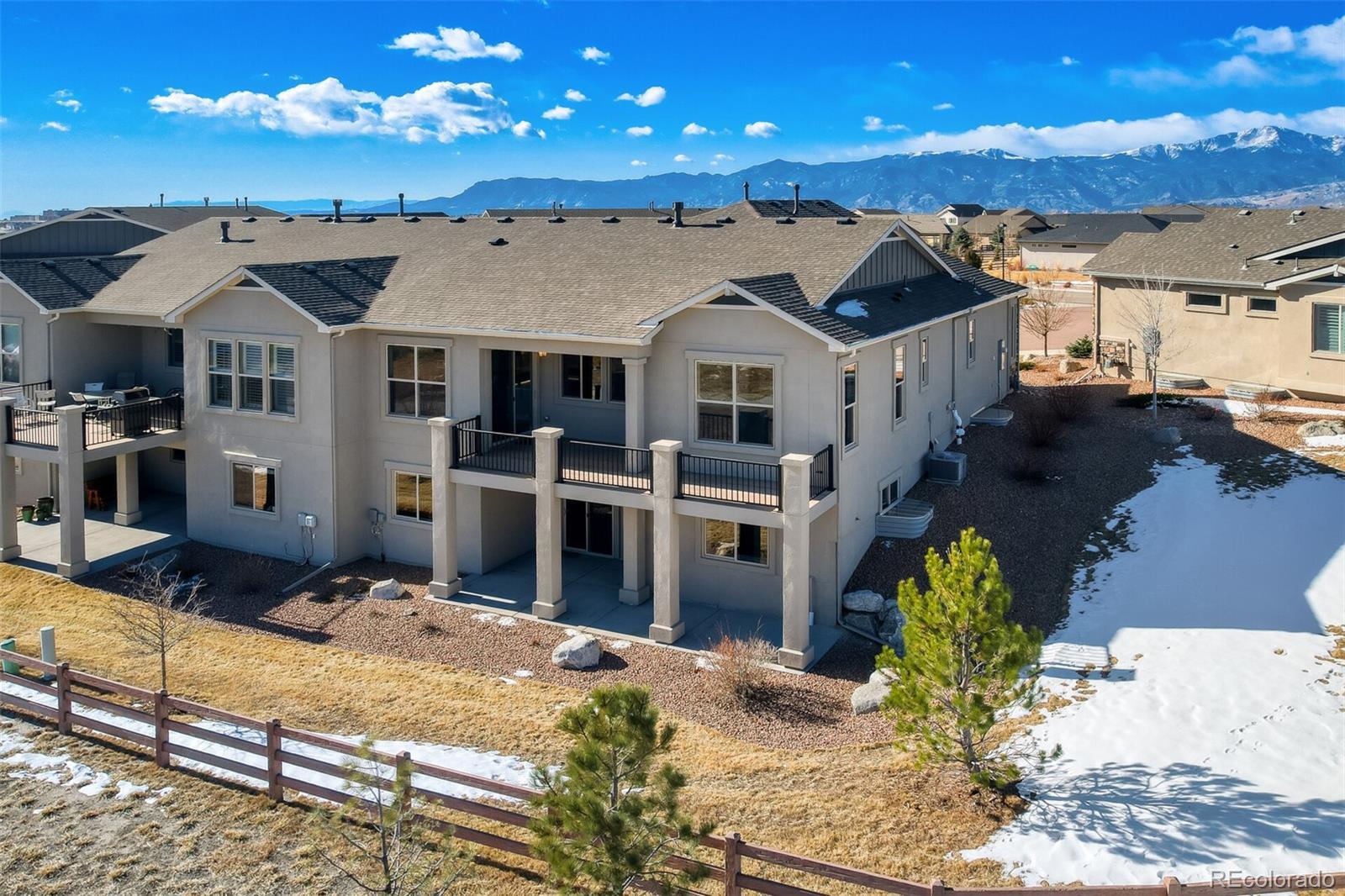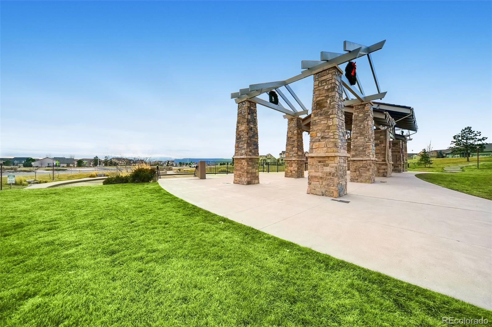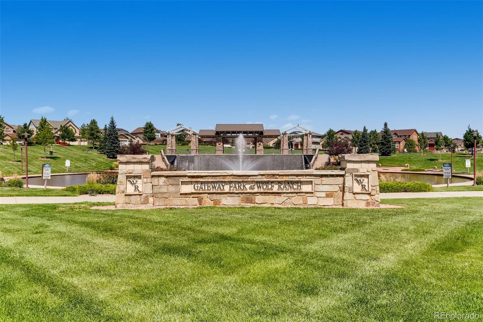 Welcome to the luxurious Legends at Wolf Ranch ranch styled maintenence-free home. A must-see end unit patio home! The spacious living room is anchored by a stone gas fireplace with a wooden mantle. This living space flows into the gorgeously.appointed kitchen equipped with solid counter surfaces, KitchenAid stainless steel appliances, a large gas range with an open statement hood, in wall microwave and oven, backsplash, large island, and a walk-in pantry. Adjacent to the kitchen a spacious and bright dining area awaits as your perfect for hosting dinner parties or BBQs, with easy access to the deck through the sliding glass door, a fantastic space for entertainment or relaxation oer the open. The low-maintenance lifestyle is ensured with the maintaining of all community grounds, and community pool, trails, and lake. The main level also offers your primary retreat with on-suite and large walk-in closet. The bathroom features solid countertops, roomy vanity with double.sinks and mirrors with a large walk-in shower. The office comes with built-ins and stunning mountiaim views, and a spaciois powder room is nestled.nearby. Iron railed staircase down to the basement to find an expansive family room with a perfect wet bar for gatherings or movie nights, wired for overhead projection. There are two additional basement bedrooms and a spacioisly designed bathroom offering an ideal space for children or guests. Adding to its appeal, this home is located in the highly sought-after award winning D-20 School District. Nothing but the most excellent amenities. Enjoy a clubhouse, pool, splash park, 398 acres of planned parks/open spaces, lake for paddle boarding and open views, a location w/ miles and miles of paved trails. Special in every way... this immaculate home is ready now! Again, the Rocky Mountain Views, Mutli-colored sunrises and sunsets are spectacular from this sparkling and spotless home with walkout basement, open space and culdesac location