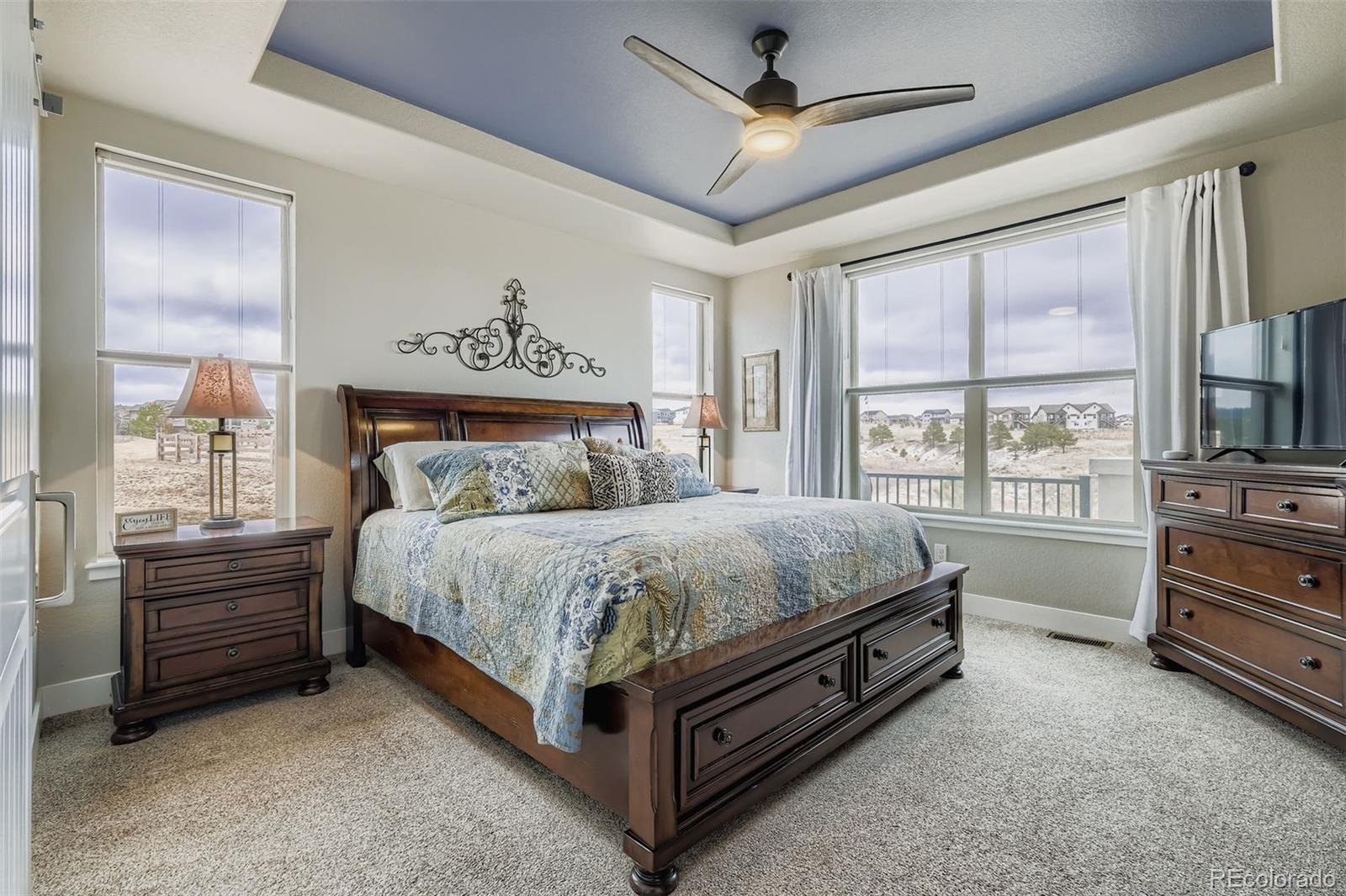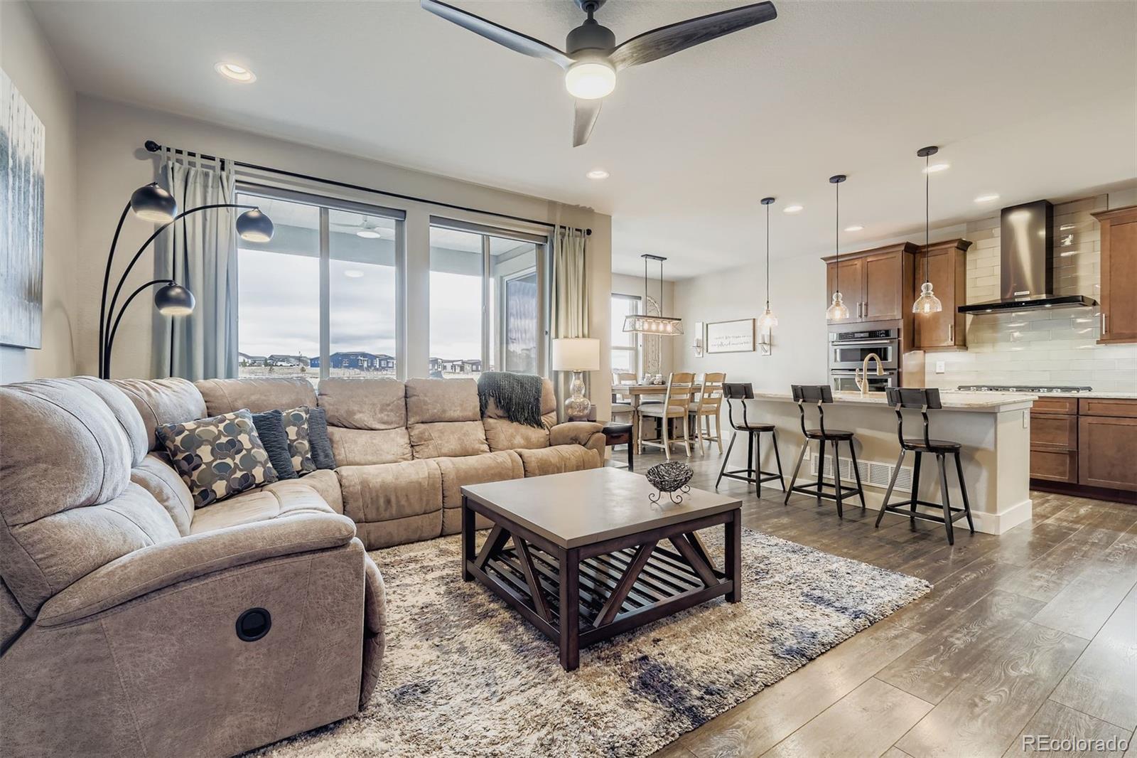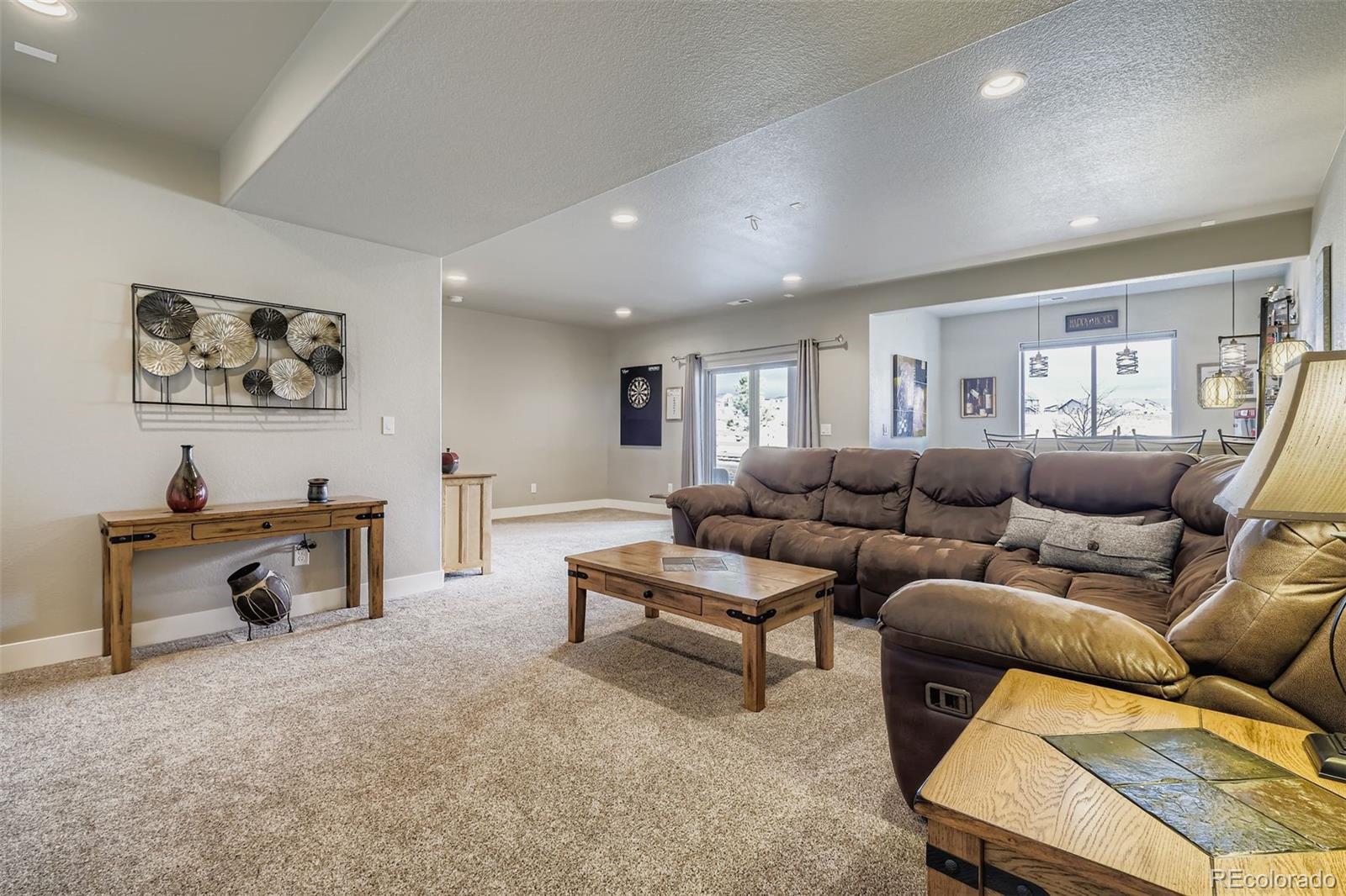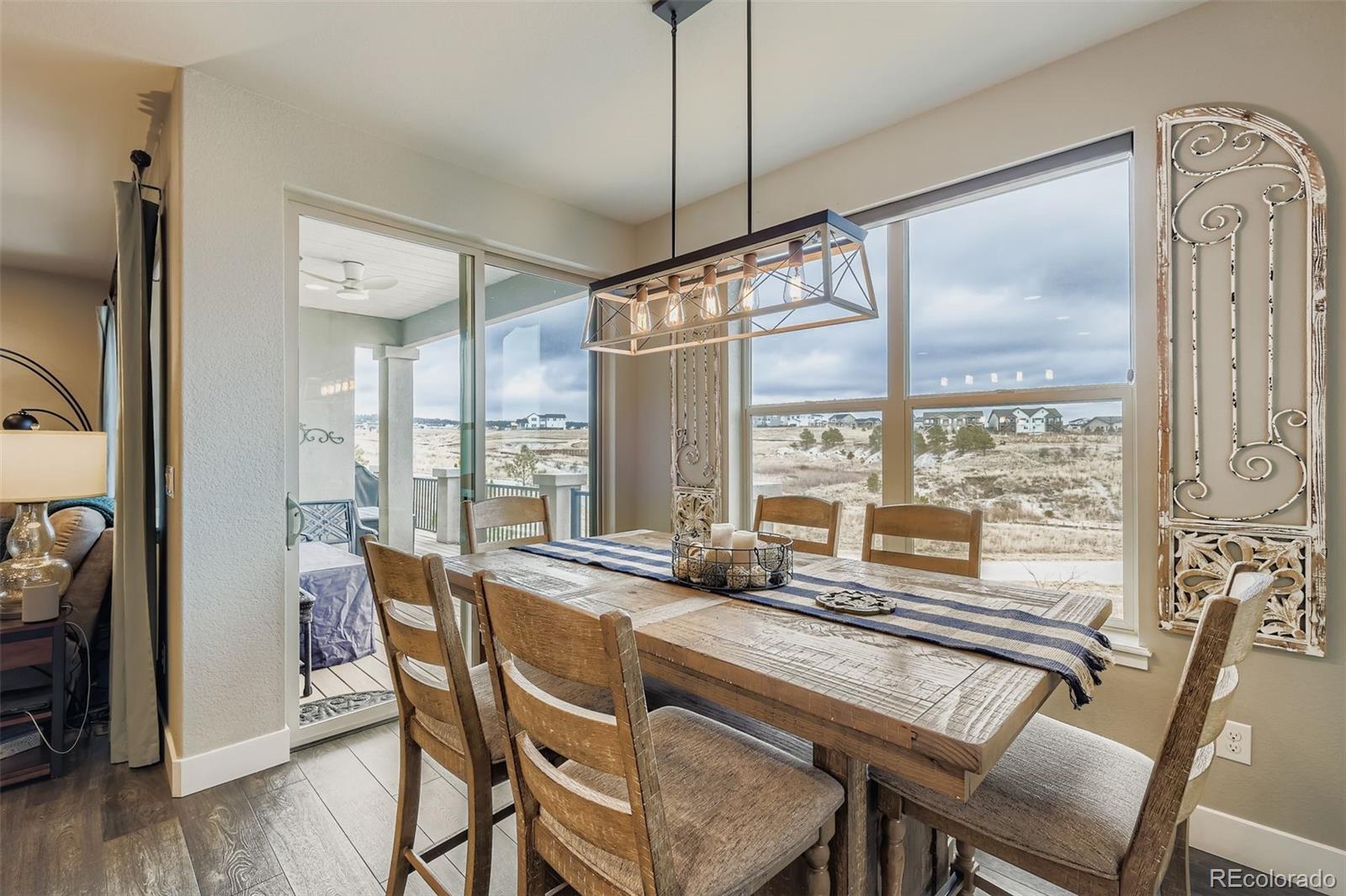 Welcome to the luxurious Legends at Wolf Ranch ranch styled maintenence-free home. A must-see end unit patio home! The spacious living room is anchored by a stone gas fireplace with a wooden mantle. This living space flows into the gorgeously.appointed kitchen equipped with solid counter surfaces, KitchenAid stainless steel appliances, a large gas range with an open statement hood, in wall microwave and oven, backsplash, large island, and a walk-in pantry. Adjacent to the kitchen a spacious and bright dining area awaits as your perfect for hosting dinner parties or BBQs, with easy access to the deck through the sliding glass door, a fantastic space for entertainment or relaxation oer the open. The low-maintenance lifestyle is ensured with the maintaining of all community grounds, and community pool, trails, and lake. The main level also offers your primary retreat with on-suite and large walk-in closet. The bathroom features solid countertops, roomy vanity with double.sinks and mirrors with a large walk-in shower. The office comes with built-ins and stunning mountiaim views, and a spaciois powder room is nestled.nearby. Iron railed staircase down to the basement to find an expansive family room with a perfect wet bar for gatherings or movie nights, wired for overhead projection. There are two additional basement bedrooms and a spacioisly designed bathroom offering an ideal space for children or guests. Adding to its appeal, this home is located in the highly sought-after award winning D-20 School District. Nothing but the most excellent amenities. Enjoy a clubhouse, pool, splash park, 398 acres of planned parks/open spaces, lake for paddle boarding and open views, a location w/ miles and miles of paved trails. Special in every way... this immaculate home is ready now! Again, the Rocky Mountain Views, Mutli-colored sunrises and sunsets are spectacular from this sparkling and spotless home with walkout basement, open space and culdesac location