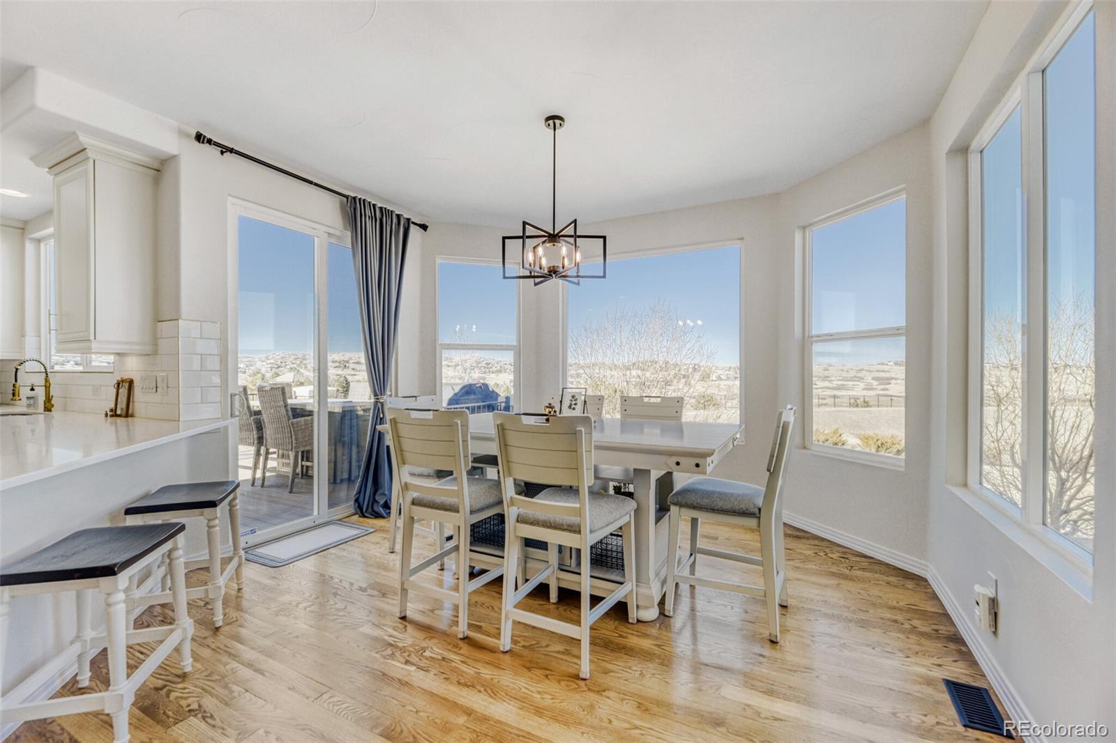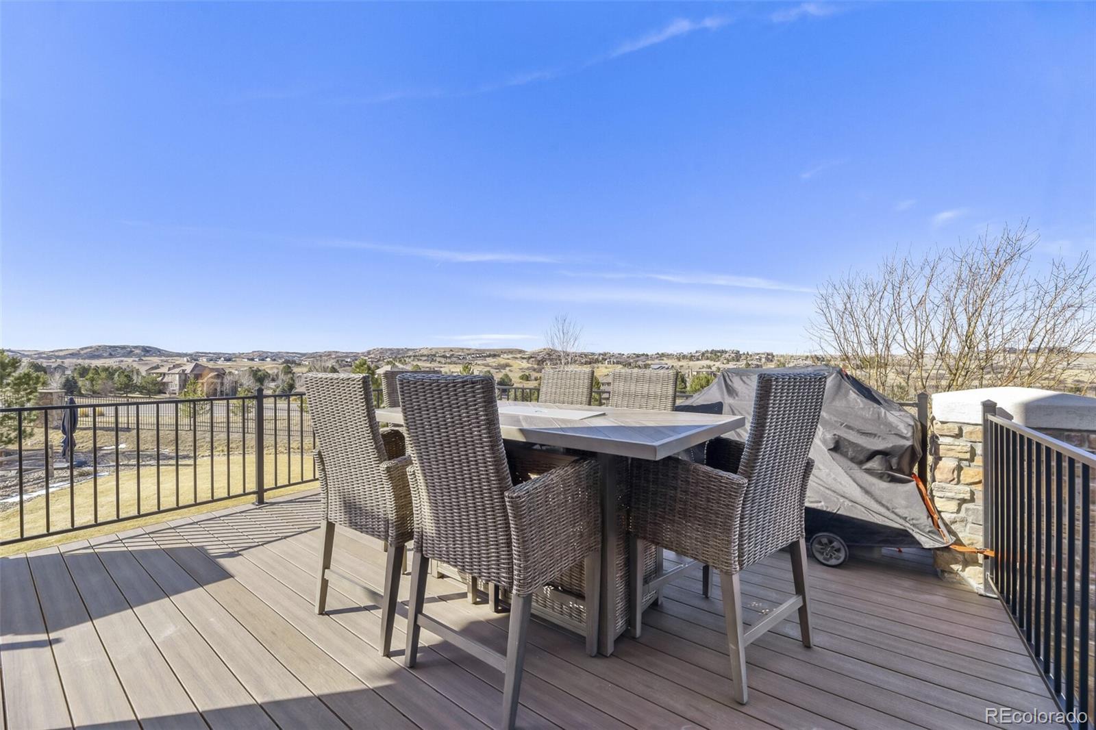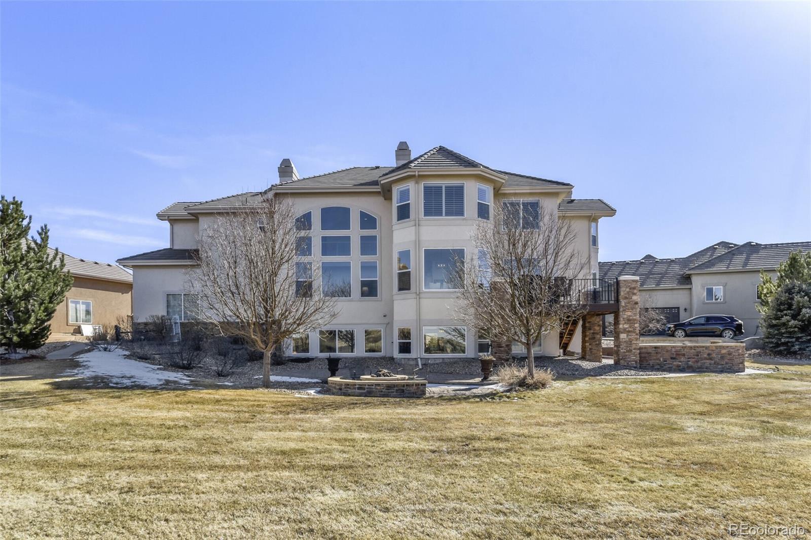 Welcome to this beautifully updated 6-bedroom, 7-bath estate in the quiet, gated community of Vistancia, perfectly positioned between Parker and Castle Rock. This stunning home offers an inviting open floor plan filled with natural light—perfect for both relaxed living and effortless entertaining. The expansive great room with gas fireplace flows seamlessly into the breakfast area and the updated gourmet kitchen, showcasing new quartz countertops, a stylish backsplash, freshly painted cabinets, upgraded fixtures and hardware, elegant lighting, and a premium stainless appliance package. New carpet and professional interior paint throughout create a fresh, modern feel. Upstairs, generous bedrooms each include a walk-in closet and full bath, providing comfort and flexibility for family and guests. The luxurious primary suite offers a cozy fireplace and ample space to unwind. The finished basement is an entertainer’s dream, complete with a wet bar, home theater, game or lounge area, and two additional bedrooms—each with an en suite bath, including a spacious guest suite—perfect for visitors or multi-generational living. Car enthusiasts and hobbyists alike will appreciate the oversized 4-car garage with a built-in loft for extra storage, providing plenty of room for vehicles, gear, and projects. Outdoors, the spacious yard backs to open space and features a new deck, fire pit, and upgraded irrigation system—an ideal setting for gatherings or quiet evenings under the stars. Enjoy direct access to neighborhood amenities and the nearby Cherry Creek Trail, plus close proximity to The Club at Pradera, The Pinery Country Club, and Colorado Golf Club—offering 63 holes of championship golf, three clubhouses, and tennis facilities. Just minutes from downtown Parker, this exceptional home blends privacy, elegance, and convenience. Suburban luxury meets Colorado charm in an incredible place to call home.