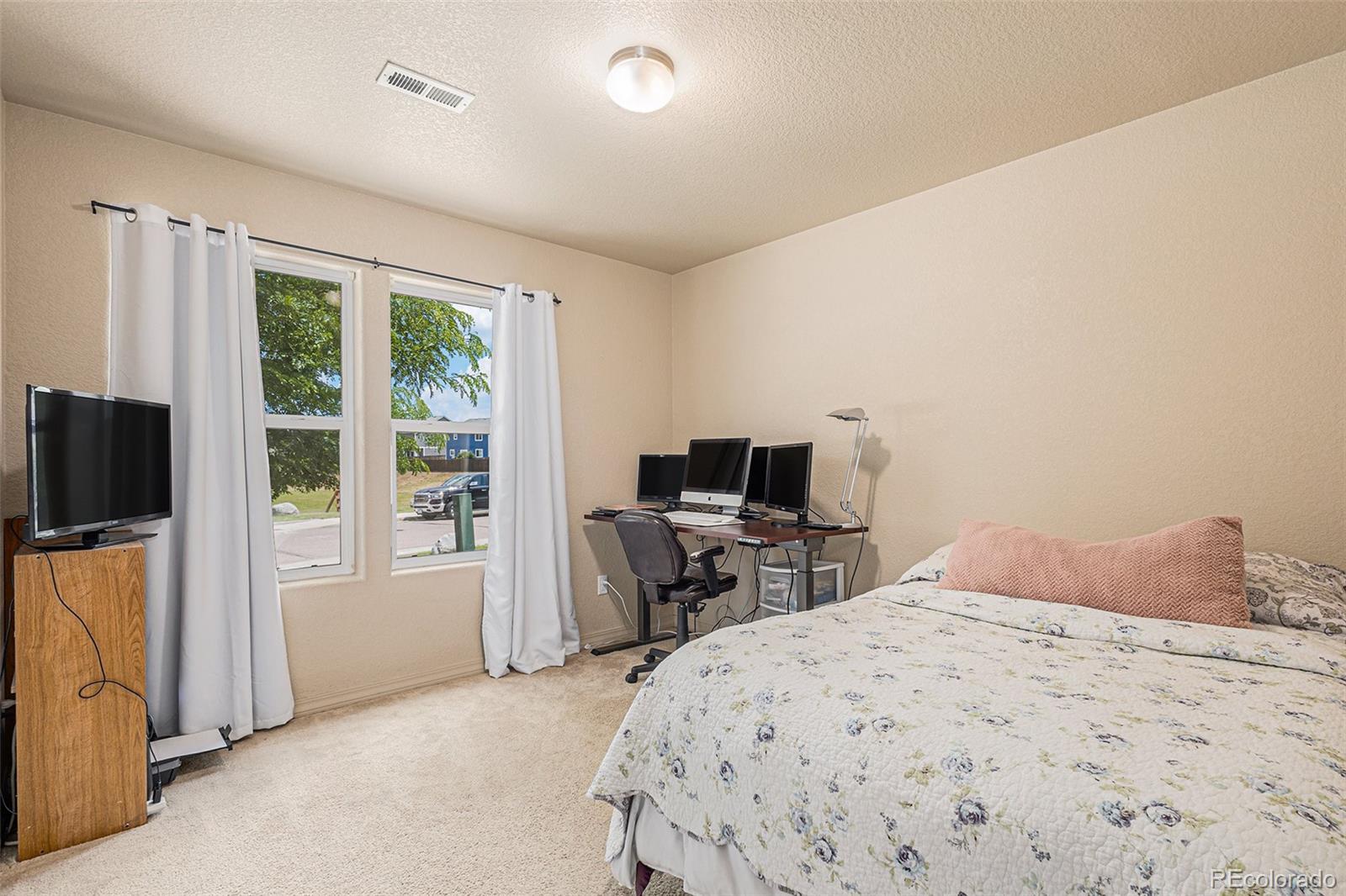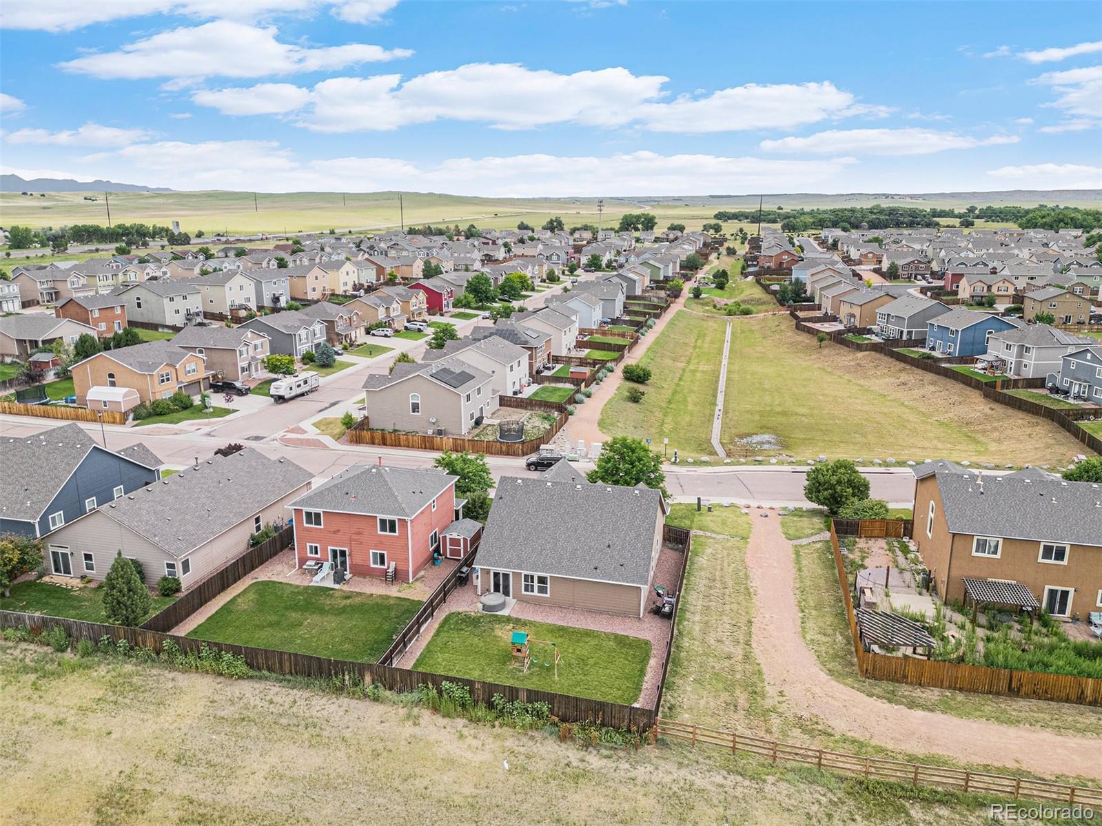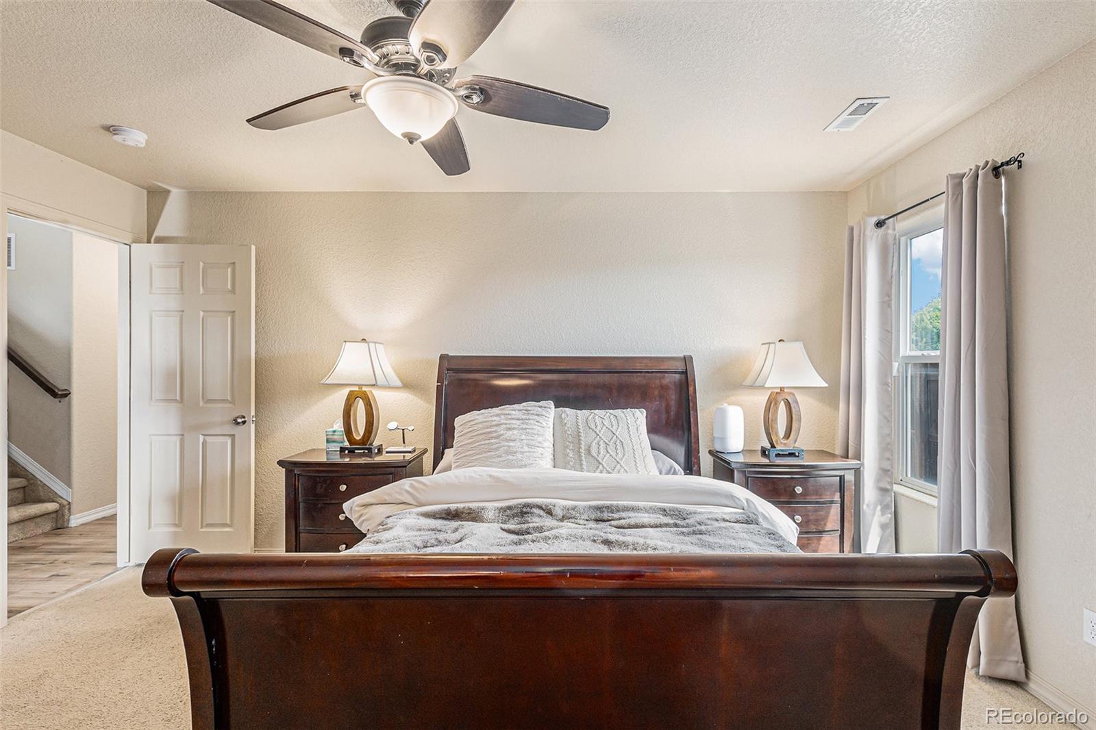 Welcome to 9455 Sand Myrtle Drive – where comfort meets captivating mountain views! Tucked away in a peaceful neighborhood, this beautifully cared-for 3-bedroom, 2-bathroom gem offers space, style, and a smart layout designed for modern living. Step inside to soaring ceilings, a bright open floor plan, and luxury vinyl plank flooring that flows through a spacious family room with vaulted ceilings and a lighted ceiling fan perfect for relaxing or entertaining. The kitchen is a true heart of the home, featuring abundant cabinetry, durable laminate countertops, and sleek black appliances—all included! Yes, that means refrigerator, electric range, microwave, dishwasher, and disposal are ready to go. On the main level, you'll find two cozy carpeted bedrooms with double-door closets, a full tiled bathroom, and an oversized primary suite with a walk-in closet, private en suite, and ceiling fan. Upstairs, the versatile loft has been transformed into a spacious third bedroom with its own walk-in closet—ideal for guests, a home office, or whatever your lifestyle needs. Enjoy thoughtful extras like a dedicated laundry/mudroom with tile floors, built-in shelving, and washer and dryer included. The fully insulated, drywalled 2-car garage comes with an automatic opener, and the home is equipped with central A/C, gas furnace, composition roof, and an alarm system for peace of mind. Step outside to your fully fenced, level backyard that backs and sides to open green space, offering serene views of Pikes Peak. With a covered front porch, front and rear sprinklers, and low-maintenance cement and stone siding, this home is move-in ready and built to impress. All this just steps from a neighborhood park and green space, and within easy reach of Peterson and Schriever Space Force Bases. This home offers it all!