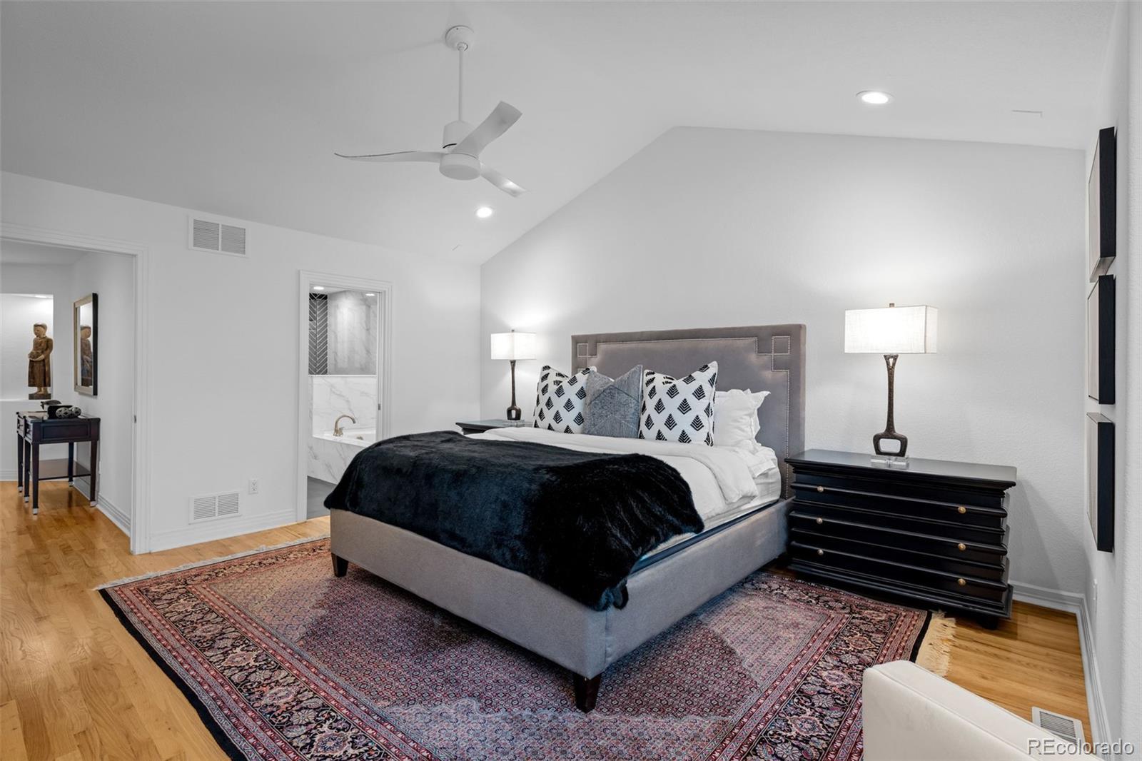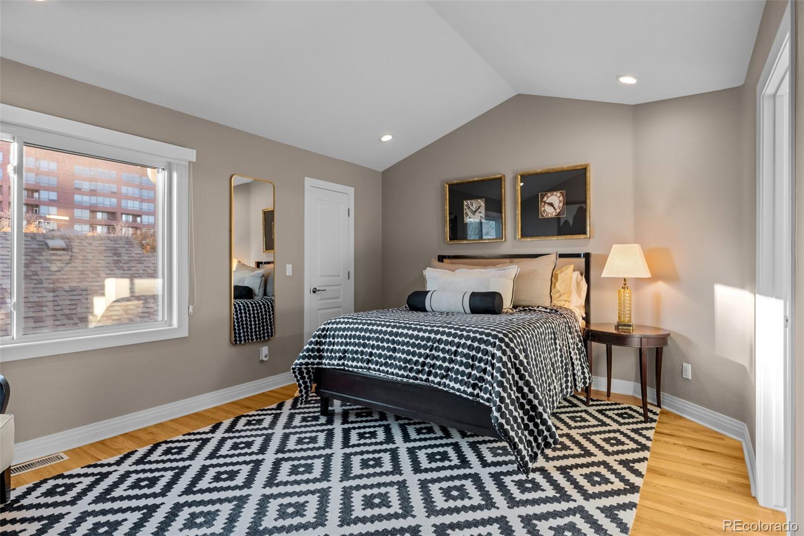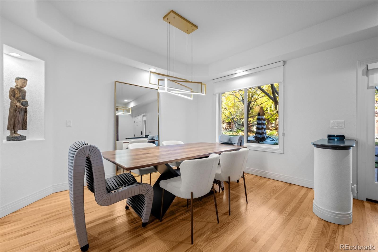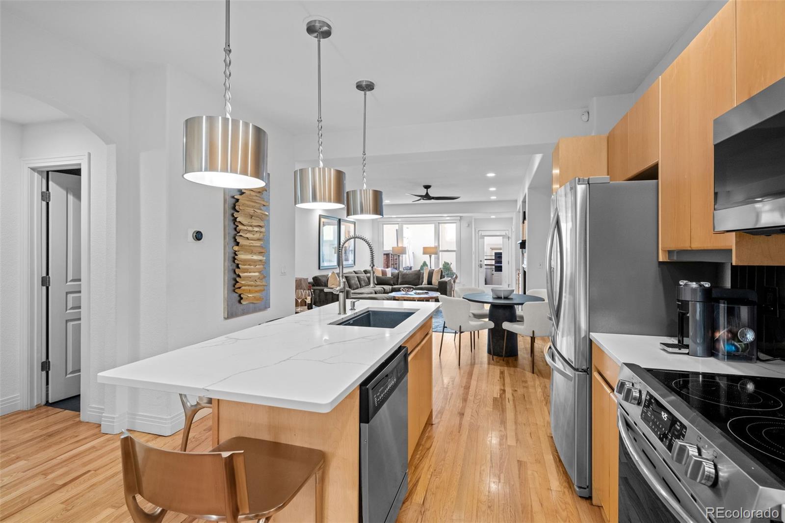 Located in the highly sought-after Cherry Creek neighborhood, this beautifully updated 3-bedroom, 3.5-bath townhome blends timeless charm with modern elegance. The main level features refinished hardwood floors, a modernized kitchen with LED lighting and stylish finishes, and a spacious living room centered around a cozy fireplace. Enjoy both front and back outdoor patios—perfect for entertaining or dining al fresco. Upstairs, the primary suite offers vaulted ceilings and a luxurious five-piece bath with a custom herringbone-tile shower, frameless glass, and quartz counters. A secondary bedroom and full bath complete the upper level. The finished basement includes a bedroom, full bath, wet bar, and a generous flex area—ideal for a media room, gym, or home office. Additional upgrades include new energy-efficient windows, custom Three Day Blinds, fresh interior paint, and a smart lighting system throughout the home that provides customizable ambiance and improved energy efficiency.