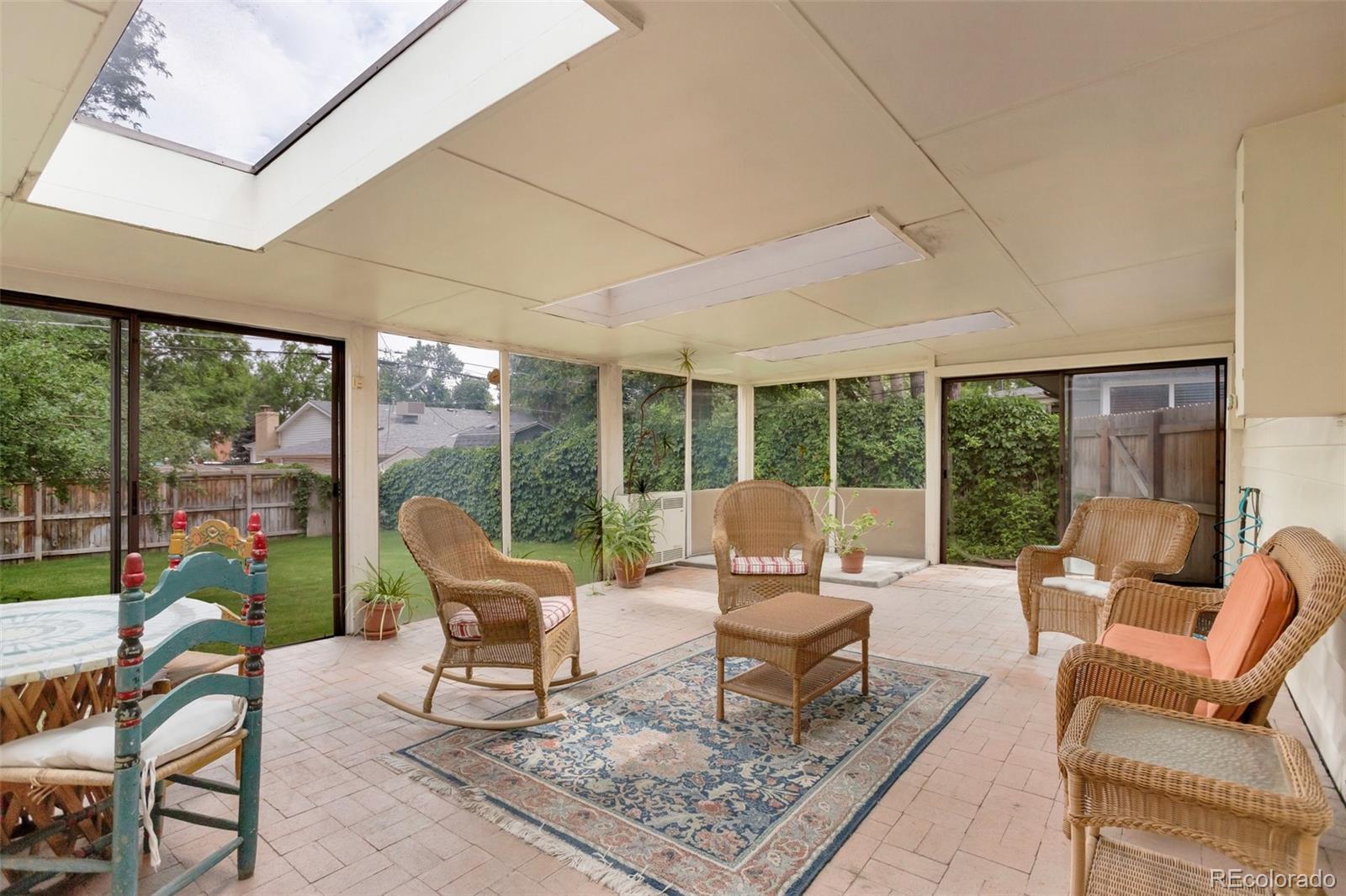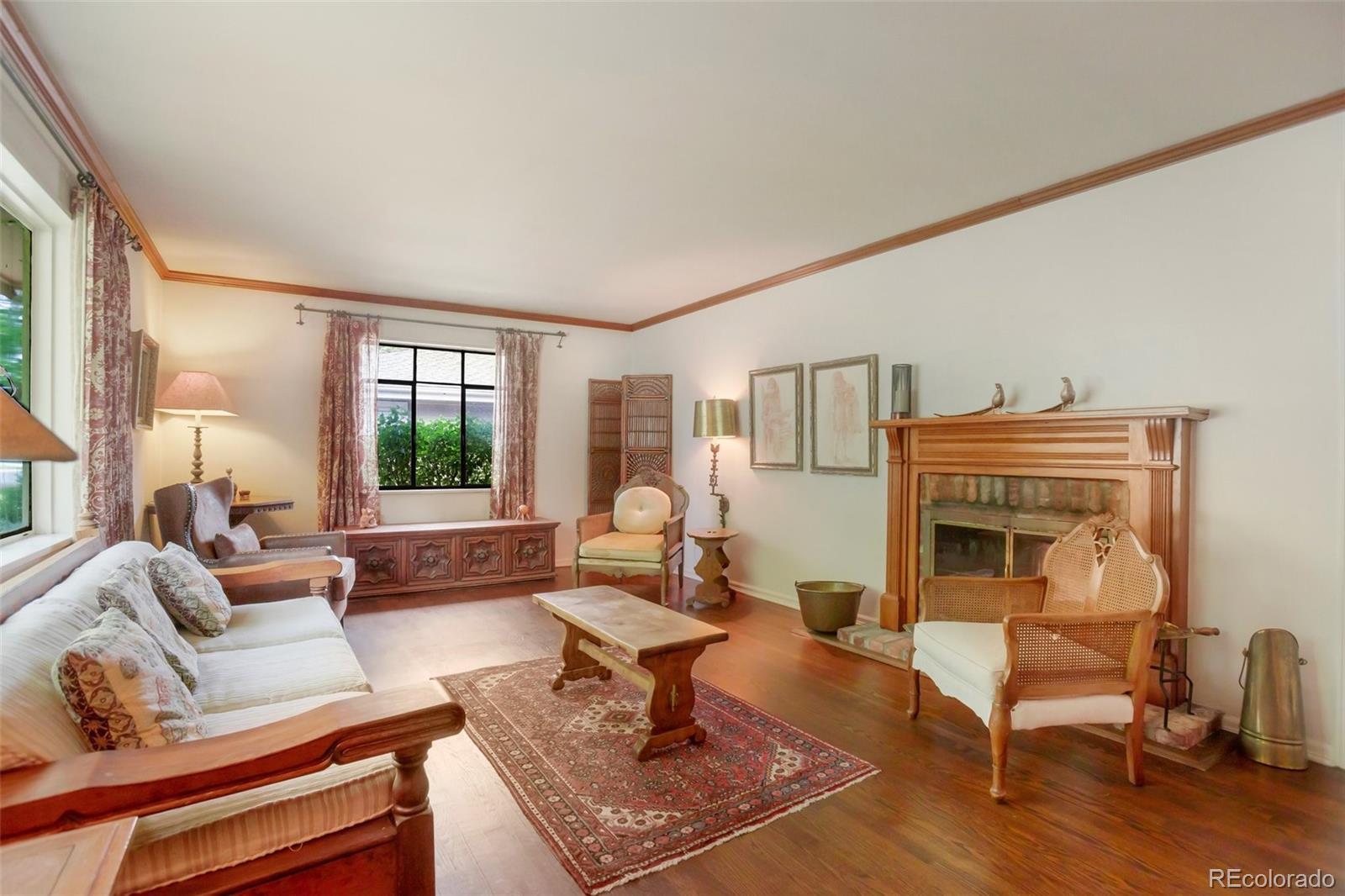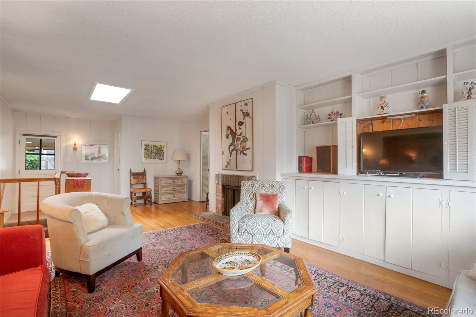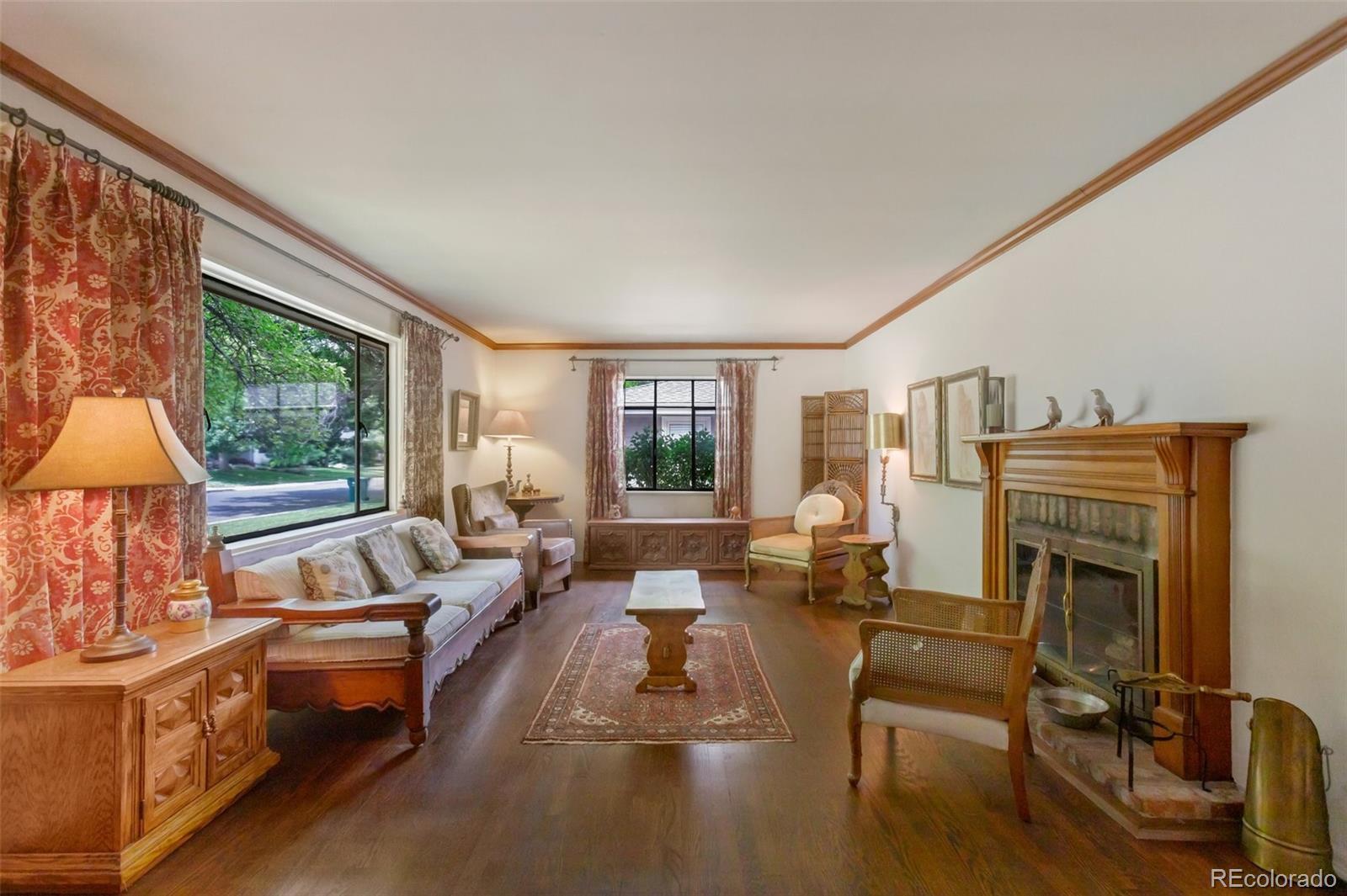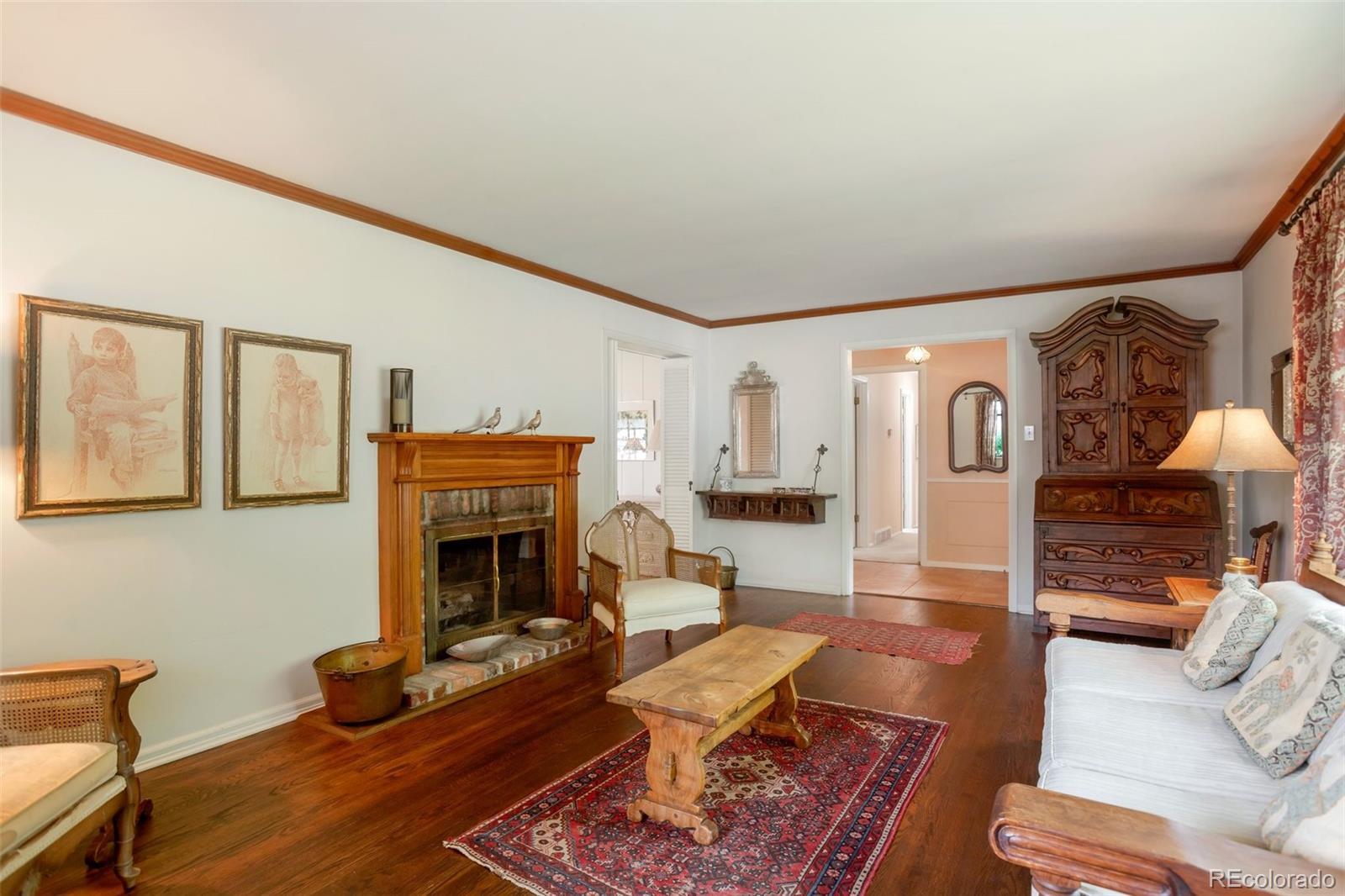 This home is a rare gem—expanded and remodeled with design touches inspired by far-flung places. You’ll step into a welcoming living room anchored by beautiful oak floors and a grand double-sided gas fireplace. Imagine holiday stockings draped from its elegant mantel—this is where memories are waiting to be made. The family room features the same fireplace, visible from the nearby dining room. The dining room itself is made for gatherings: custom wall sconces, a stamped metal-tiled ceiling, and arched wooden doors opening into the kitchen. It’s a warm, stunning space built for entertaining. The spacious front bedroom includes a built-in office area. Originally two separate bedrooms, it was combined years ago into one large suite—but could easily be converted back into two rooms if needed. The primary bedroom in back has an expanded ¾ bathroom with a bidet. Convenience meets functionality with a main-floor laundry room located near both the bedrooms and the kitchen, with plenty of storage space. Downstairs, the basement provides more flexibility: there’s a study / rec room / bonus area plus a fully conforming bedroom featuring two egress windows—a rare find for a home of this era. The basement bathroom is beautifully tiled in blue, and there’s a large storage room with two above-ground windows (note: part of the basement extends beneath the garage—check the floor plan for more detail). Relax year-round in the heated sunroom. Facing north, it remains comfortably cool in summer, offering serene views of the lush, peaceful backyard. There’s also a pad with hookups ready for a hot tub! Location is superb. You’re within walking distance of a King Soopers, several restaurants, ice cream, a bank, shopping, and a lovely park with tennis/pickleball courts. And the public schools are outstanding: Cherry Hills Village Elementary, West Middle, and Cherry Creek High School.