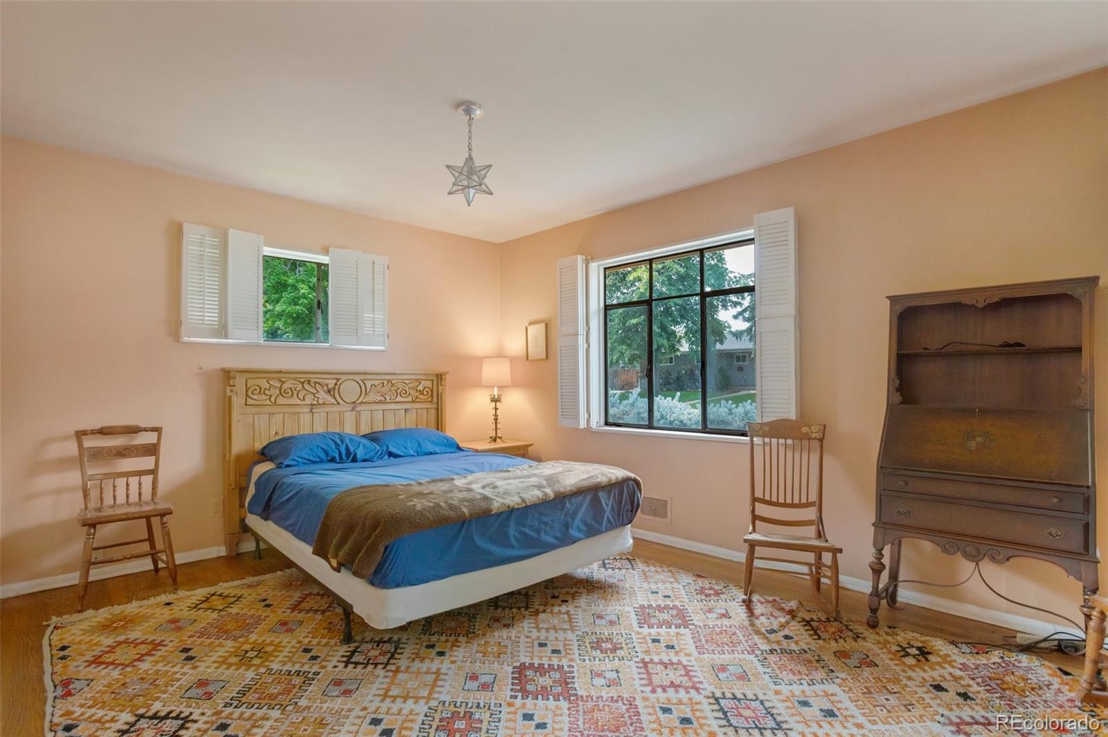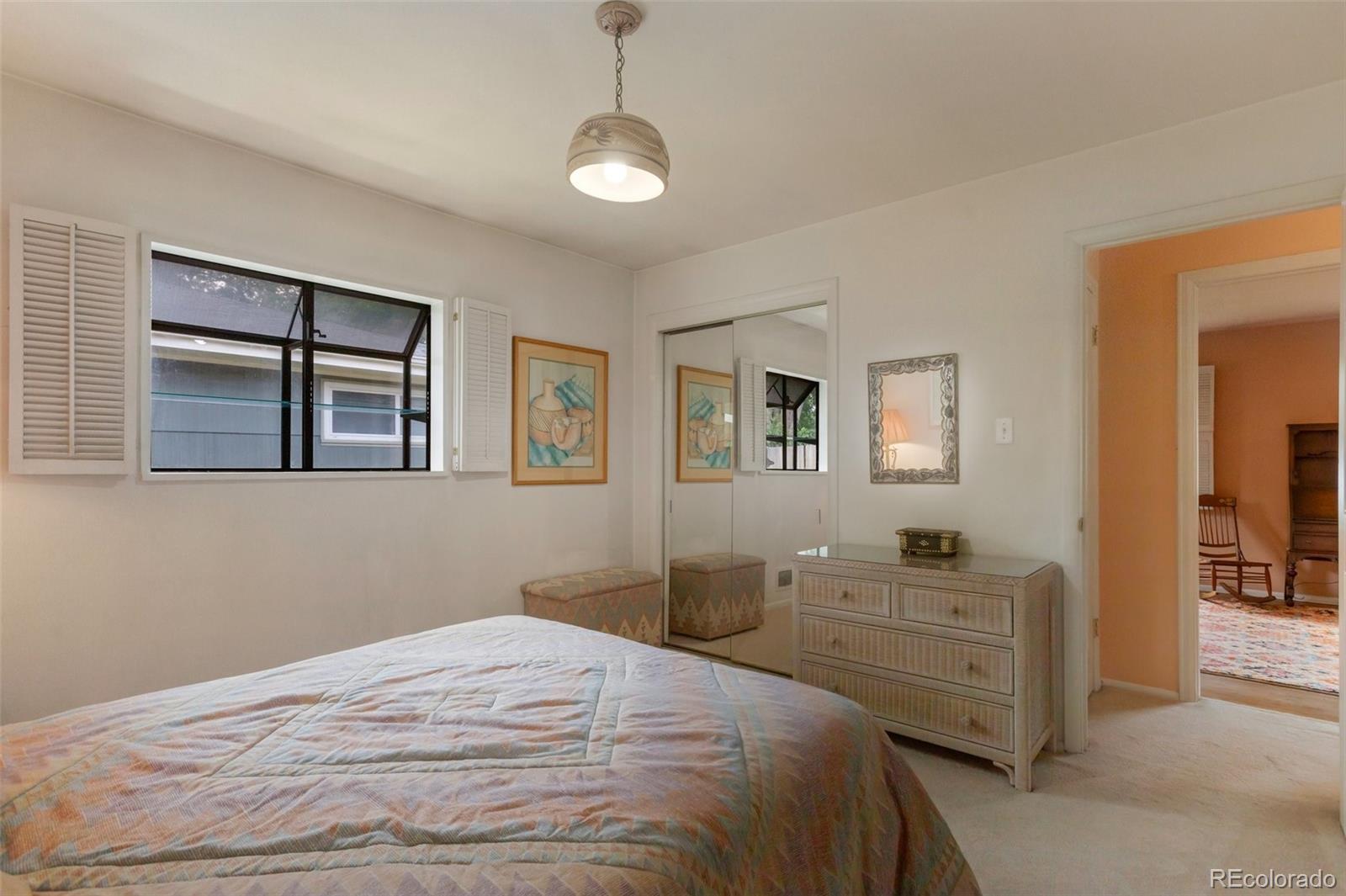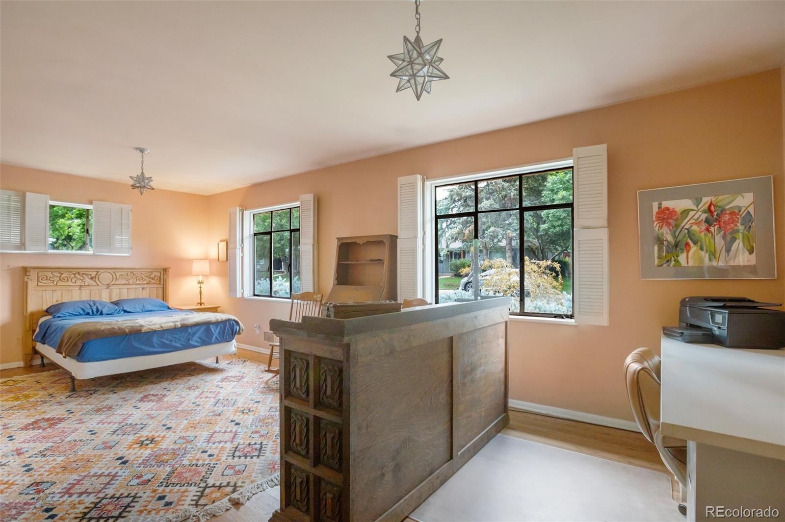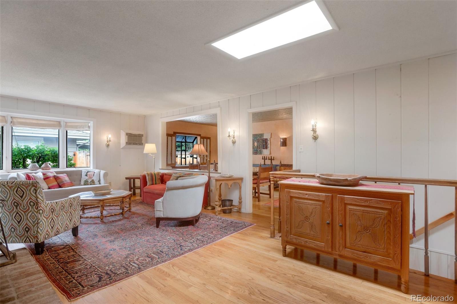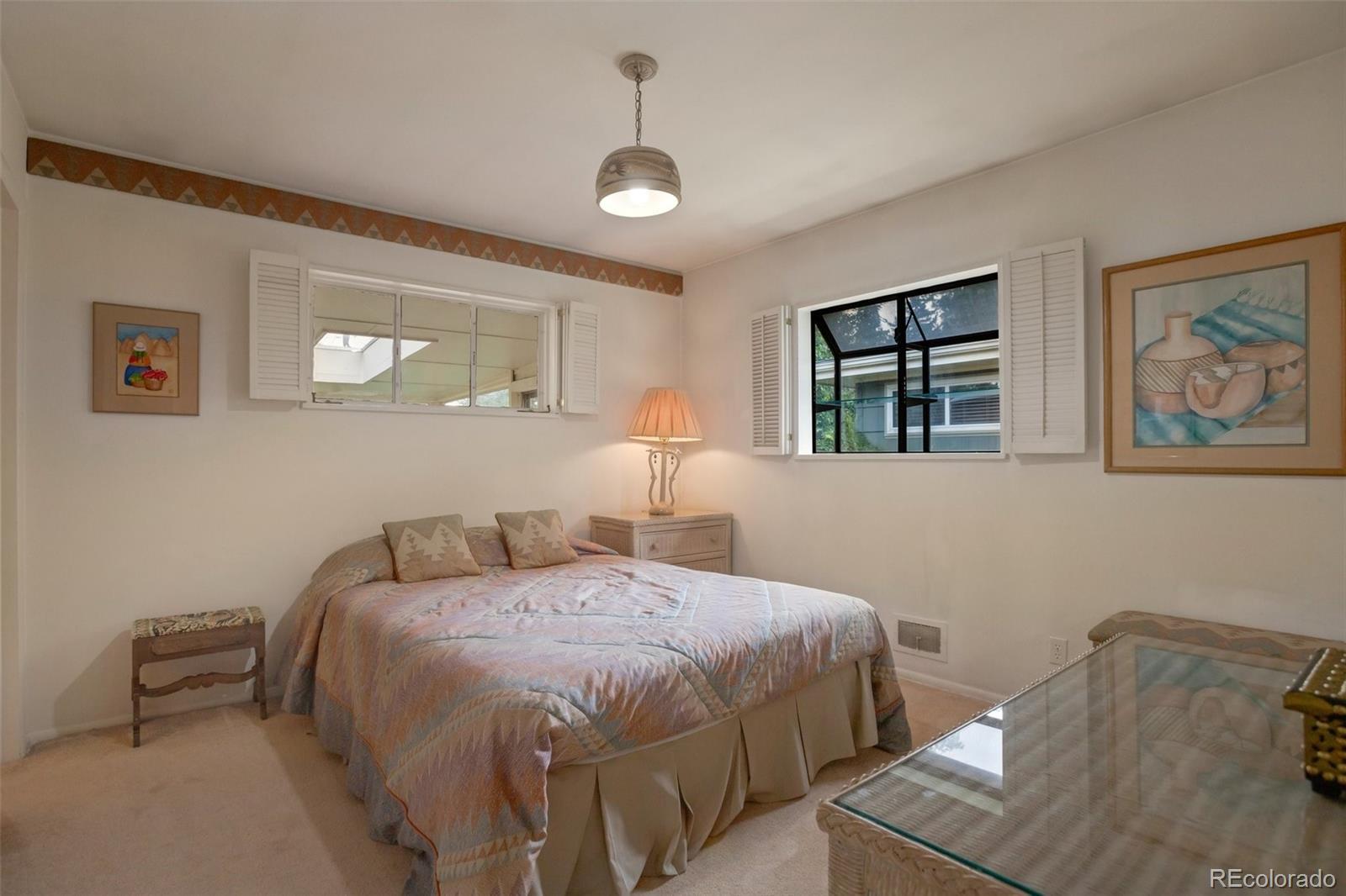 This home is a rare gem—expanded and remodeled with design touches inspired by far-flung places. You’ll step into a welcoming living room anchored by beautiful oak floors and a grand double-sided gas fireplace. Imagine holiday stockings draped from its elegant mantel—this is where memories are waiting to be made. The family room features the same fireplace, visible from the nearby dining room. The dining room itself is made for gatherings: custom wall sconces, a stamped metal-tiled ceiling, and arched wooden doors opening into the kitchen. It’s a warm, stunning space built for entertaining. The spacious front bedroom includes a built-in office area. Originally two separate bedrooms, it was combined years ago into one large suite—but could easily be converted back into two rooms if needed. The primary bedroom in back has an expanded ¾ bathroom with a bidet. Convenience meets functionality with a main-floor laundry room located near both the bedrooms and the kitchen, with plenty of storage space. Downstairs, the basement provides more flexibility: there’s a study / rec room / bonus area plus a fully conforming bedroom featuring two egress windows—a rare find for a home of this era. The basement bathroom is beautifully tiled in blue, and there’s a large storage room with two above-ground windows (note: part of the basement extends beneath the garage—check the floor plan for more detail). Relax year-round in the heated sunroom. Facing north, it remains comfortably cool in summer, offering serene views of the lush, peaceful backyard. There’s also a pad with hookups ready for a hot tub! Location is superb. You’re within walking distance of a King Soopers, several restaurants, ice cream, a bank, shopping, and a lovely park with tennis/pickleball courts. And the public schools are outstanding: Cherry Hills Village Elementary, West Middle, and Cherry Creek High School.