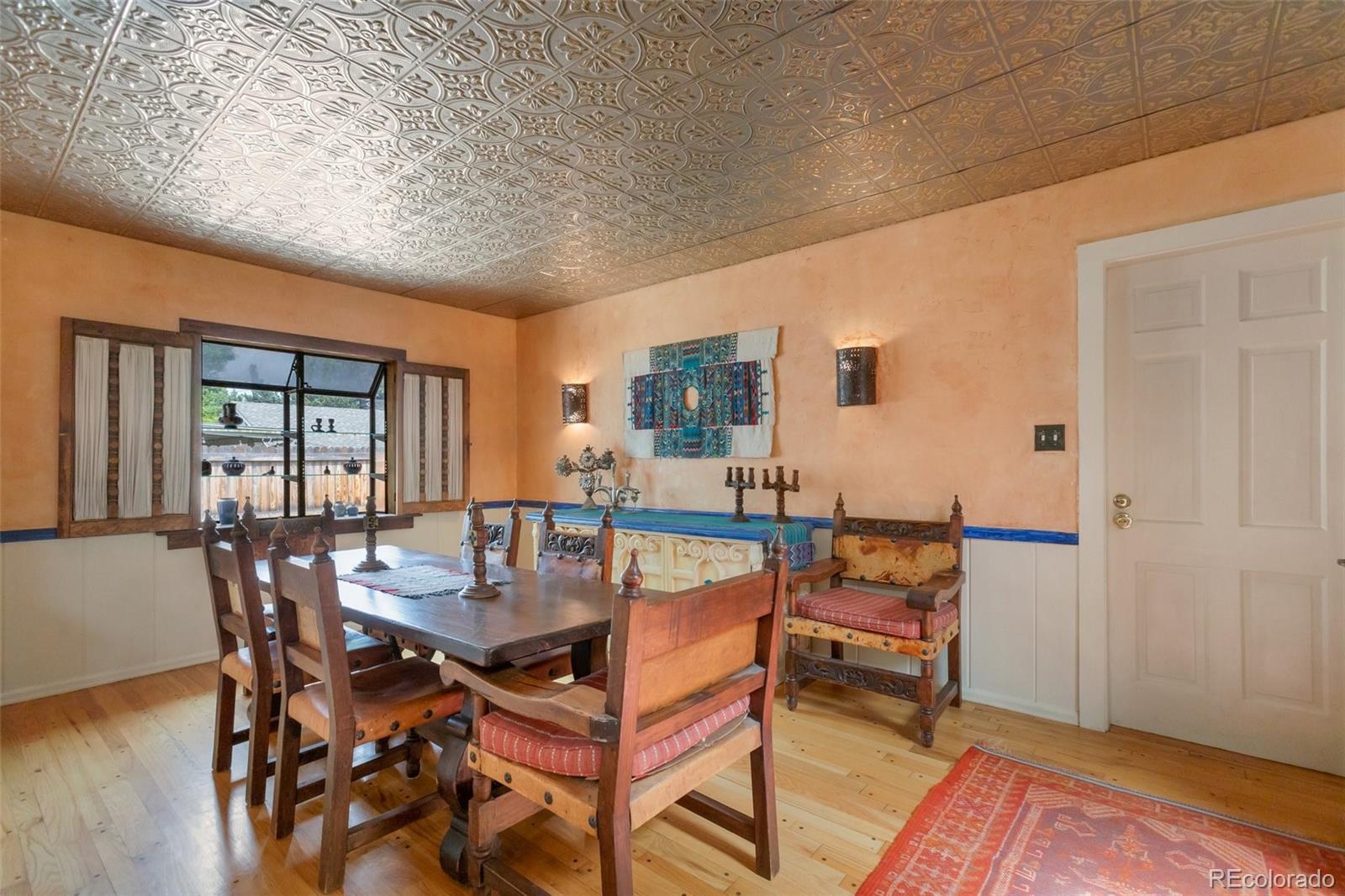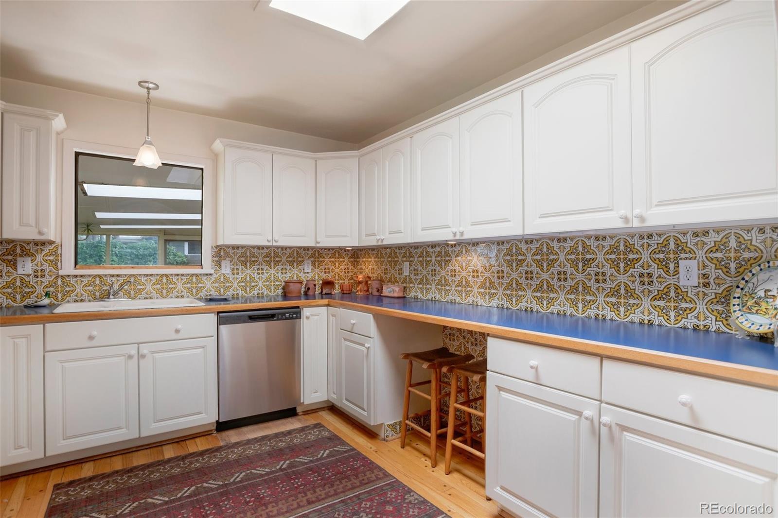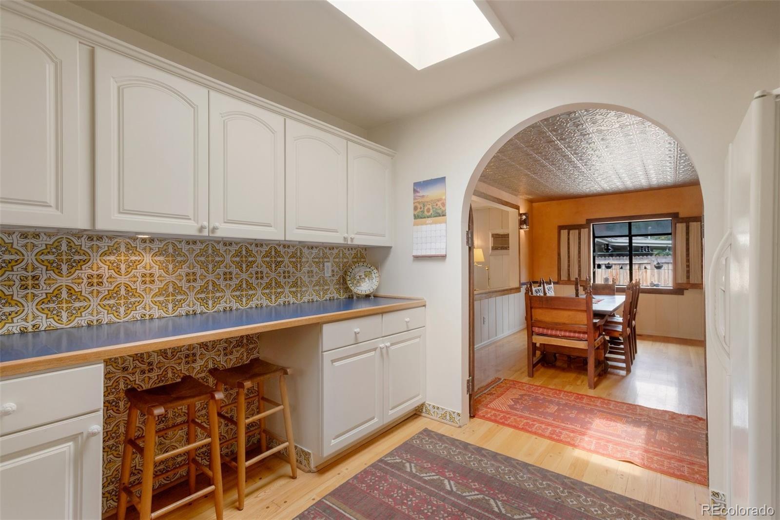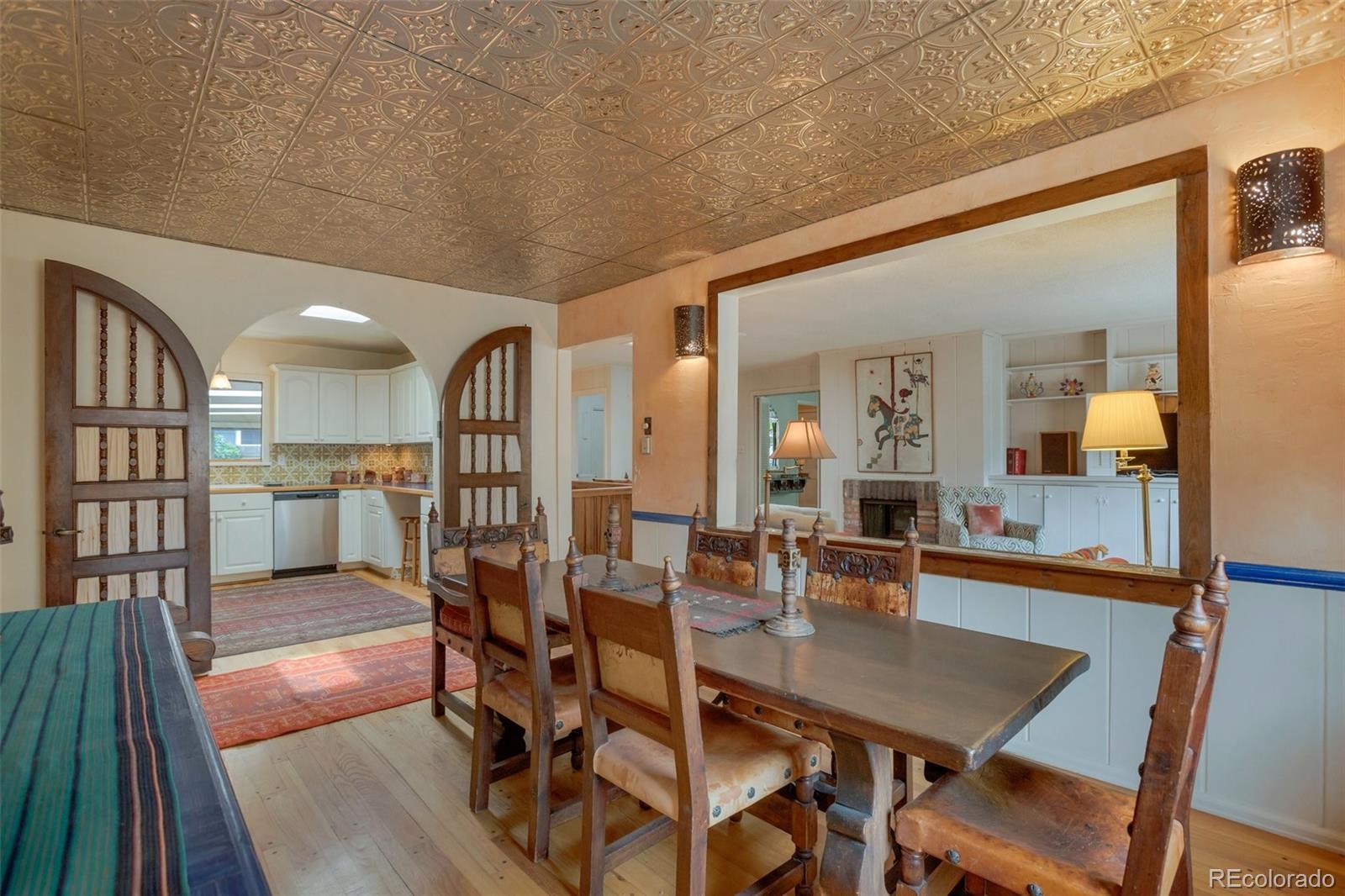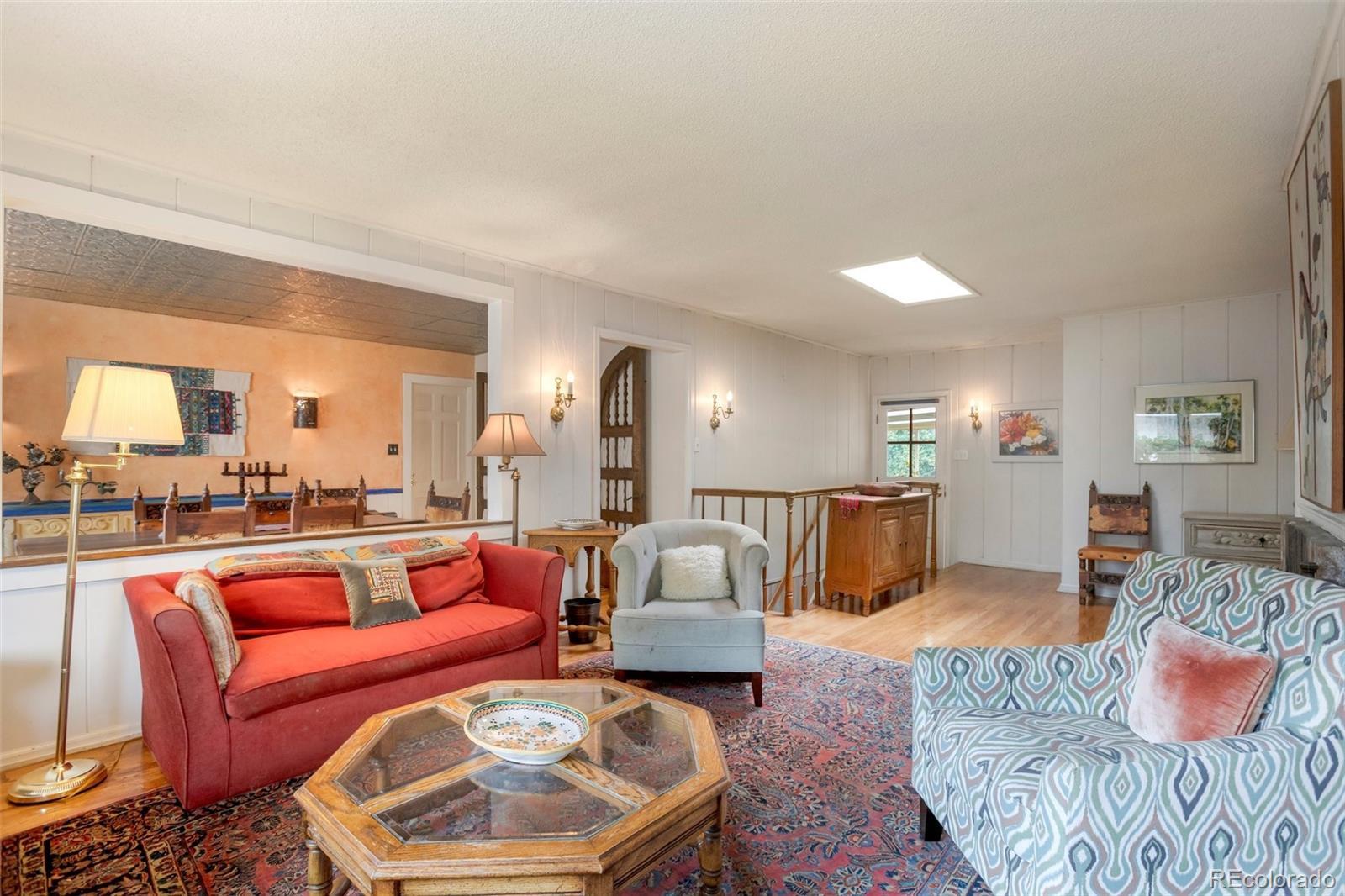 This home is a rare gem—expanded and remodeled with design touches inspired by far-flung places. You’ll step into a welcoming living room anchored by beautiful oak floors and a grand double-sided gas fireplace. Imagine holiday stockings draped from its elegant mantel—this is where memories are waiting to be made. The family room features the same fireplace, visible from the nearby dining room. The dining room itself is made for gatherings: custom wall sconces, a stamped metal-tiled ceiling, and arched wooden doors opening into the kitchen. It’s a warm, stunning space built for entertaining. The spacious front bedroom includes a built-in office area. Originally two separate bedrooms, it was combined years ago into one large suite—but could easily be converted back into two rooms if needed. The primary bedroom in back has an expanded ¾ bathroom with a bidet. Convenience meets functionality with a main-floor laundry room located near both the bedrooms and the kitchen, with plenty of storage space. Downstairs, the basement provides more flexibility: there’s a study / rec room / bonus area plus a fully conforming bedroom featuring two egress windows—a rare find for a home of this era. The basement bathroom is beautifully tiled in blue, and there’s a large storage room with two above-ground windows (note: part of the basement extends beneath the garage—check the floor plan for more detail). Relax year-round in the heated sunroom. Facing north, it remains comfortably cool in summer, offering serene views of the lush, peaceful backyard. There’s also a pad with hookups ready for a hot tub! Location is superb. You’re within walking distance of a King Soopers, several restaurants, ice cream, a bank, shopping, and a lovely park with tennis/pickleball courts. And the public schools are outstanding: Cherry Hills Village Elementary, West Middle, and Cherry Creek High School.