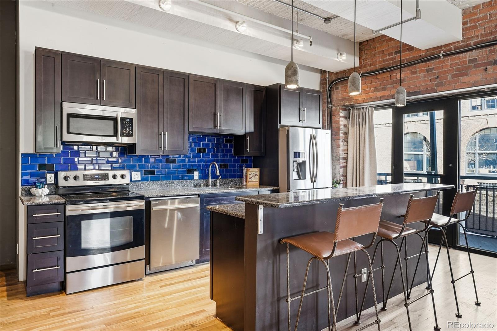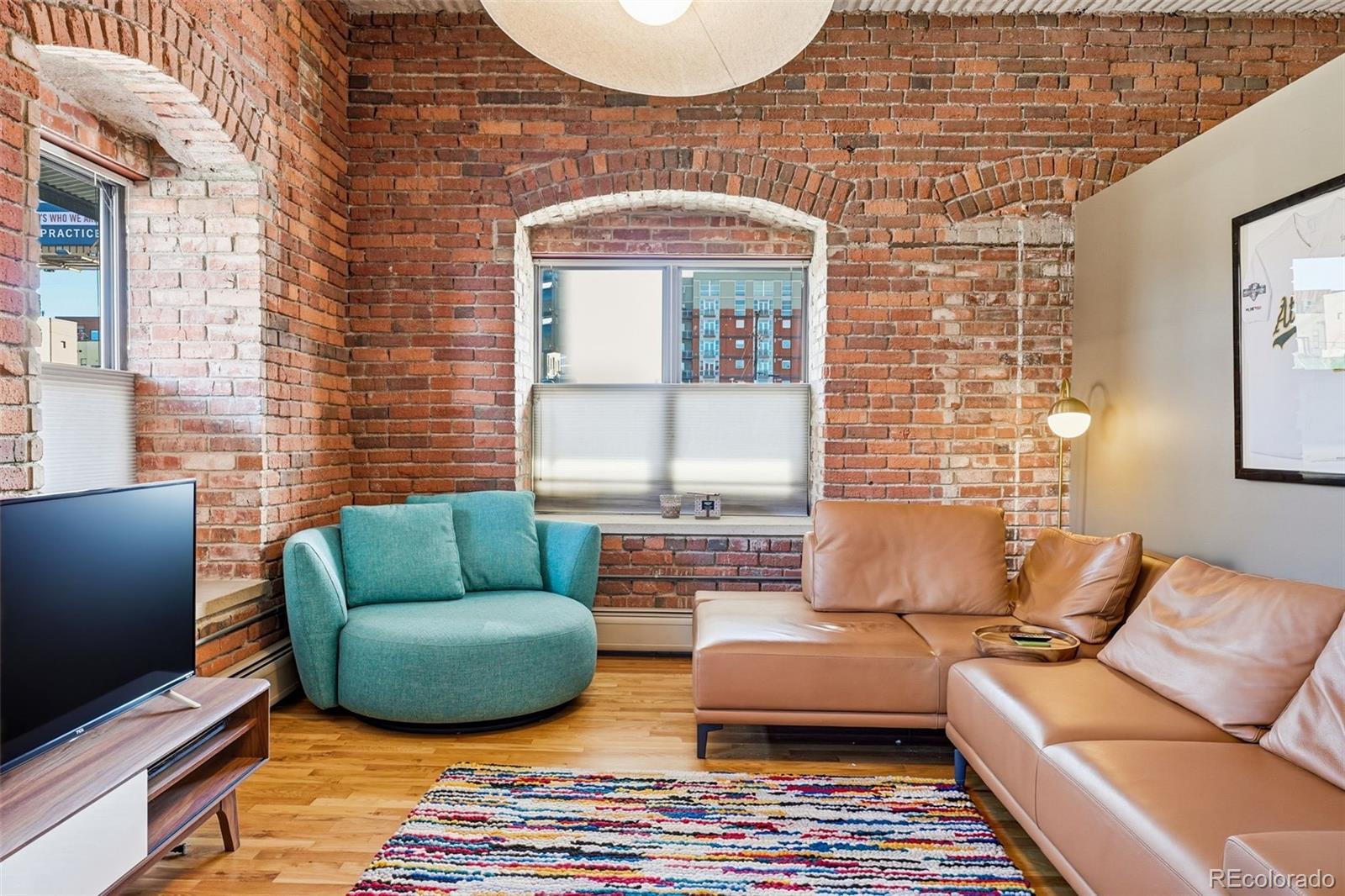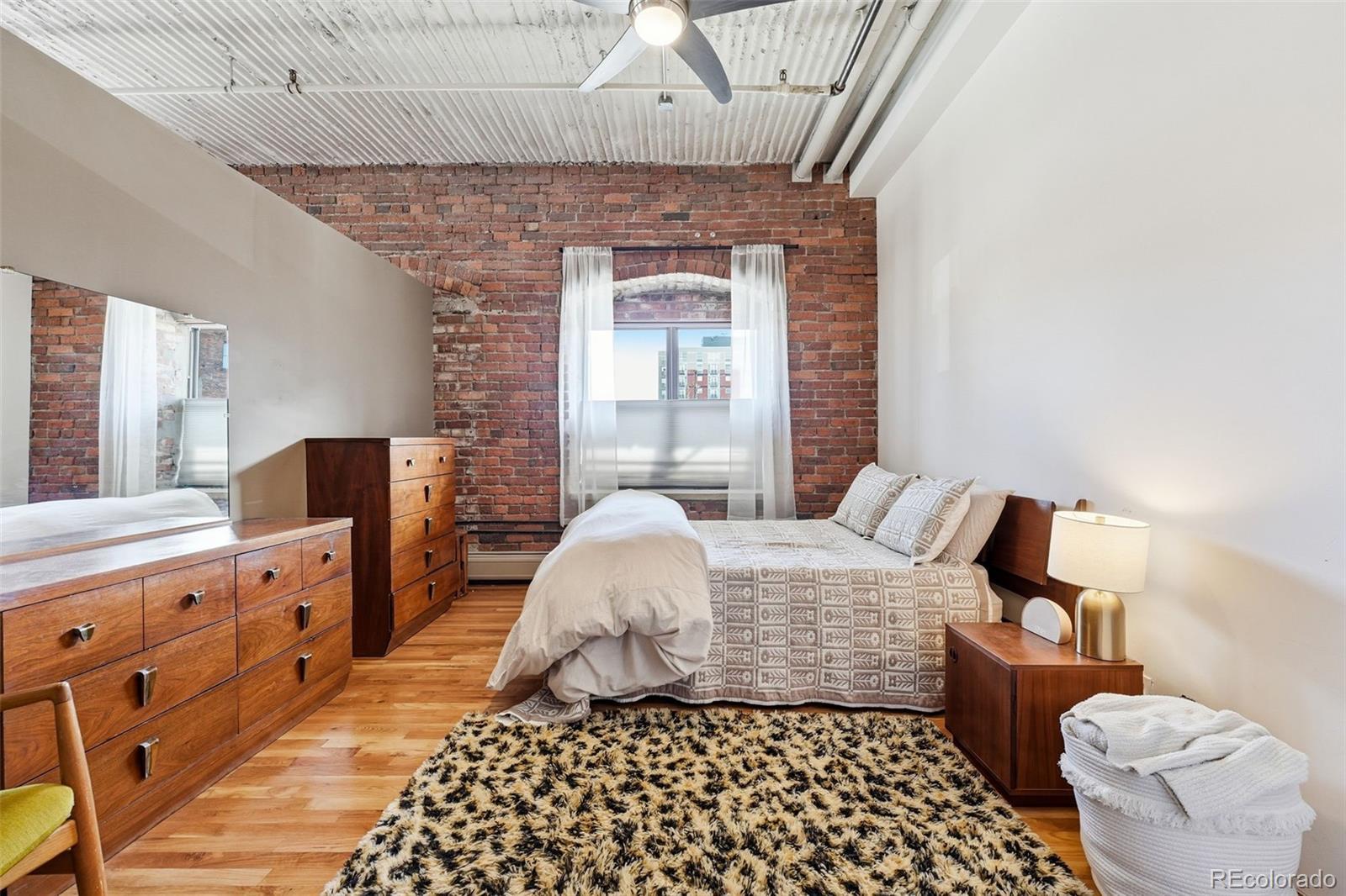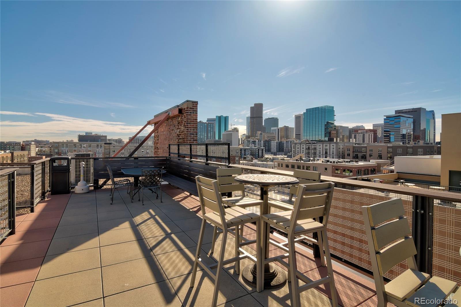 Experience authentic urban living in this vast downtown Denver corner unit condo, thoughtfully converted from a historic industrial warehouse in 1995. This home proudly preserves its original character—tall ceilings, exposed brick walls, arched windows with depth that will make you double-take, and raw concrete accents. An open-concept layout starts with the parallel kitchen counter spaces including stepped kitchen island (perfect for hosting) that are crowned by concrete pendant lights and a dreamy blue backsplash. Drenched in light from the east and south-facing windows lies the dining area, large living room, and bedroom, which is separated from the rest of the house by a partition. Step outside onto your east-facing private patio, perfect for enjoying that Colorado morning sun. If that wasn't enough, the rooftop deck has views of the foothills all the way to the Boulder Flatirons and Longs Peak, the skyline, and most importantly provides the best seat in the house for Rockies fireworks games. Don't miss the deeded parking space + storage unit (in parking garage, #20). If you're looking for downtown living that is close to the action in a building flush with original architectural details that tell the story of a different era, stop looking! Schedule a tour today.