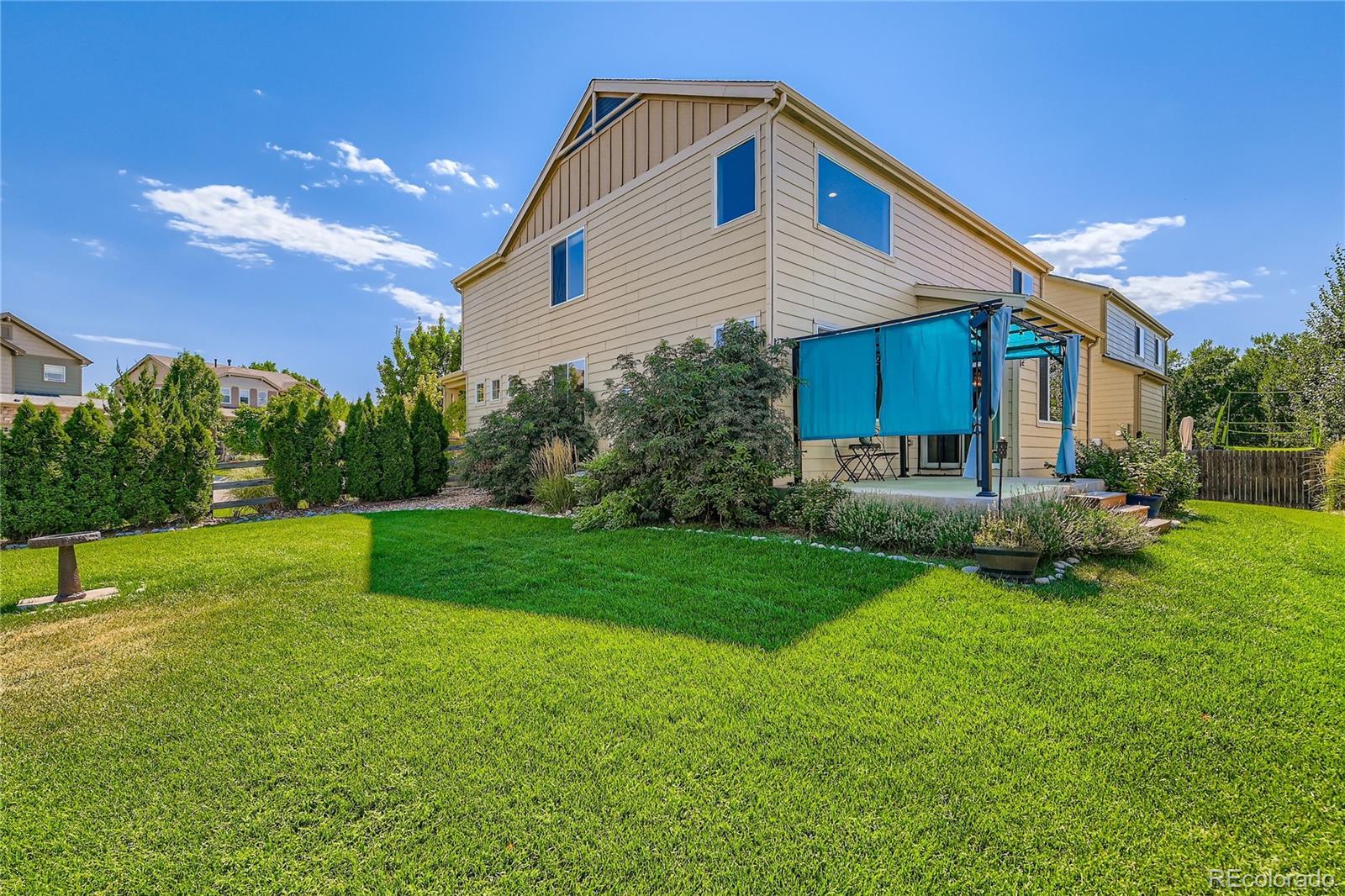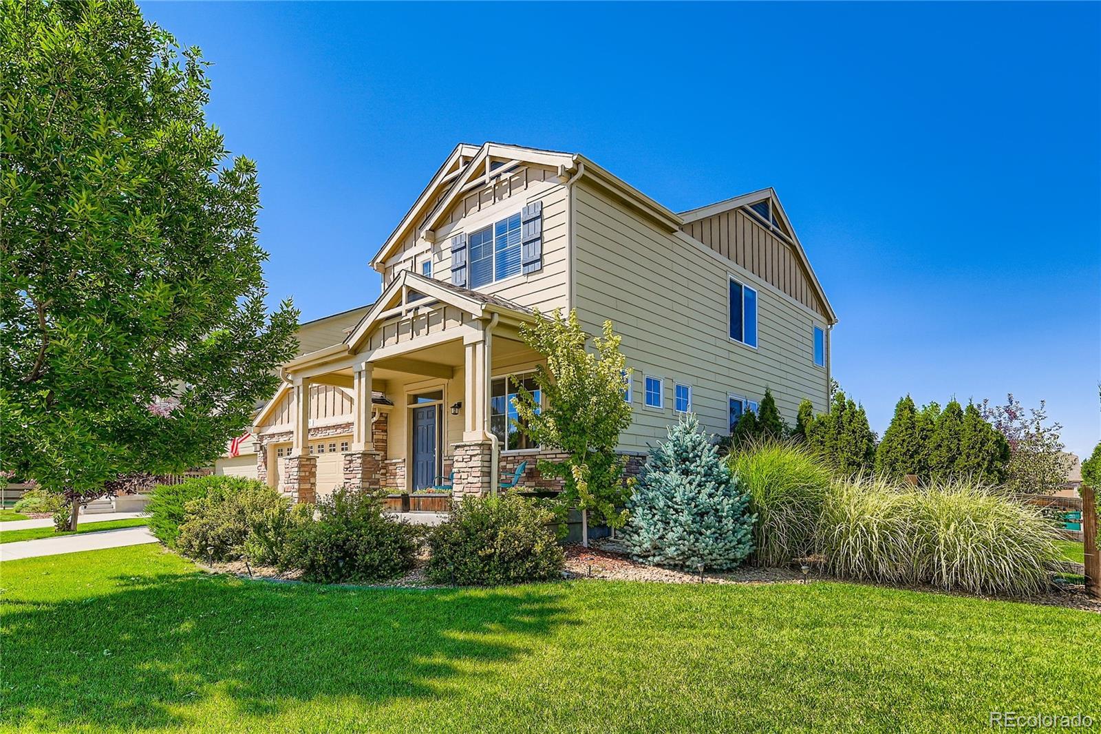 This charming home is located on a quiet cul-de-sac in a highly desirable neighborhood. The large corner lot is filled with gorgeous mature trees and has a southern exposure. Natural light fills the home from the large windows, vaulted ceilings and an open concept floor plan makes this an entertainer's dream! The main level has hardwood floors, a large living room with a gas fireplace, family room and updated light fixtures. Spacious kitchen has beautiful cabinetry, granite countertops, pantry, large island with breakfast bar and stainless steel appliances. Mudroom area provides great storage and a dedicated office space perfect for the remote worker. Convenient 2nd floor laundry. Primary suite offers vaulted ceilings, 5 piece bath and huge walk in closet. Full unfinished basement offers tons of potential for additional living space prepped with two rough-ins. The amazing backyard provides great outdoor living with plenty of room to entertain on the large concrete patio with connected natural gas hookup for your bbq. Low HOA fees and NO metro district. Just minutes from downtown Erie shops and restaurants, schools, parks, and scenic trails, with easy commute access to Boulder, Longmont and Denver.