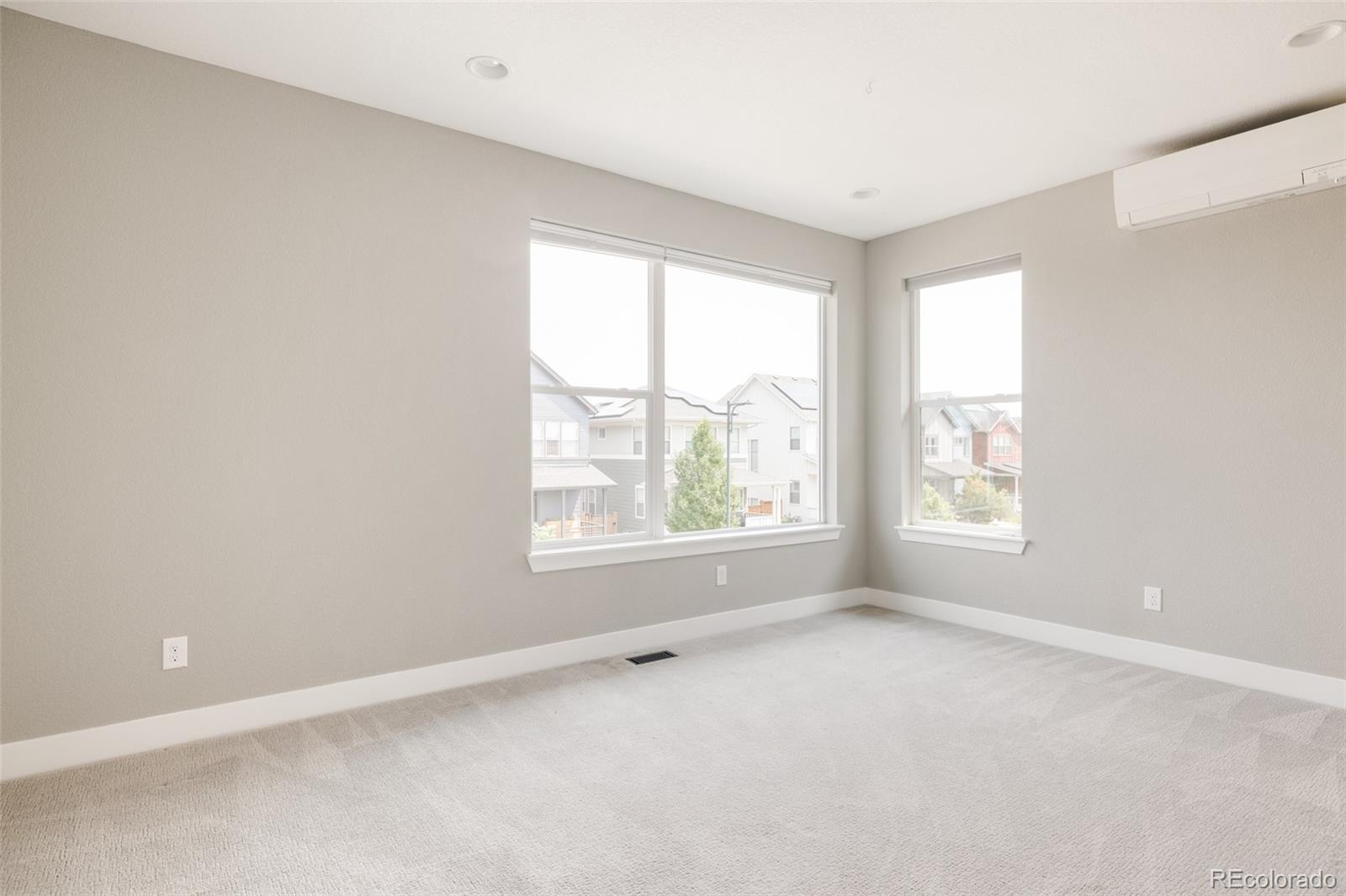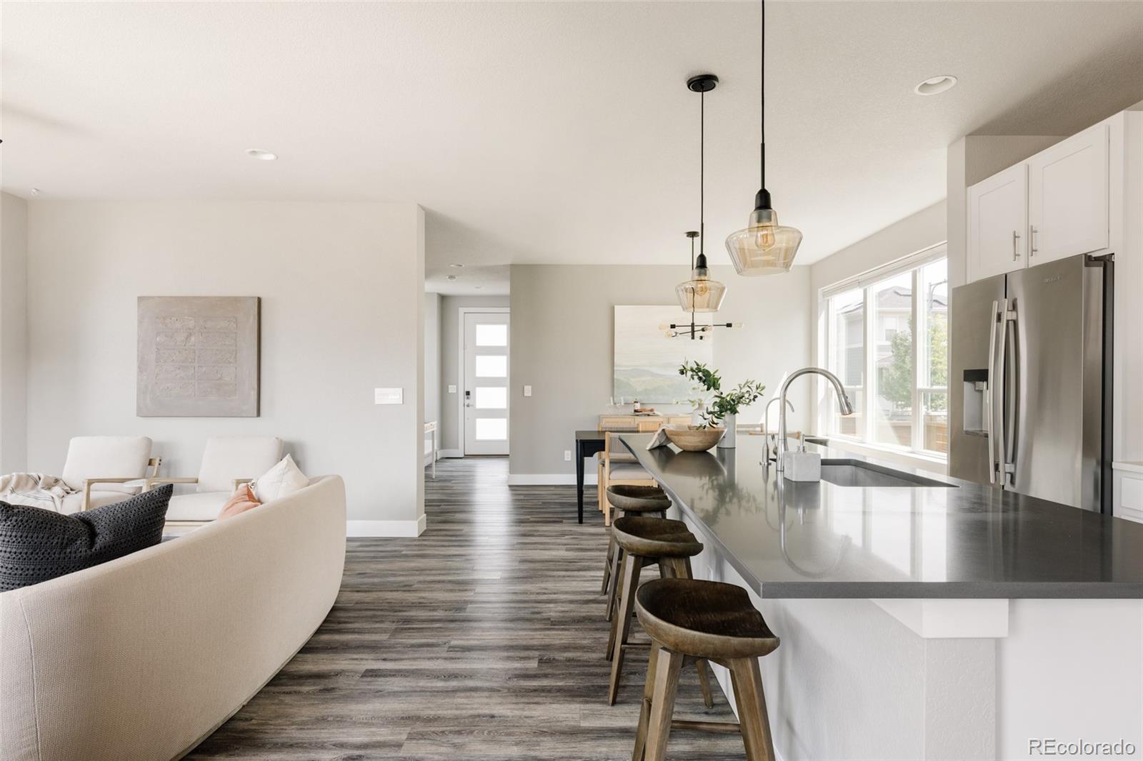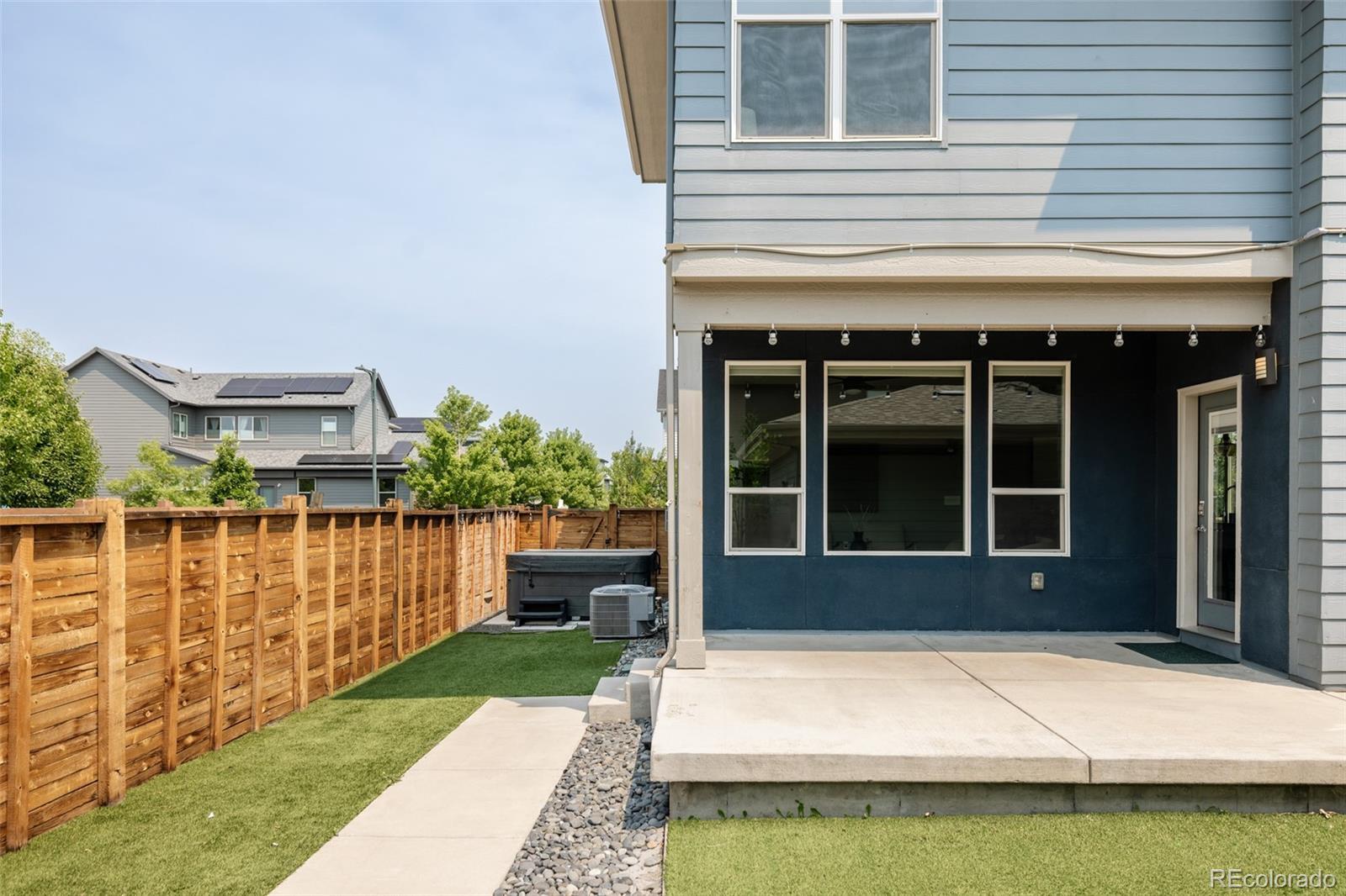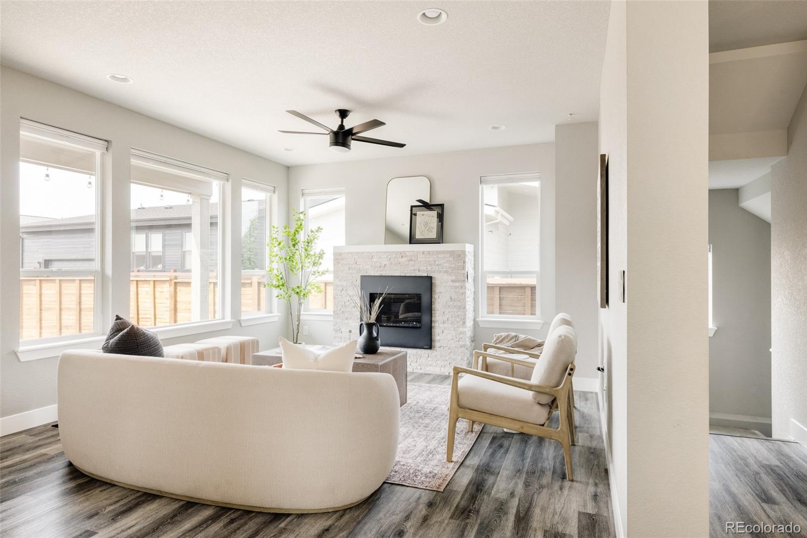 Welcome to 9366 E 59th Avenue—a stunning blend of sleek design, spacious living, and curated comfort in Denver’s Central Park neighborhood. This contemporary two-story home impresses with its bold architectural lines, mixed-material façade, and inviting front porch. The open-concept main level is filled with natural light and designed for effortless everyday living and entertaining. The living room centers around a cozy gas fireplace with a stacked stone surround, flowing seamlessly into the dining area and upgraded kitchen. The kitchen features white cabinetry, quartz countertops, designer tile backsplash, double ovens, and a gas range—perfect for the home chef. Custom window coverings add style and comfort throughout. Upstairs, you'll find three spacious bedrooms, including a serene primary suite with a five-piece bath featuring a soaking tub, shower, dual sinks, and a generous walk-in closet. A full hall bathroom and convenient second-floor laundry round out the upper level. The finished basement offers a large second living space, a full wet bar, a fourth bedroom, and another full bathroom—ideal for guests or multi-generational living. Recent updates include a brand-new roof and new washer and dryer as well as newly added $20K split HVAC system for personalized comfort in the 2 upstairs bedrooms. The private backyard - professionally landscaped with turf, stonework, and a large composite deck, it’s designed for both low maintenance and high enjoyment. String lights, lounge seating, hot tub and a modern privacy fence create the perfect ambiance for evening hangouts or weekend brunches. Owned solar panels are the finishing touch, designed to offset nearly all of the home’s energy usage. Conveniently located near top-rated schools, parks, trails, shops, Dick’s Sporting Goods Park, the Rocky Mountain Arsenal Wildlife Refuge, and the new Pearl Market—this home truly offers the best of Central Park living.