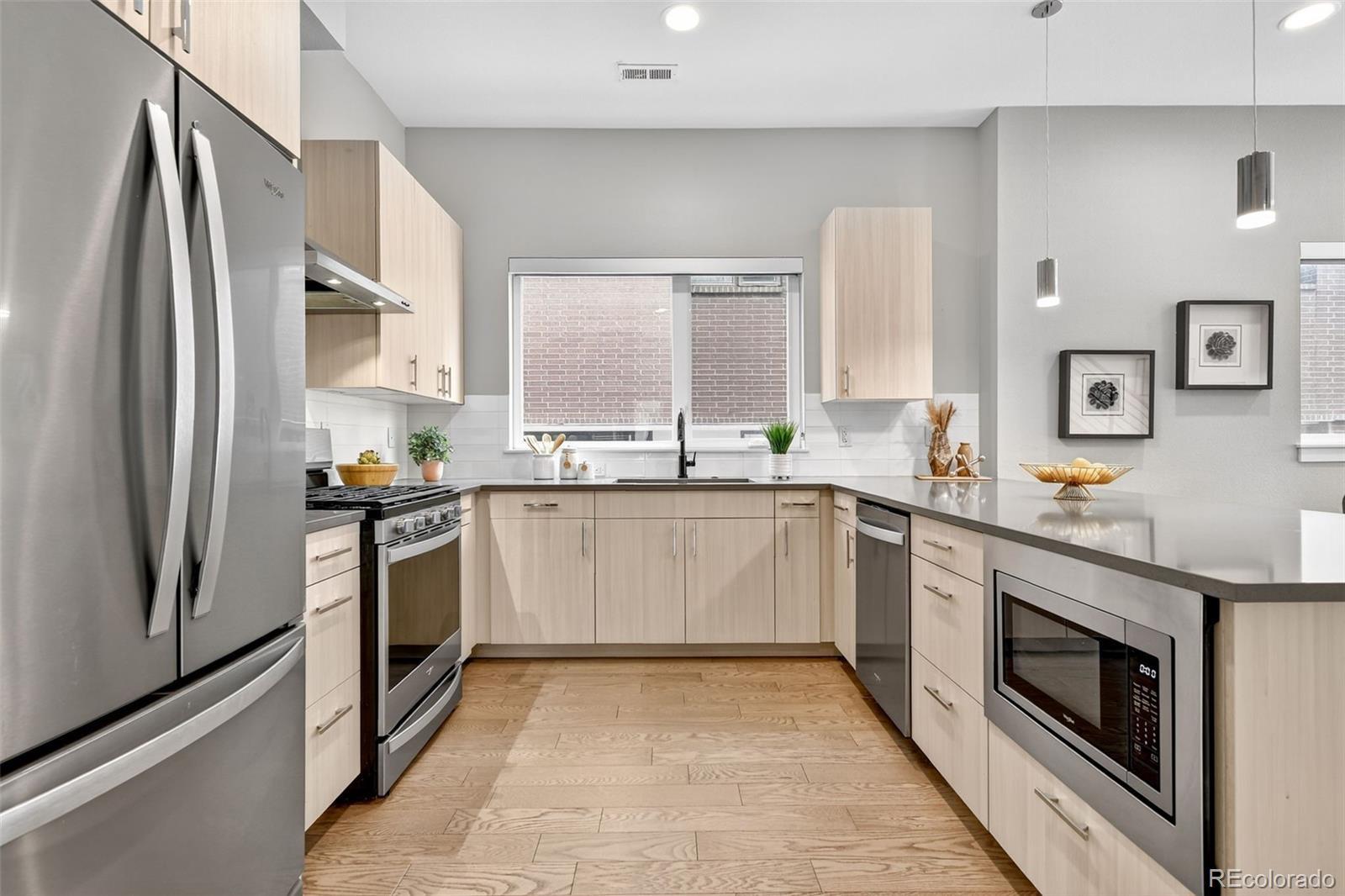 Located in the heart of Denver, this modern townhome offers effortless access to some of the city’s most vibrant destinations; the Highlands, Tennyson Street, and downtown are all just minutes away. Inside, the open and light-filled layout connects the living, dining, and kitchen areas, creating an ideal space for both relaxing and entertaining. The kitchen features sleek cabinetry, quartz countertops, stainless steel appliances, and a generous counter that anchors the main level. Two outdoor spaces on the main level include a balcony off the living room and a Juliet balcony off the den or office area. Upstairs, the spacious primary suite includes a walk-in closet and a well-appointed bathroom with dual sinks and a large shower. An additional bedroom with its own ensuite bathroom provides privacy for kids or guests. A convenient powder bath is located on the main floor, and the laundry is thoughtfully positioned near the bedrooms. The entry level features a third bedroom and full bathroom, perfect for a private office or guest suite. The rooftop deck delivers city views and plenty of space to host friends and family. The oversized one-car garage is equipped with a lift system, allowing room for a second vehicle. With its clean modern design and low-maintenance exterior, this home offers the best of city living without the upkeep.