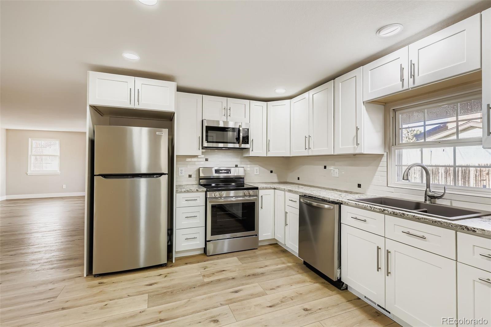 Wow! Beautiful remodel! Pride of workmanship shows around every corner with this remodel. Custom finishes throughout. Modern kitchen with new upgraded cabinets, stainless steel appliances, granite slab counters, and custom backsplash. Gorgeous COREtec flooring and upgraded carpet. New doors/fixtures/trim/hardware. Fresh paint. Corner lot with a spacious backyard. New roof 7/2025. Cherry Creek Schools. Must see!