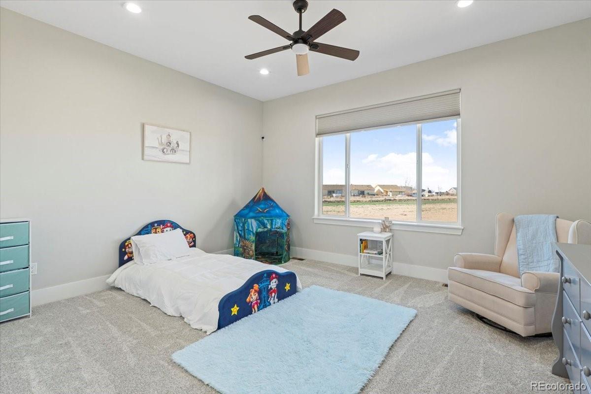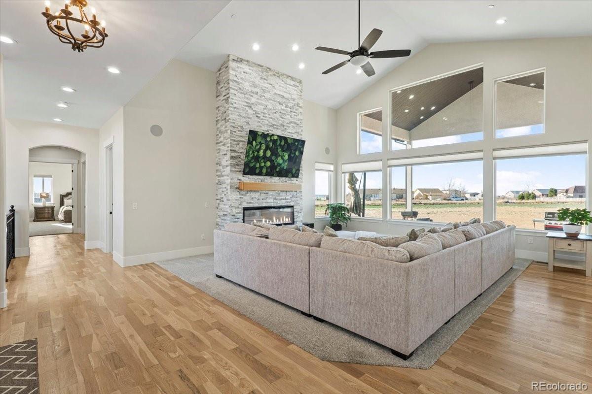 Sitting on 2.28 acres at the end of a cul-de-sac with no HOA, this 6,832 sq ft custom home with a 4 car garage offers privacy, space and quality throughout. The great room features soaring ceilings, natural light through walls of windows and a floor to ceiling fireplace. Dining connects to a kitchen with large island seating, farmhouse sink, custom tile backsplash, walk in pantry and JennAir appliances. The main level primary suite includes a private fireplace, spa bath, dual walk in closets and custom vanity. Three additional bedrooms, large laundry and mudroom complete the main floor. The finished basement offers two en suite bedrooms that flex as office, creative or guest space, plus a theater room, exercise area, open rec and game space with wet bar and storage. Surround sound is wired in the primary, main living room, lower living room, workout room and patio. Upgrades include a camera security system, fire suppression system, tankless water heater and two A/C units. Outdoor living includes a covered front porch, large back patio and room between homes for privacy and sky. Horses allowed. Space for RV parking, toys, future outbuildings and equipment. On clear days the western view delivers vivid sunsets across open land. Located 12 to 20 minutes from Prairie Center retail and dining, downtown Brighton, Barr Lake, Brighton Rec Center and Oasis Aquatic Park. Built for a buyer seeking land, freedom, comfort and connection without losing access to town. A home where kids can run, projects can grow and evenings slow under wide-open color. Designed for luxury living with room to work, build, host and breathe. A rare chance to own space, sky and a lifestyle that feels elevated, intentional and expansive.