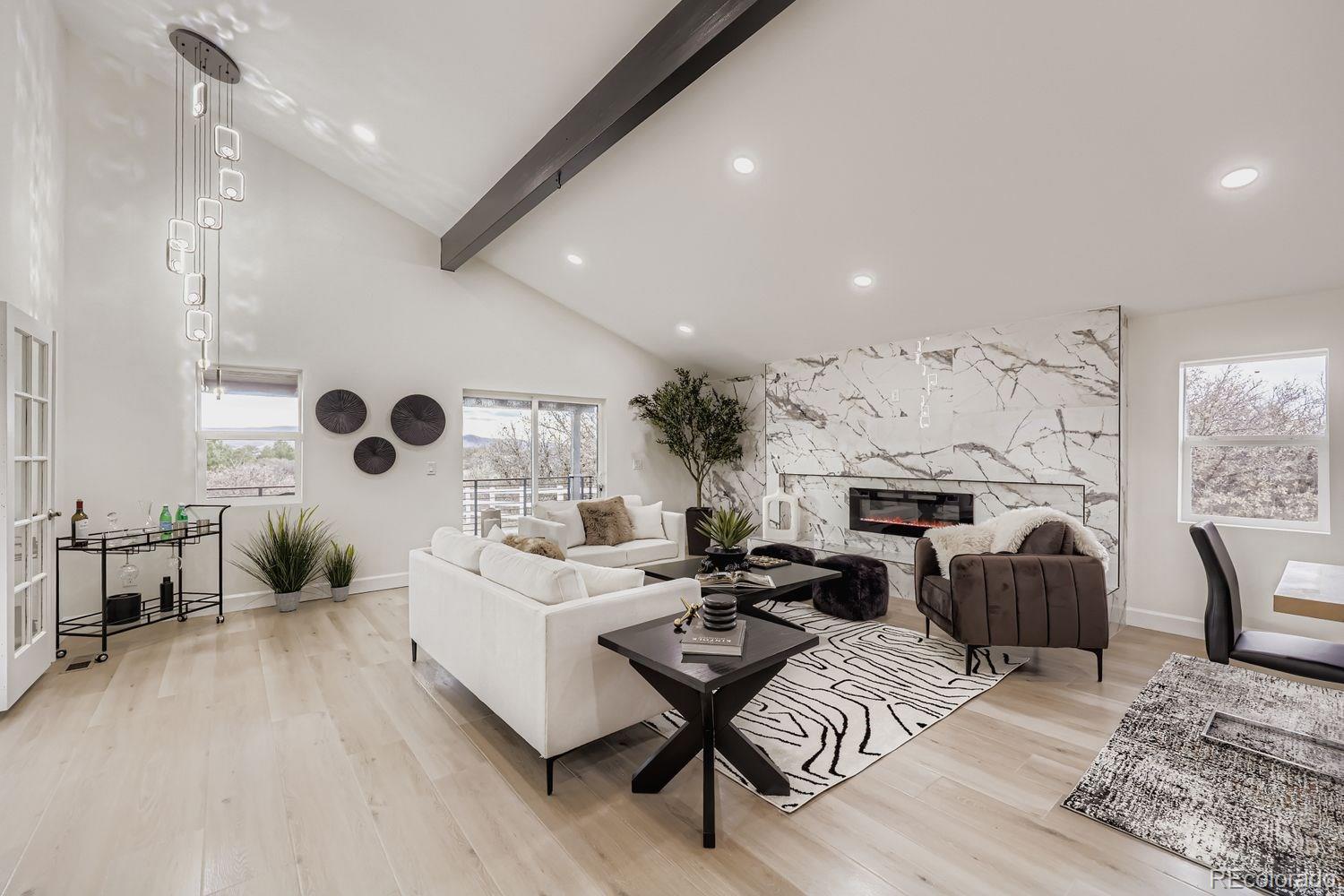 Gorgeous mountain contemporary walk-out ranch on 5 private acres in Perry Pines community, offering breathtaking mountain views from every room. This fully updated and remodeled home features a bright, open main level with high ceilings, a spacious great room with electric fireplace, dedicated dining area, and a designer kitchen with granite counters, stainless appliances, waterfall island, pantry, and eat-in space oriented to capture the scenery. Enjoy seamless indoor-outdoor living with an expansive Trex deck, covered patios, and multiple vantage points for sunrise and sunset. The private primary suite includes a five-piece bath with stunning mountain backdrop. The daylight walk-out lower level adds generous living space, large bedrooms with spectacular mountain views, a family room with wet bar, bonus room, ideal for a gym, theater, or relaxation space and a sunroom (great place for a Hot tub). Exceptional parking and storage with a 2 car oversized attached garage plus a 6-car detached garage/RV bay with electric vehicle charging Carriage House (w/upper level workshop). Located in RR zoning, offering flexibility and a peaceful natural setting with room to roam, perfect for entertaining, retreats, or quiet mountain living with easy access to the town, Castle Rock, Denver, DTC, and city conveniences. A rare Colorado lifestyle opportunity. A Must See!