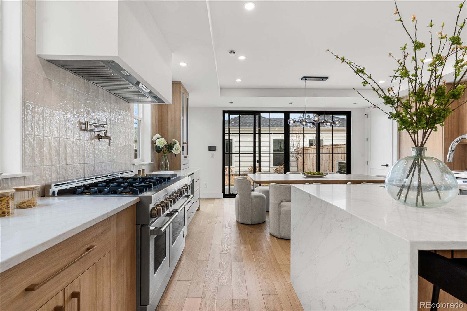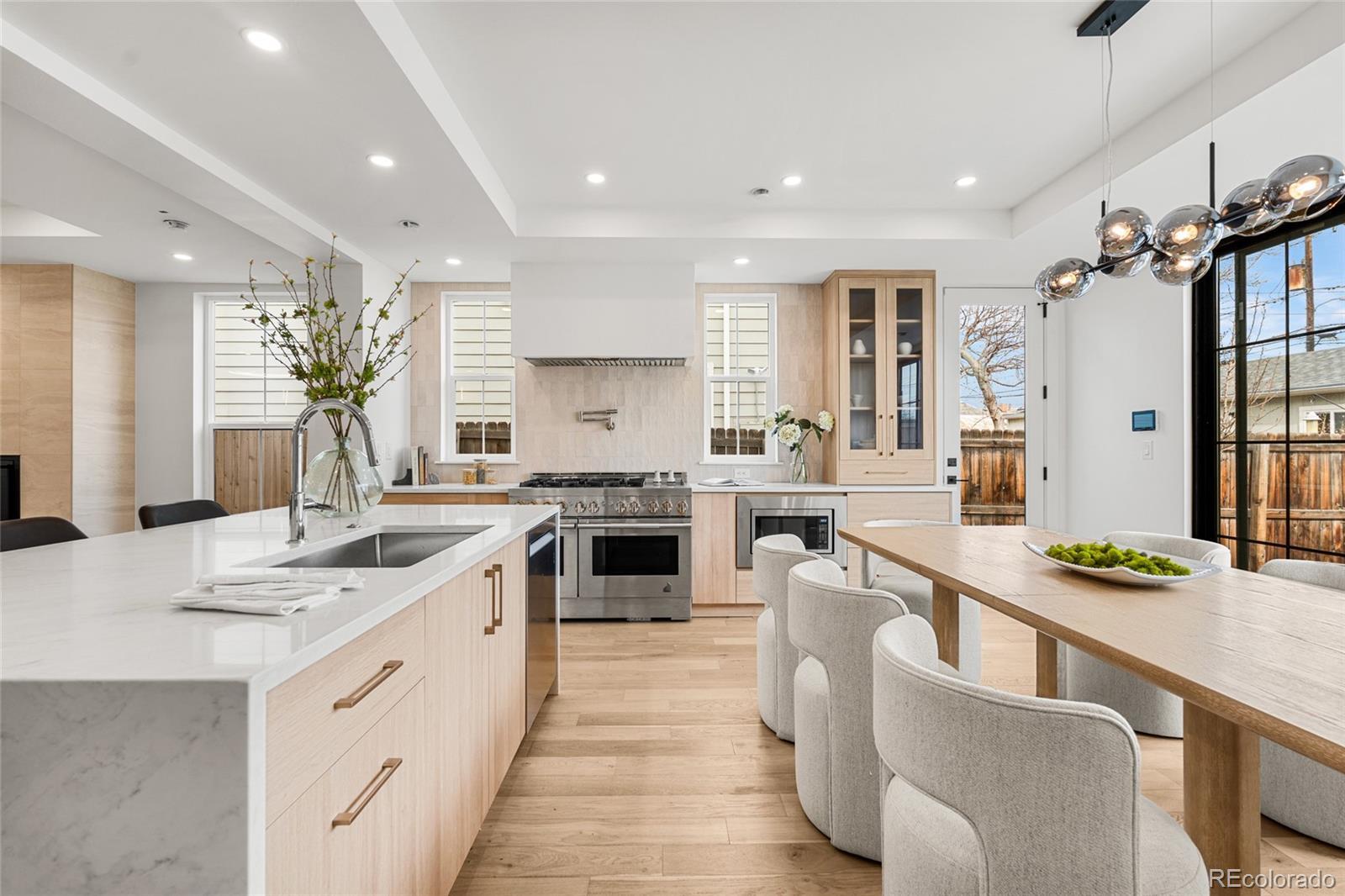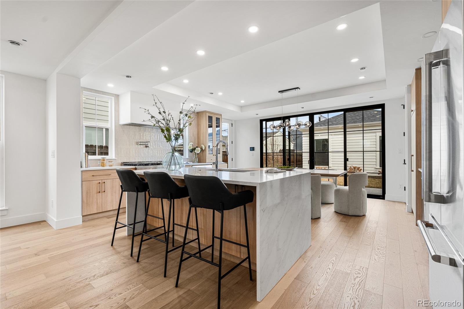 Introducing 2360 Acoma St, an exceptional brand-new 3-bedroom, 4-bath, three-story residence in the heart of SoBo. Inspired by East Coast Colonial and Greek Revival architecture, this home blends timeless design with elevated modern finishes. The open-concept main level offers wide-plank hardwood floors, coffered ceilings, a gas fireplace, and expansive 8-foot windows that flood the space with natural light. A front-positioned staircase maximizes the footprint, creating a wider, more open feel rarely found in multi-level homes. The chef’s kitchen is appointed with a full JennAir appliance suite, custom white oak cabinetry, a substantial quartz island, and floor-to-ceiling storage. An oversized sliding door extends living outdoors to a landscaped backyard with hydrangeas and a generous patio designed for seamless entertaining. Upstairs, the primary suite offers mountain views, a private balcony, dual closets, and a spa-caliber 5-piece bath with an oversized walk-in shower, complemented by an additional bedroom and full bath. The top level provides exceptional flexibility with a den, third bedroom, wet bar, and rooftop deck capturing sweeping Downtown Denver views. Complete with a 2-car garage, abundant storage, builder warranty, and no HOA. Ideally located one block from Broadway and moments to Overland Golf Course, DU, Safeway, and SoBo’s vibrant restaurants, music venues, and parks—with convenient access to the mountains and Red Rocks Amphitheatre. A distinctive residence where architecture and design take center stage!