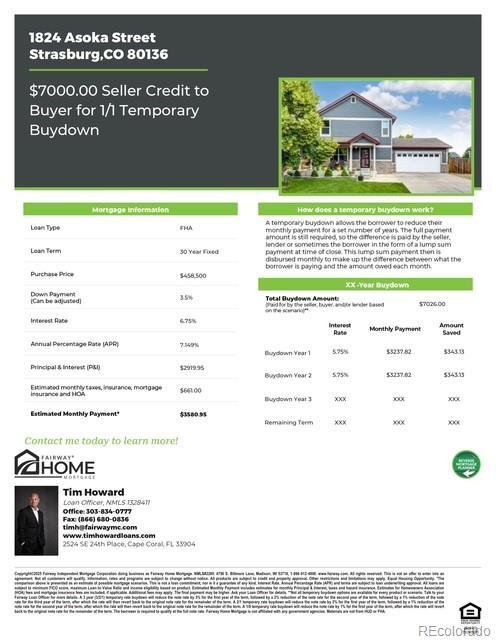 SELLER IS OFFERING $5000.00 CONCESSION~~Take a look at this 4-bedroom, 2.5-bath home, which features an open design, a modern kitchen, a spacious living area, and a convenient half bath located on the main floor. The upper floor features three bedrooms and a full bathroom. The basement includes a large primary bedroom with a generous walk-in closet and a three-quarter bathroom. The property boasts a huge backyard, perfect for a playset for kids and plenty of room for pets to run. Additional features include fresh exterior paint, a new roof (installed in 2023), a new garage door, a storm door, and several new windows throughout. Recent updates include newer appliances, a new central air system (installed in 2024), new carpet (installed in 2025), and updated flooring on both the basement and main levels. With numerous upgrades, this home is ready for immediate occupancy. Situated within walking distance of schools and downtown Strasburg, it's just a 35-minute drive to DIA or downtown Denver and 12 minutes from local grocery stores, shops, and restaurants. Discuss rate buydown options with our preferred lender. Flyer attached in photos.