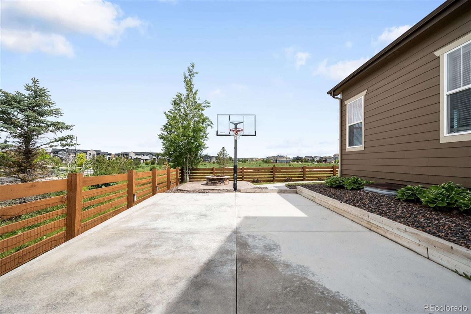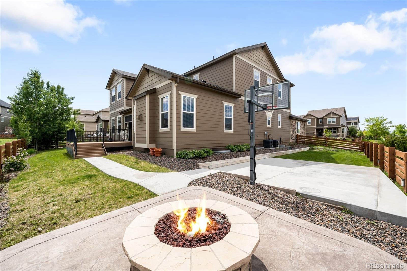 A beautifully crafted custom home offering a perfect blend of functionality and comfort across three finished levels. Inside, the main floor features a spacious living room centered around a cozy fireplace, seamlessly flowing w triple sliding glass doors to a covered patio with a custom shade and its own outdoor fireplace—ideal for entertaining. A dining area offers space for gatherings, while a dedicated office provides a quiet place to work from home. The chef’s kitchen includes a new refrigerator and a custom pantry, and the main level also includes a powder room and a private ensuite bedroom featuring a walk-in shower. Upstairs, the expansive primary suite is a relaxing retreat with dual sinks, a soaking tub, a walk-in shower, and a custom California Closet walk-in, plus a loft sitting area. Two additional bedrooms share a Jack and Jill bathroom, and a third bedroom has a walk-in closet with access to a second full bath, while the upstairs laundry includes a utility sink. The finished basement offers a bedroom with a walk-in closet and an adjacent bath with a walk-in shower, ideal for guests or multigenerational living. Parking and storage are easy with three garage spaces, including a two-car and separate one-car garage. Step outside to enjoy a covered patio with shade covering and a new basketball court with hoop and concrete pad. Thoughtful upgrades include custom pantry shelving, enhanced shelving throughout, a custom California Closet system in the primary suite, and the addition of the patio covering and basketball court, all nestled in a desirable neighborhood offering community charm and modern livability. *1 YEAR HOME WARRANTY PROVIDED*