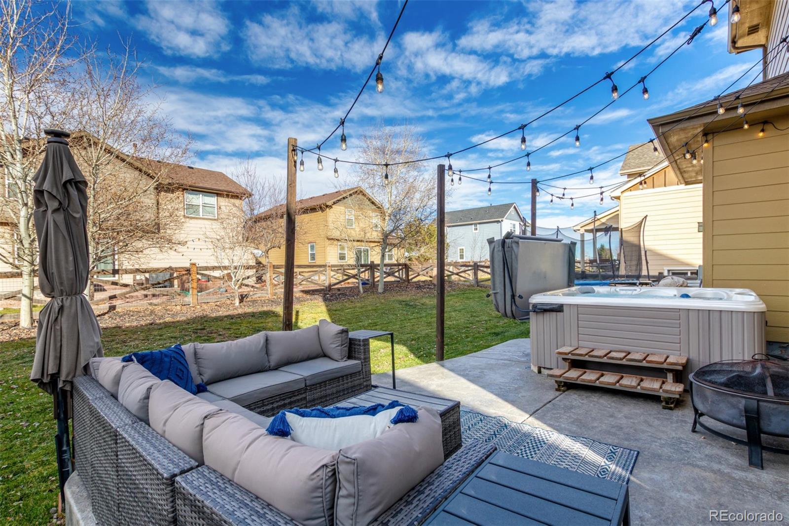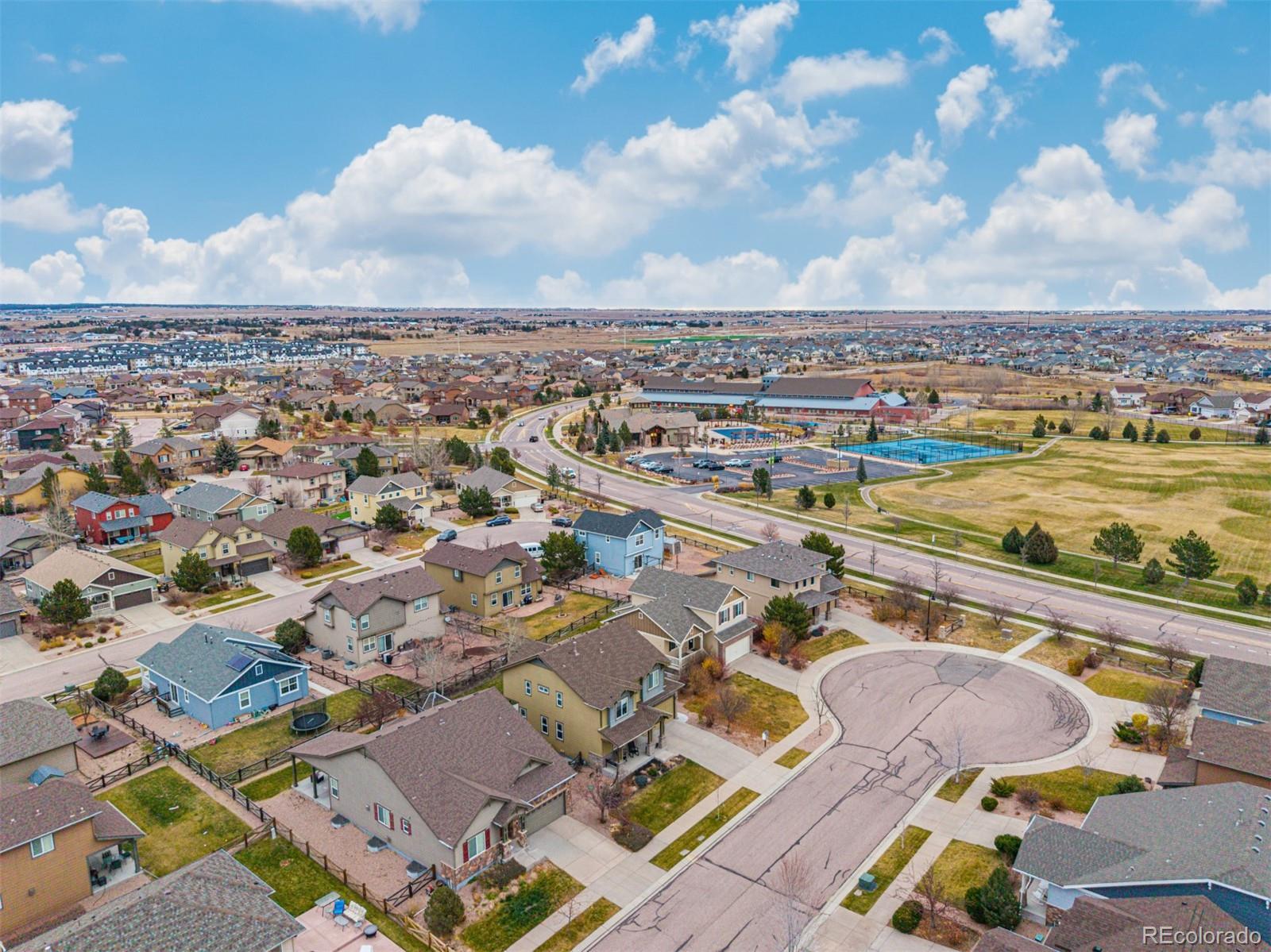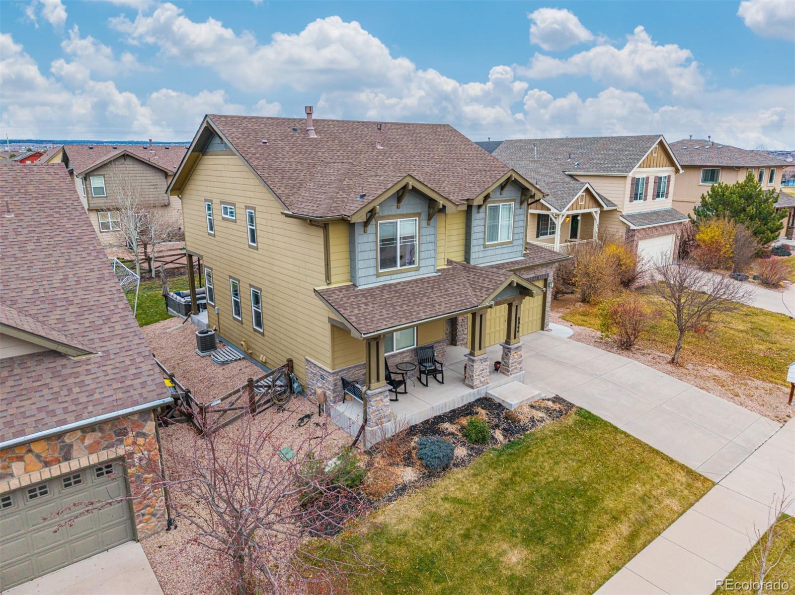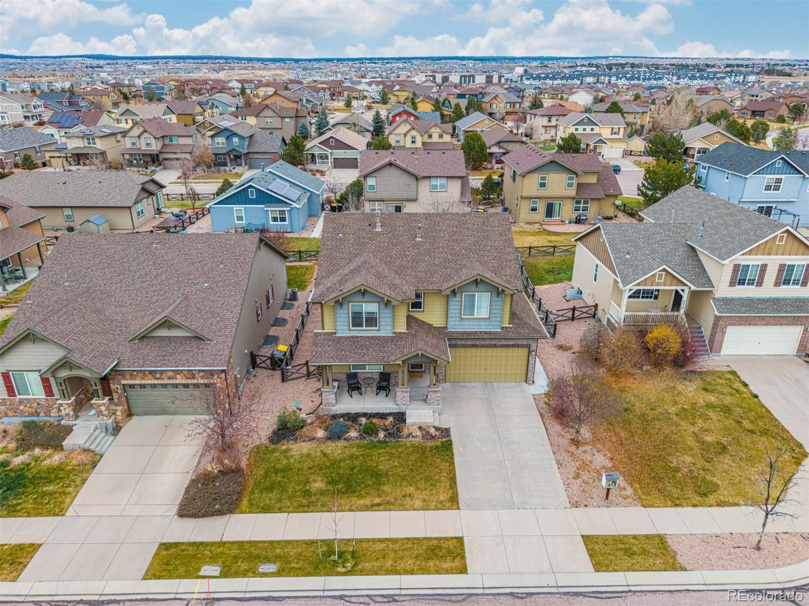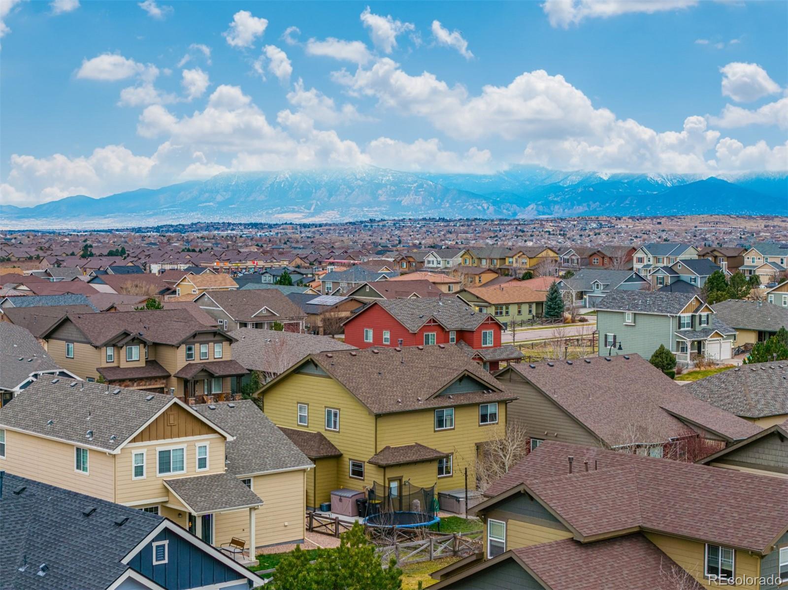 Step into a Banning Lewis Ranch home that’s ready to enjoy from day one! This beautifully maintained 5-bedroom, 3.5-bath residence blends modern upgrades, flexible living spaces, and a true community lifestyle—ideal for buyers seeking comfort, convenience, and room to grow. Rich hardwood floors, 9 ft ceilings, and fresh neutral paint set an inviting tone. A corner gas fireplace connects the living and dining rooms, creating a cozy Colorado backdrop. The gourmet kitchen features granite counters, a center island, double oven, gas range, pantry, and new gold hardware. The dining area opens to a stamped concrete patio with a hot tub that stays, offering easy indoor–outdoor flow. A large front porch with Pikes Peak views provides a relaxing spot to enjoy Colorado sunsets. Upstairs, an open landing connects the primary suite, three bedrooms, and a full bathroom. Step through French doors into the private retreat. The ensuite includes updated sintered countertops, new lighting, a dual vanity with real wood cabinetry, a walk-in closet, plus a soaking tub and separate shower. The finished basement adds versatility with a family room wired for sound, a bedroom, 3/4 bath, storage, and a flexible nook ideal for a gym or hobby space. A standout feature is the finished and insulated 3-car tandem garage with a heavy-duty insulated door, workbench, overhead storage, and direct backyard access—perfect for Colorado gear and tools. Additional highlights include new LED ceiling lights, a whole-house humidifier, manifold plumbing, under-stair storage, and front and back sprinklers. Located on a quiet cul-de-sac, you’re within walking distance of the community recreation center and Banning Lewis Ranch Academy, with convenient access to Vista Water Park, Climber’s Park, and seasonal concerts, events, and the farmers market—offering a lifestyle that’s active and connected. Move-in ready and thoughtfully upgraded—this home is one you won’t want to miss.
