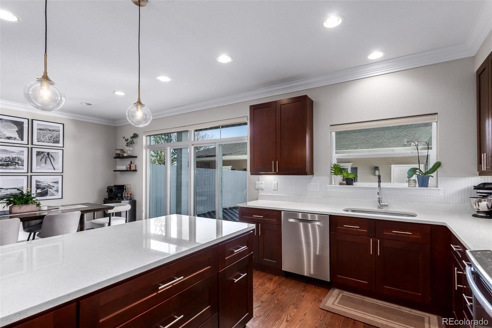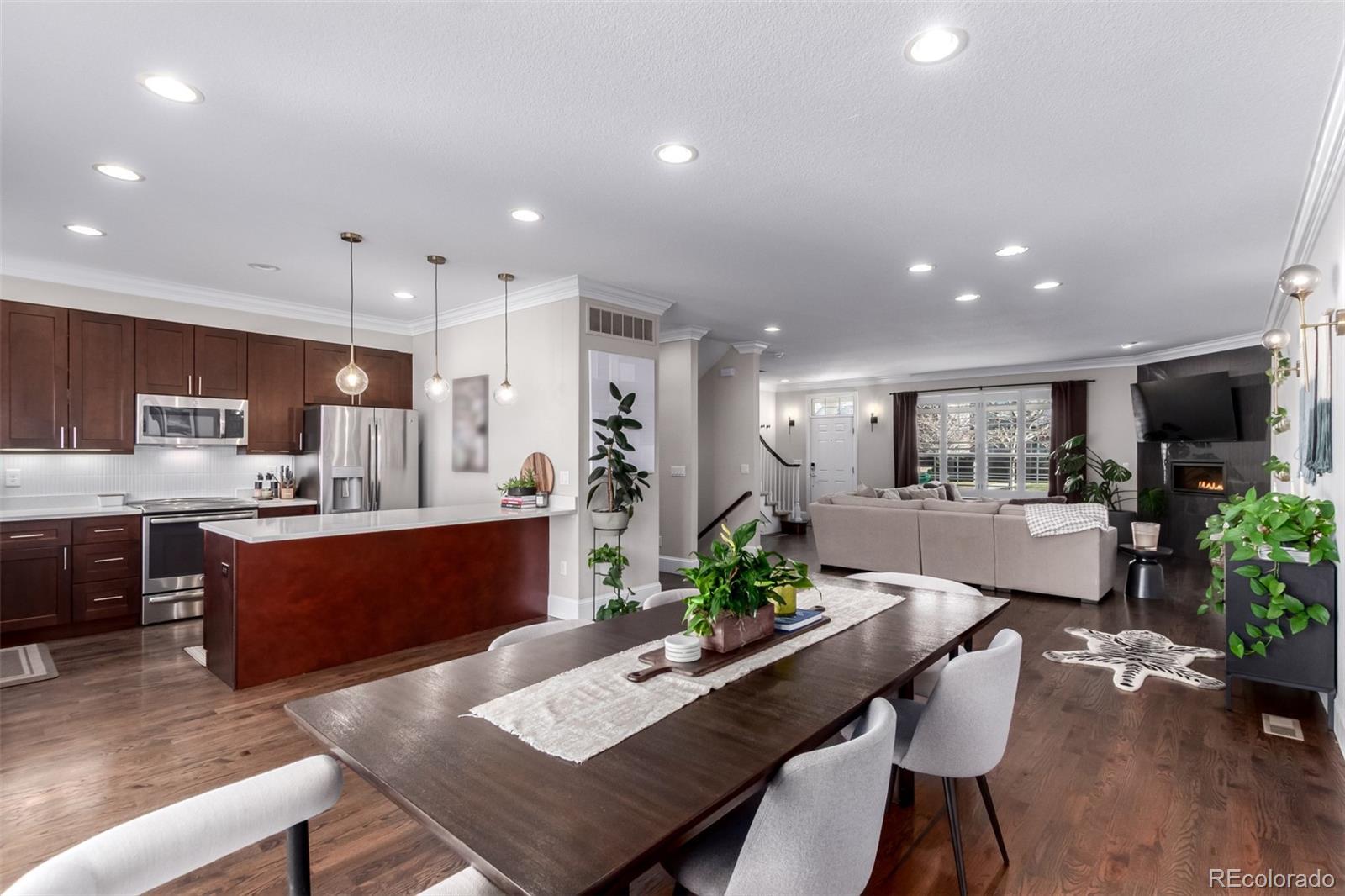 Welcome to this beautifully designed 4-bedroom, 4-bathroom townhome offering over 3,000 square feet of stylish, functional living in the desirable South Broadway Englewood neighborhood. Located on a spacious 7,000+ sqft landscaped lot, this home offers low-maintenance living with plenty of room to breathe! Step inside to a bright, open main level featuring rich wood flooring, high ceilings, and an expansive living room anchored by a contemporary fireplace. Upstairs, the luxurious primary suite offers vaulted ceilings, a walk-in closet, and a spa-like 3/4 ensuite with dual sinks. Two additional bedrooms, a full bath, and convenient laundry complete the upper level. The fully finished basement is an entertainer’s dream with a large great room, guest bedroom, and full bathroom—perfect for guests, a home theater, gym, or playroom. The chef-inspired kitchen is equipped with quartz countertops, stainless steel appliances, a large island, and shaker cabinetry—ideal for both entertaining and everyday cooking. Step outside and enjoy the best of Colorado living with multiple inviting outdoor spaces. The covered front porch offers a charming spot to sip your morning coffee or unwind in the evening while watching the neighborhood go by. In the back, the private, fenced yard is perfect for weekend BBQs, dining al fresco, or letting pets play freely. With easy access from the main living area, it’s a seamless extension of your entertaining space—low-maintenance, functional, and ready for your personal touch. This rare gem blends modern finishes, a versatile layout, and thoughtful upgrades—perfect for today’s lifestyle. You’re just minutes from shops, dining, parks, and schools, with easy access to highways and light rail. This is the one you’ve been waiting for—schedule your private tour today!