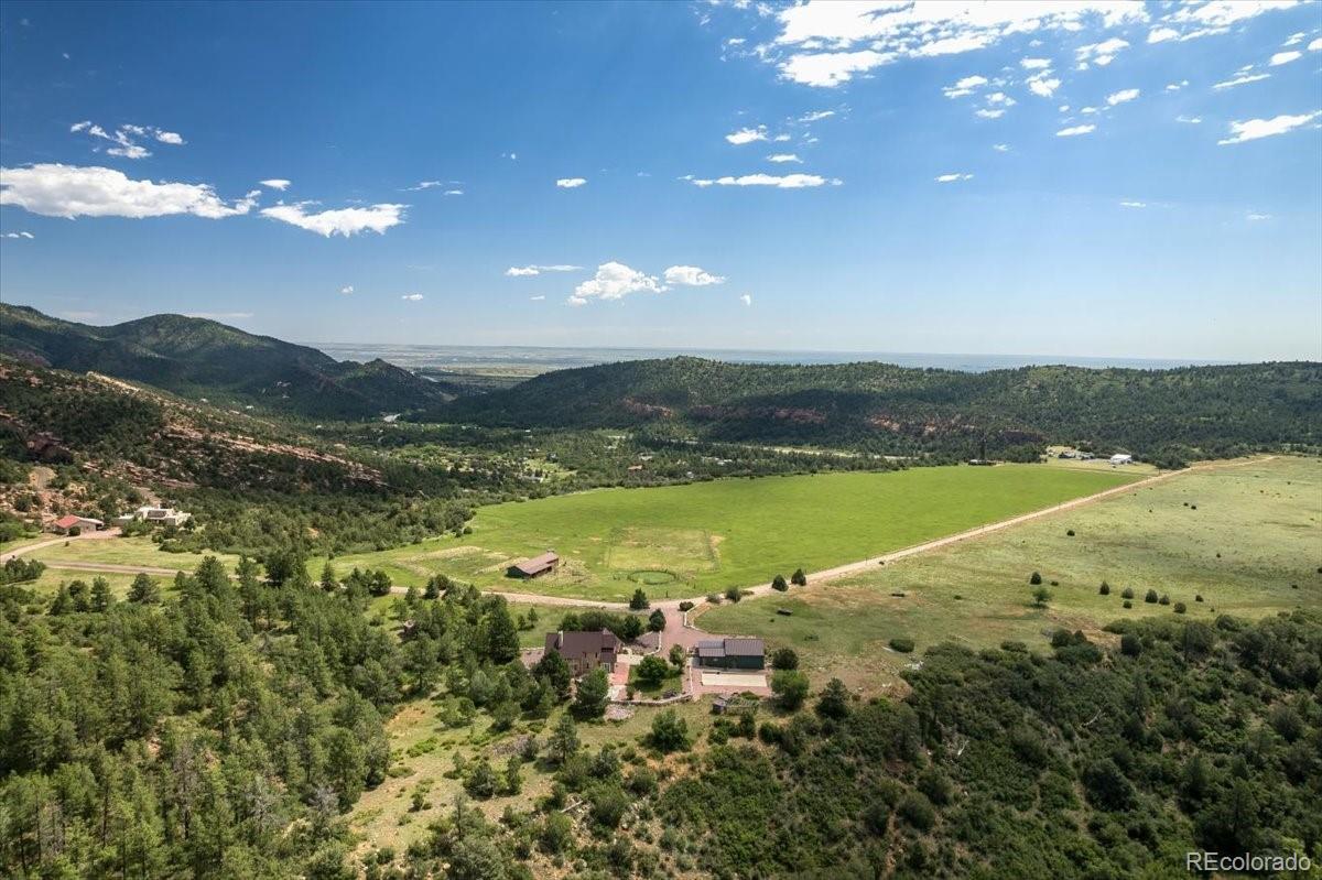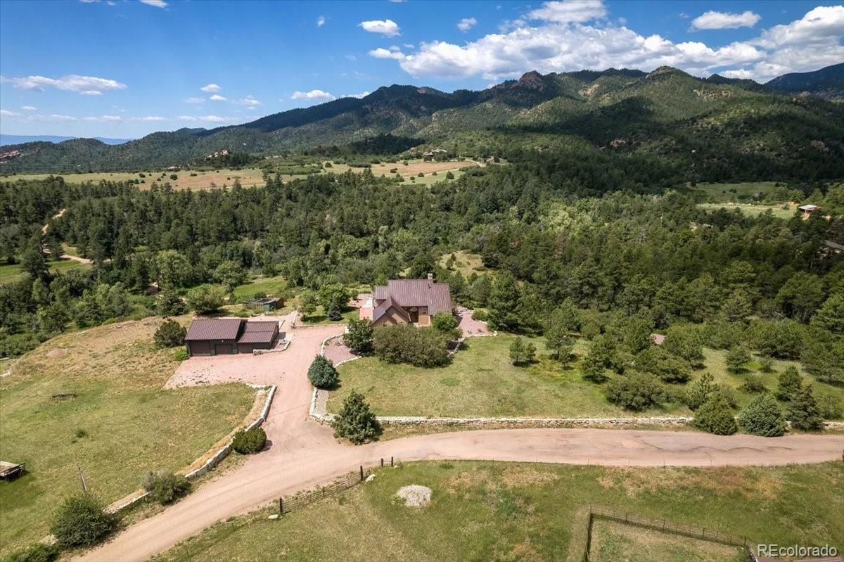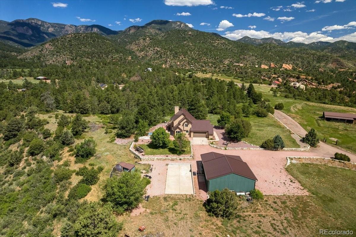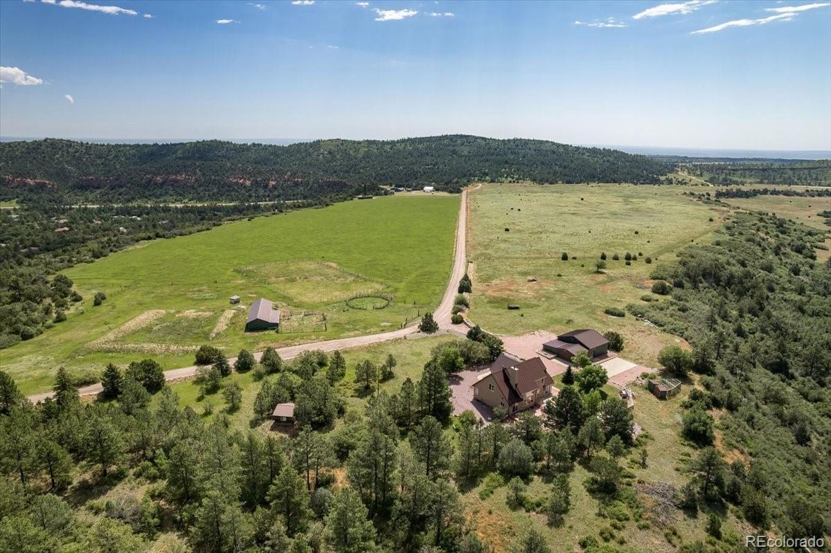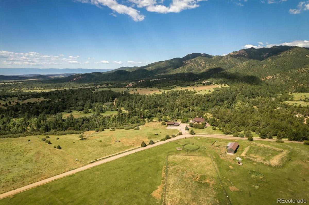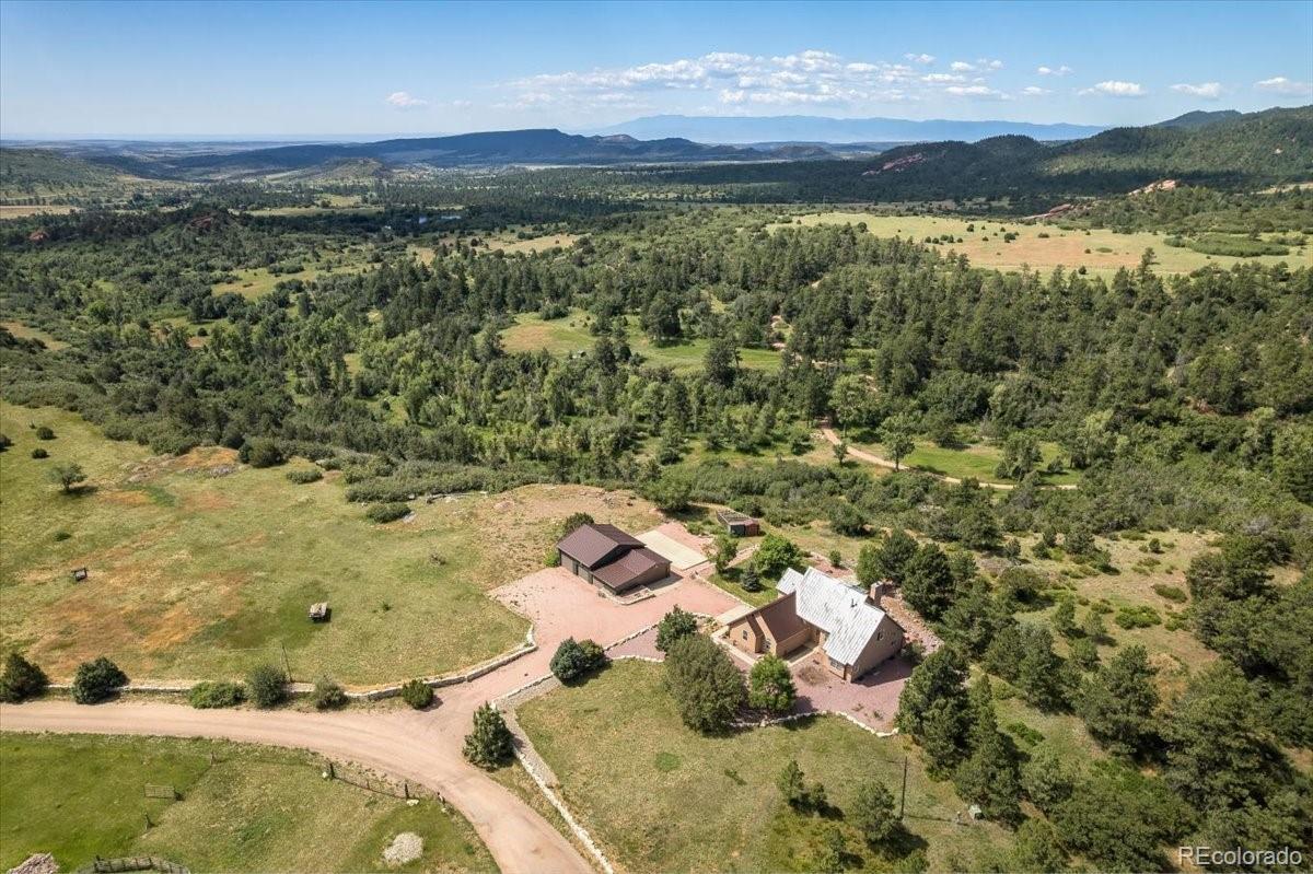 Welcome to your private mountain sanctuary just 15 minutes southwest of Colorado Springs. Nestled in a serene rural mountain community off Highway 115, this 35-acre estate offers the perfect blend of luxury, seclusion, and accessibility—with sweeping 360-degree views of the surrounding mountains, striking rock outcroppings, and endless sky. This custom 4-bedroom, 3-bathroom residence provides over 3,000 square feet of finely crafted living space. Step into the vaulted great room featuring a showstopping stone fireplace and rich hardwood floors, where every window frames a postcard-worthy view. The main level includes 2 spacious bedrooms, one with walk-out access to the expansive patio—ideal for stargazing under the Milky Way or enjoying sunrise coffee with deer, hummingbirds, or the occasional bobcat as your backdrop. The primary suite is a true retreat, complete with dual closet rooms and a luxurious five-piece bath. Every detail has been considered for comfort and elegance, making this home equally suited for full-time living or a peaceful getaway. Equestrian lovers will appreciate the well-appointed horse barn with water, stables, hay barn, round pen, and outdoor riding arena. Hobbyists and adventurers will find endless space in the over-sized detached garage, RV pad with dedicated electricity and cistern, and a large outbuilding for tools, vehicles, or recreational gear. A large chicken coop adds to the charm. The use of ground water from this well is limited to ordinary household purposes inside 3 single family dwellings, fire protection, the watering of poultry, domestic animals, and livestock on a farm or ranch, and the irrigation of not over one ( 1) acre of home gardens and lawns. Despite its tranquil setting, this property is just a short drive from Ft. Carson, Colorado Springs, Florence, and Canon City. With mostly level, cleared land and exceptional natural beauty in every direction, this is more than a home—it’s a lifestyle.
