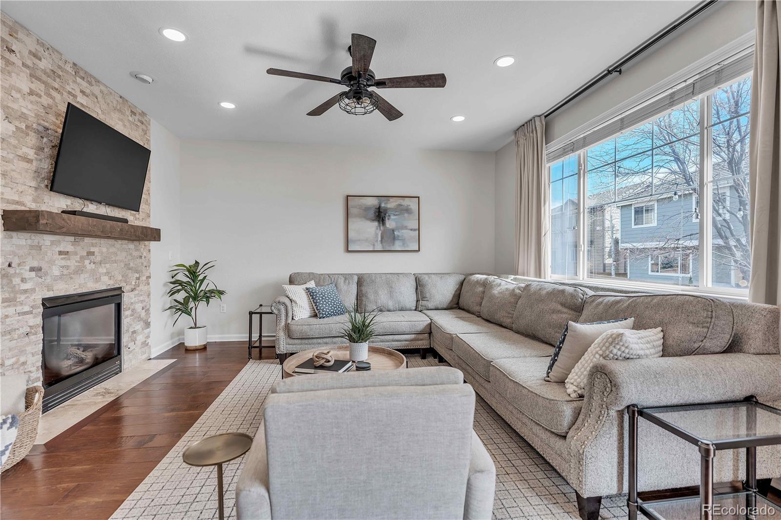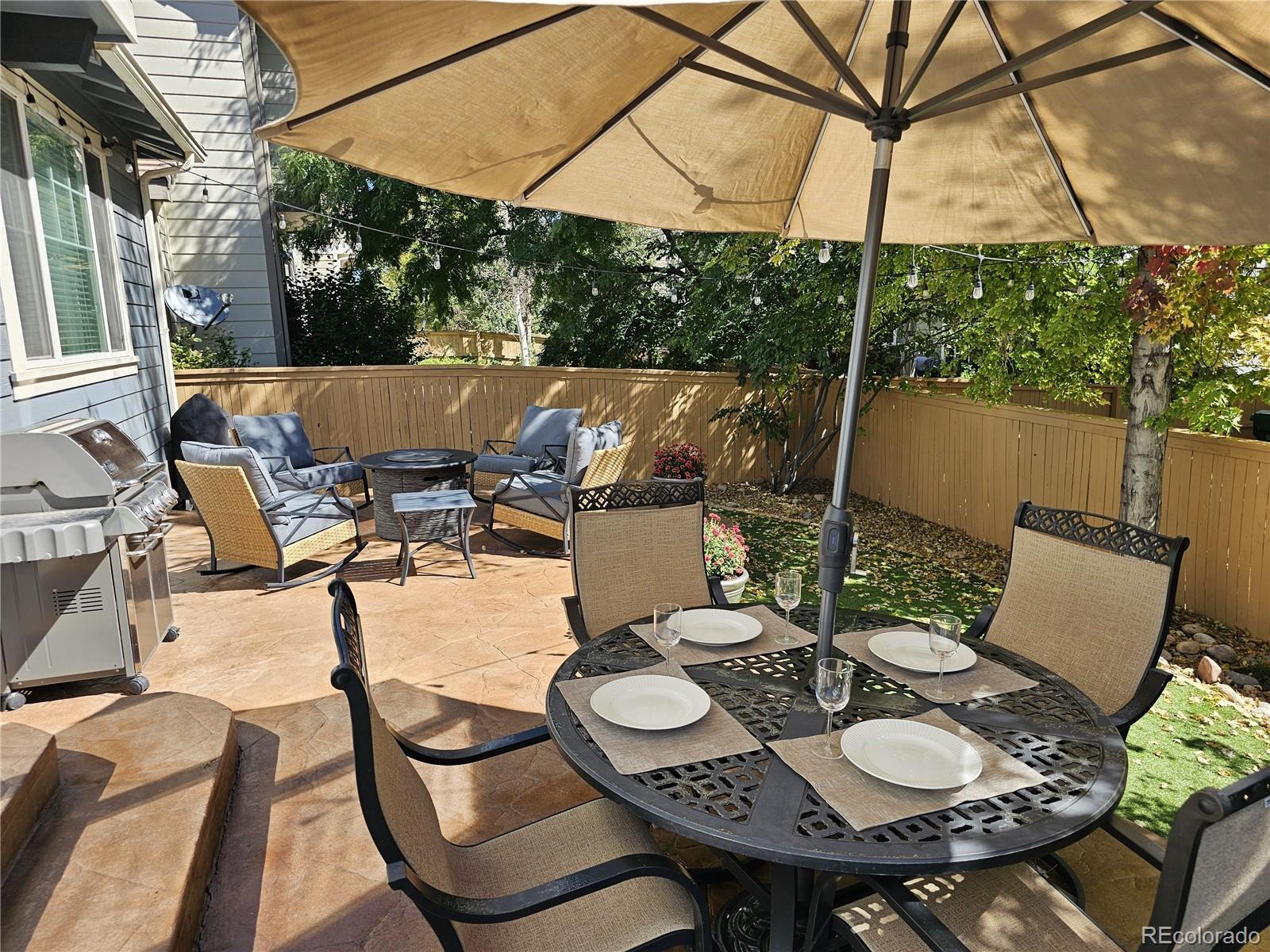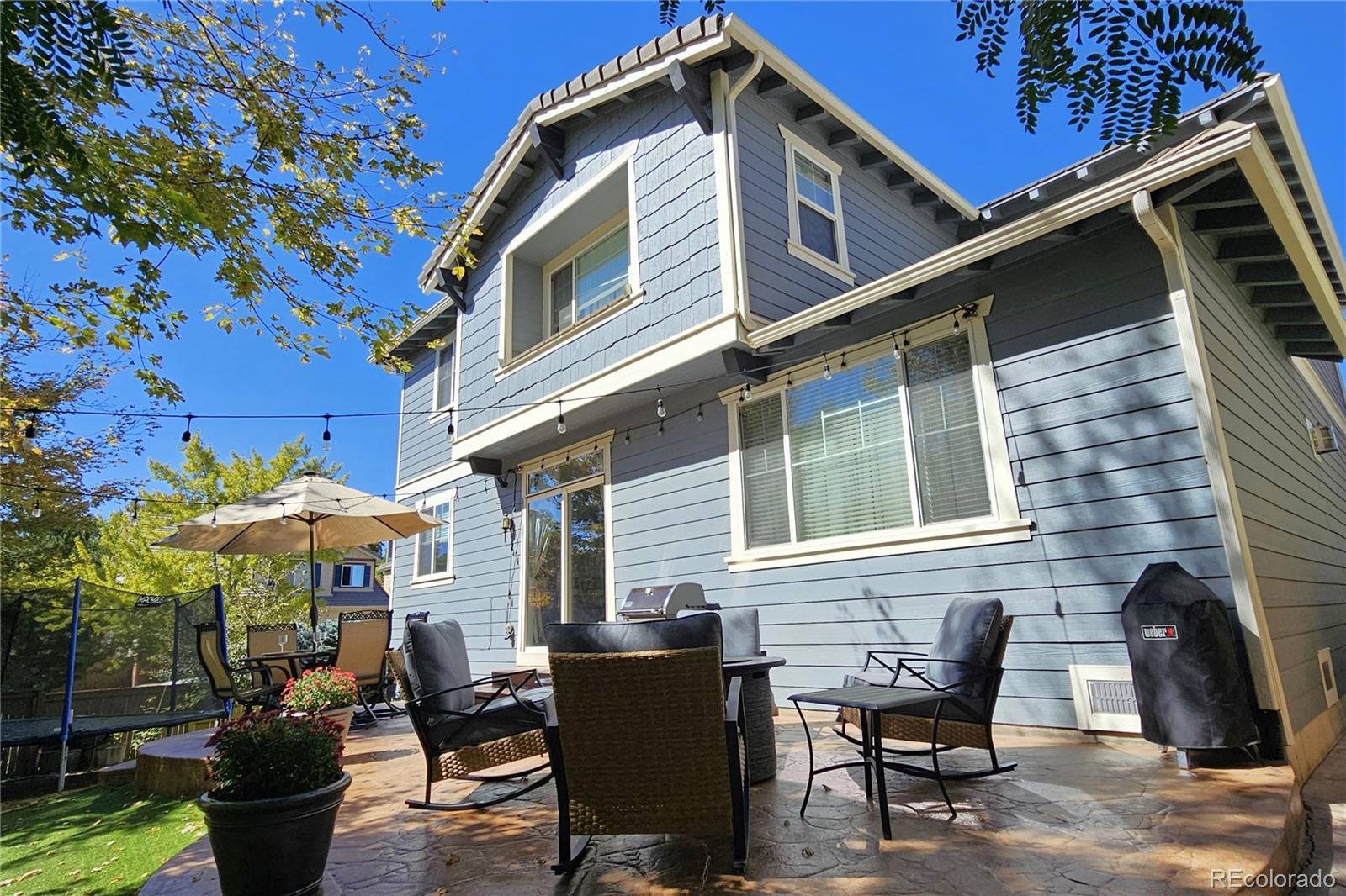 Welcome to this exceptional, beautifully updated home in the desirable Firelight neighborhood. Over 2,800 finished square feet, featuring 4 bedrooms and 4 bathrooms with upgrades throughout. Extended hardwood floors and brand-new interior paint enhance the light-filled, open design. The main level is designed for both everyday living and entertaining. The updated kitchen showcases white cabinetry, granite countertops, stainless steel appliances, recessed lighting, a pantry, breakfast bar, and an eating space with access to the back patio. The open-concept family room is filled with natural light from abundant windows and features a gas fireplace with stacked stone surround, and built-ins. A formal dining room with recessed lighting adds elegance for gatherings. The private study with French doors provides the perfect home office space. A fully updated bathroom on the main floor includes a new vanity, a stylish wall treatment, and modern tile flooring. Upstairs, the spacious primary suite offers generous windows and a walk-in closet. The 5-piece primary bath has been beautifully remodeled with quartz countertops, dual undermount sinks, framed mirrors, updated fixtures, a relaxing soaker tub, and a frameless glass shower. 2 additional bedrooms share an updated Jack-and-Jill bath with quartz counters and modern finishes. The laundry room with added cabinetry is conveniently located upstairs. The professionally finished basement expands your living space with a versatile flex area complete with a wet bar and closet—ideal as a 4th bedroom, media room, gym, hobby space, or game room. An updated 3/4 bath features a custom tile shower and wood-look tile flooring. Outdoors, enjoy professional landscaping with a large stamped concrete patio, garden boxes, and a trampoline. Ideally located near the Southridge Rec Center, shopping, dining, parks, Backcountry Wilderness trails, C-470, I-25, and the DTC, this home offers comfort, style, and convenience in one remarkable package.