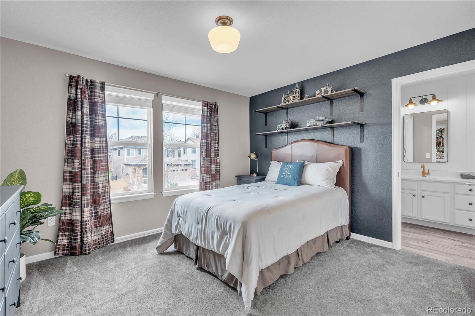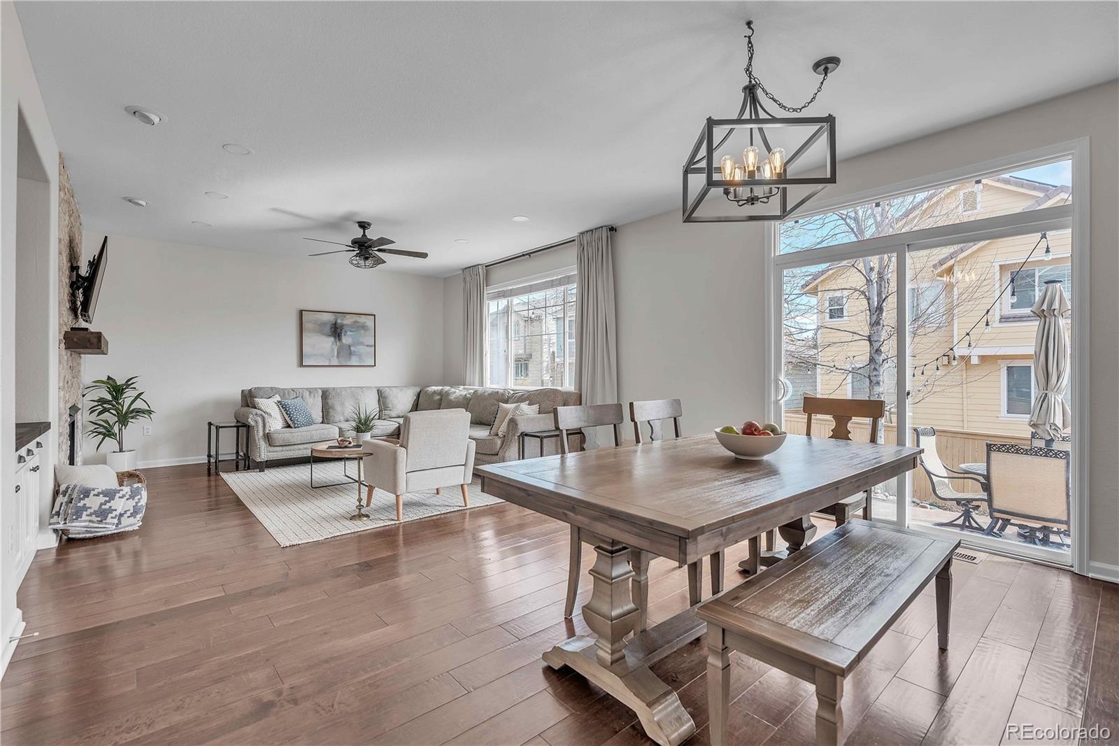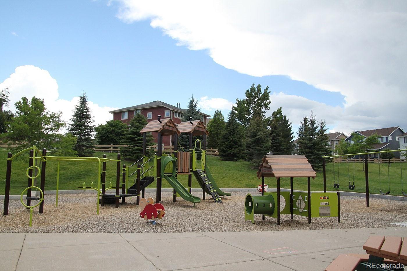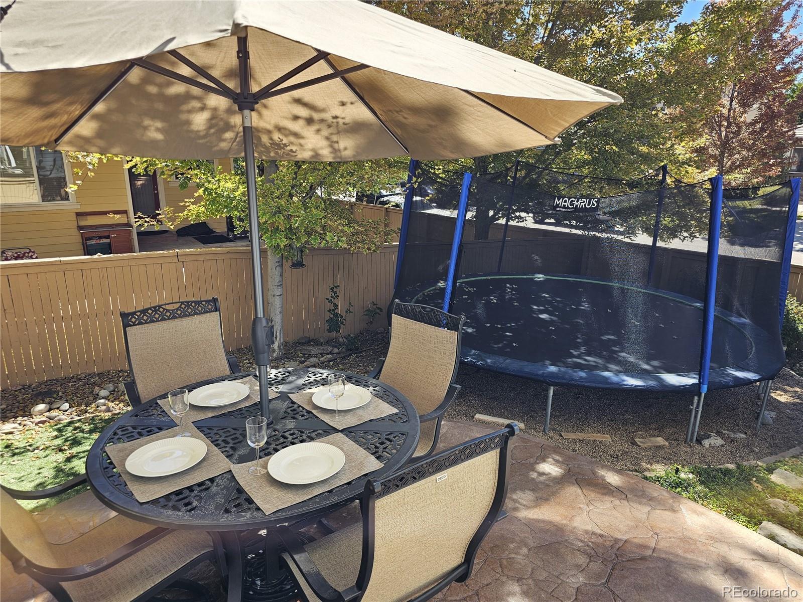 Welcome to this exceptional, beautifully updated home in the desirable Firelight neighborhood. Over 2,800 finished square feet, featuring 4 bedrooms and 4 bathrooms with upgrades throughout. Extended hardwood floors and brand-new interior paint enhance the light-filled, open design. The main level is designed for both everyday living and entertaining. The updated kitchen showcases white cabinetry, granite countertops, stainless steel appliances, recessed lighting, a pantry, breakfast bar, and an eating space with access to the back patio. The open-concept family room is filled with natural light from abundant windows and features a gas fireplace with stacked stone surround, and built-ins. A formal dining room with recessed lighting adds elegance for gatherings. The private study with French doors provides the perfect home office space. A fully updated bathroom on the main floor includes a new vanity, a stylish wall treatment, and modern tile flooring. Upstairs, the spacious primary suite offers generous windows and a walk-in closet. The 5-piece primary bath has been beautifully remodeled with quartz countertops, dual undermount sinks, framed mirrors, updated fixtures, a relaxing soaker tub, and a frameless glass shower. 2 additional bedrooms share an updated Jack-and-Jill bath with quartz counters and modern finishes. The laundry room with added cabinetry is conveniently located upstairs. The professionally finished basement expands your living space with a versatile flex area complete with a wet bar and closet—ideal as a 4th bedroom, media room, gym, hobby space, or game room. An updated 3/4 bath features a custom tile shower and wood-look tile flooring. Outdoors, enjoy professional landscaping with a large stamped concrete patio, garden boxes, and a trampoline. Ideally located near the Southridge Rec Center, shopping, dining, parks, Backcountry Wilderness trails, C-470, I-25, and the DTC, this home offers comfort, style, and convenience in one remarkable package.
