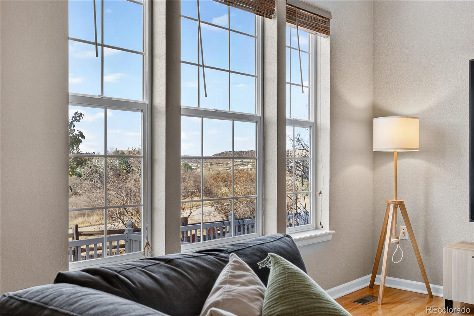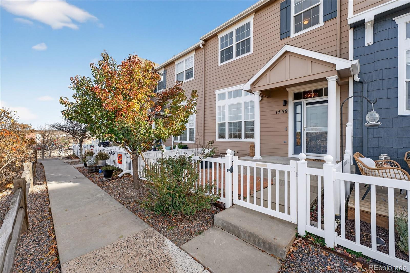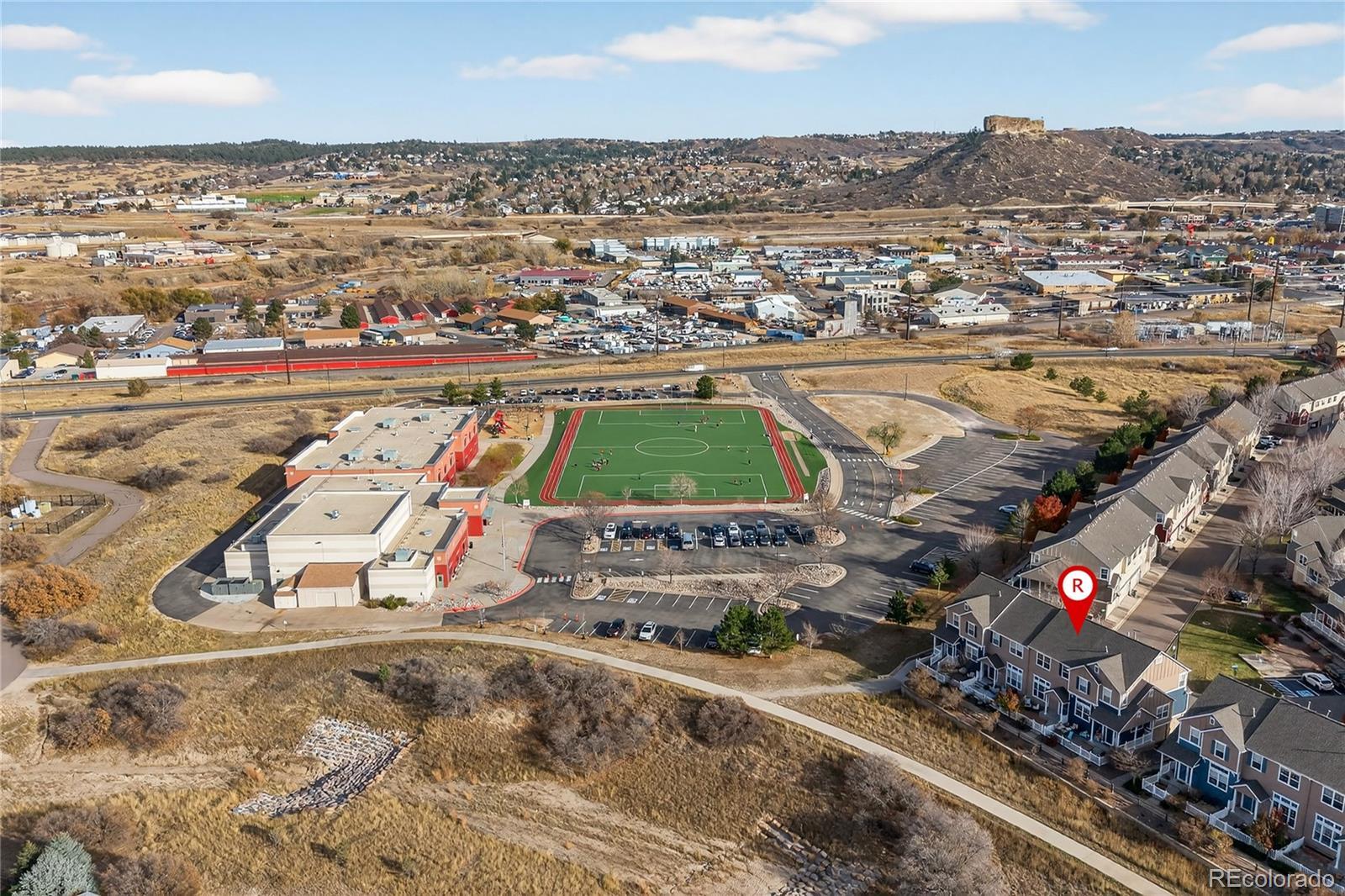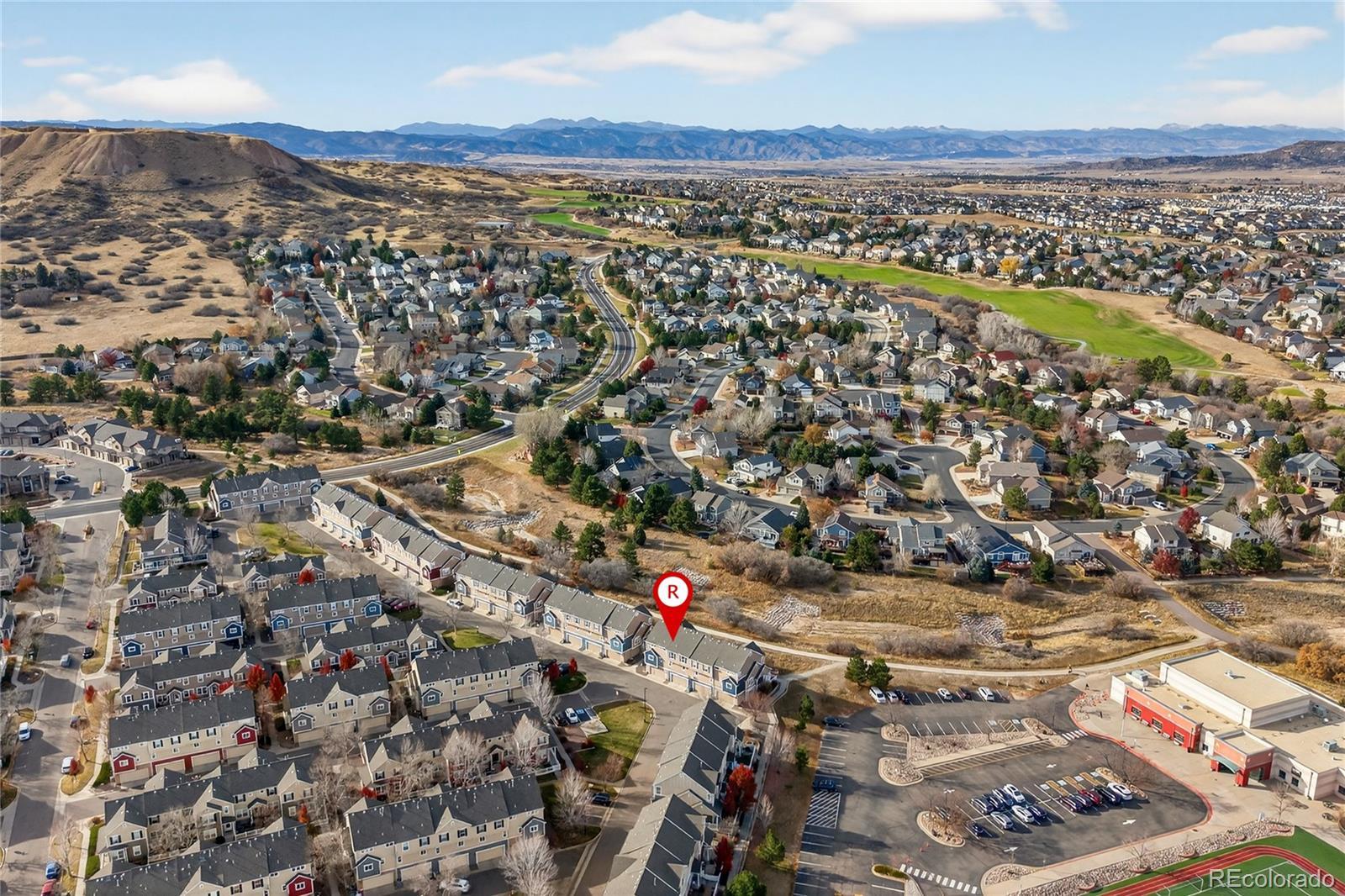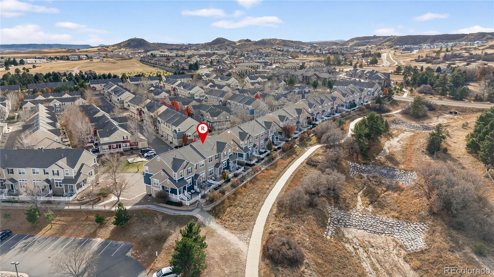 Welcome to this beautifully maintained townhome in Red Hawk! Perfectly positioned with open space and walking trails right out front, this gem offers a peaceful setting that feels tucked into nature while keeping you close to everything. Downtown Castle Rock is just minutes away, giving you easy access to shops, entertainment, and some of the area’s best restaurants. Surrounded by parks and open areas, the home makes it easy to enjoy morning walks or spot wildlife right outside your door. Thoughtfully cared for and designed for both comfort and style, the home’s living room features tall ceilings and modern laminate flooring that catch the light beautifully, creating an airy, welcoming atmosphere. Just a few steps up, the dining area opens to a bright kitchen with stainless steel appliances, granite countertops, and a crisp subway tile backsplash that adds a modern touch. A built-in home office with cabinetry provides a quiet, efficient space for work or organization, and a conveniently located half bath is perfect for guests. Upstairs, the primary suite offers a private retreat with scenic views, a walk-in closet, and its own ensuite bath. Two additional bedrooms share a full bathroom. Outside, a fenced front yard provides a pleasant place to relax, and the attached two-car garage adds convenience for parking and storage. From the front of the home, enjoy views of the city lights in the evening, while the nearby retention pond offers the soothing sound of running water. The neighborhood’s close-knit feel encourages connection among neighbors while maintaining a peaceful sense of space. With schools nearby and parks all around, this home is truly a must-see!