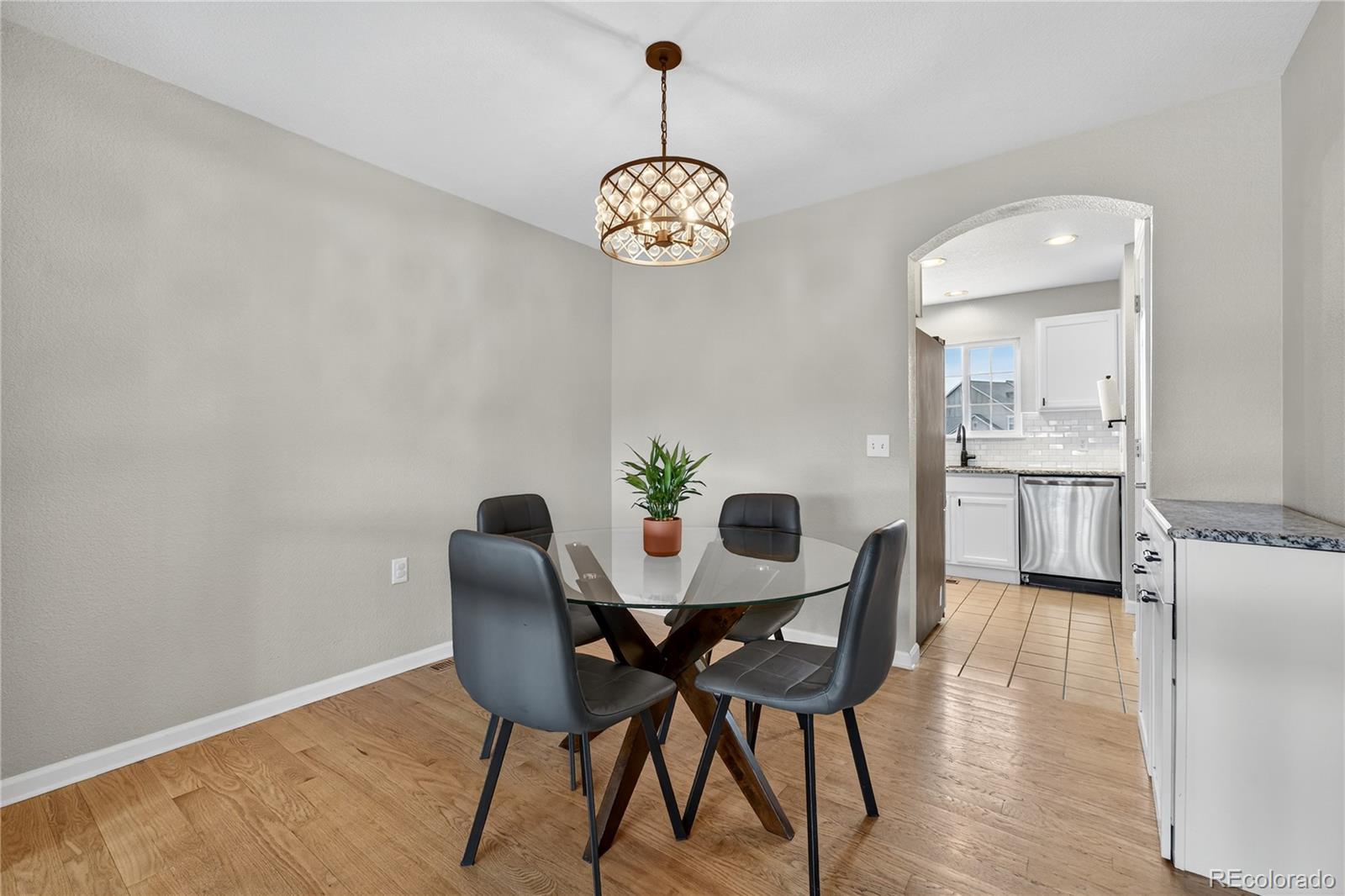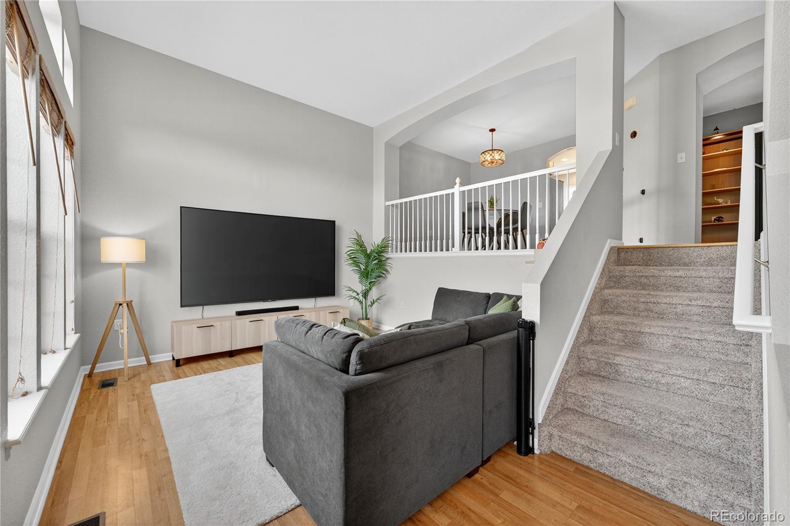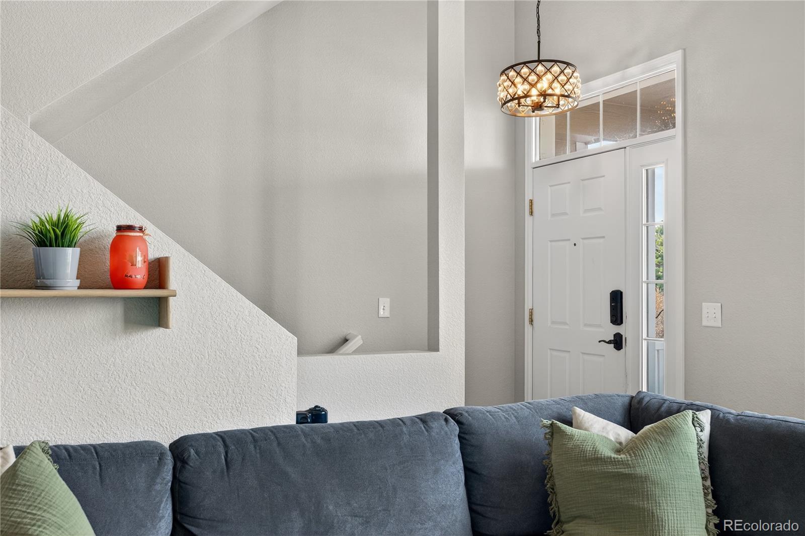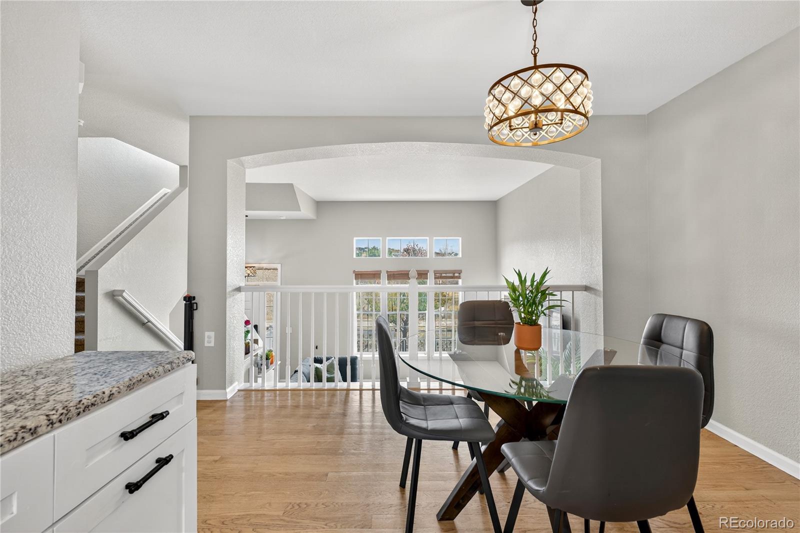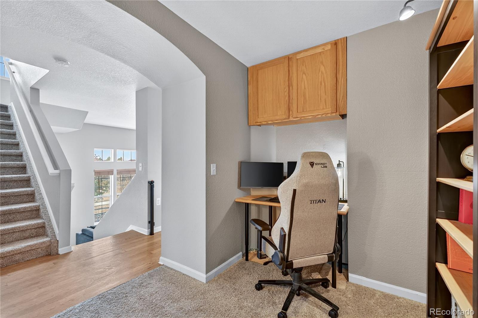 Welcome to this beautifully maintained townhome in Red Hawk! Perfectly positioned with open space and walking trails right out front, this gem offers a peaceful setting that feels tucked into nature while keeping you close to everything. Downtown Castle Rock is just minutes away, giving you easy access to shops, entertainment, and some of the area’s best restaurants. Surrounded by parks and open areas, the home makes it easy to enjoy morning walks or spot wildlife right outside your door. Thoughtfully cared for and designed for both comfort and style, the home’s living room features tall ceilings and modern laminate flooring that catch the light beautifully, creating an airy, welcoming atmosphere. Just a few steps up, the dining area opens to a bright kitchen with stainless steel appliances, granite countertops, and a crisp subway tile backsplash that adds a modern touch. A built-in home office with cabinetry provides a quiet, efficient space for work or organization, and a conveniently located half bath is perfect for guests. Upstairs, the primary suite offers a private retreat with scenic views, a walk-in closet, and its own ensuite bath. Two additional bedrooms share a full bathroom. Outside, a fenced front yard provides a pleasant place to relax, and the attached two-car garage adds convenience for parking and storage. From the front of the home, enjoy views of the city lights in the evening, while the nearby retention pond offers the soothing sound of running water. The neighborhood’s close-knit feel encourages connection among neighbors while maintaining a peaceful sense of space. With schools nearby and parks all around, this home is truly a must-see!