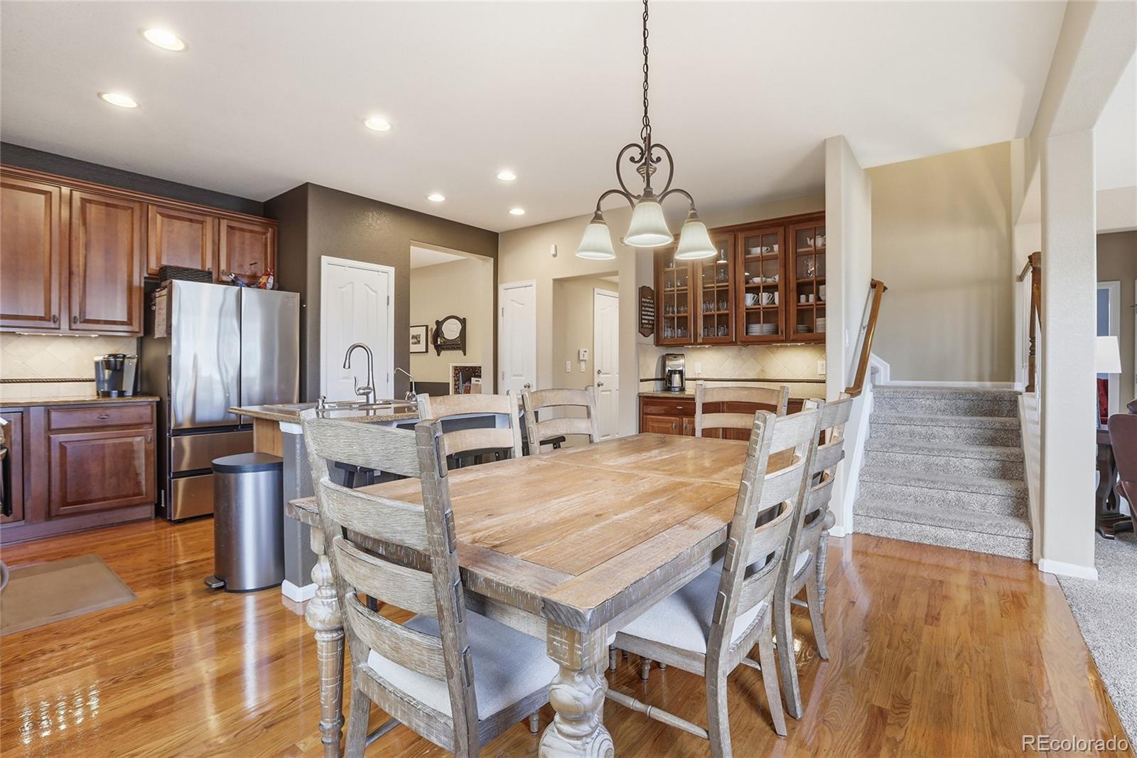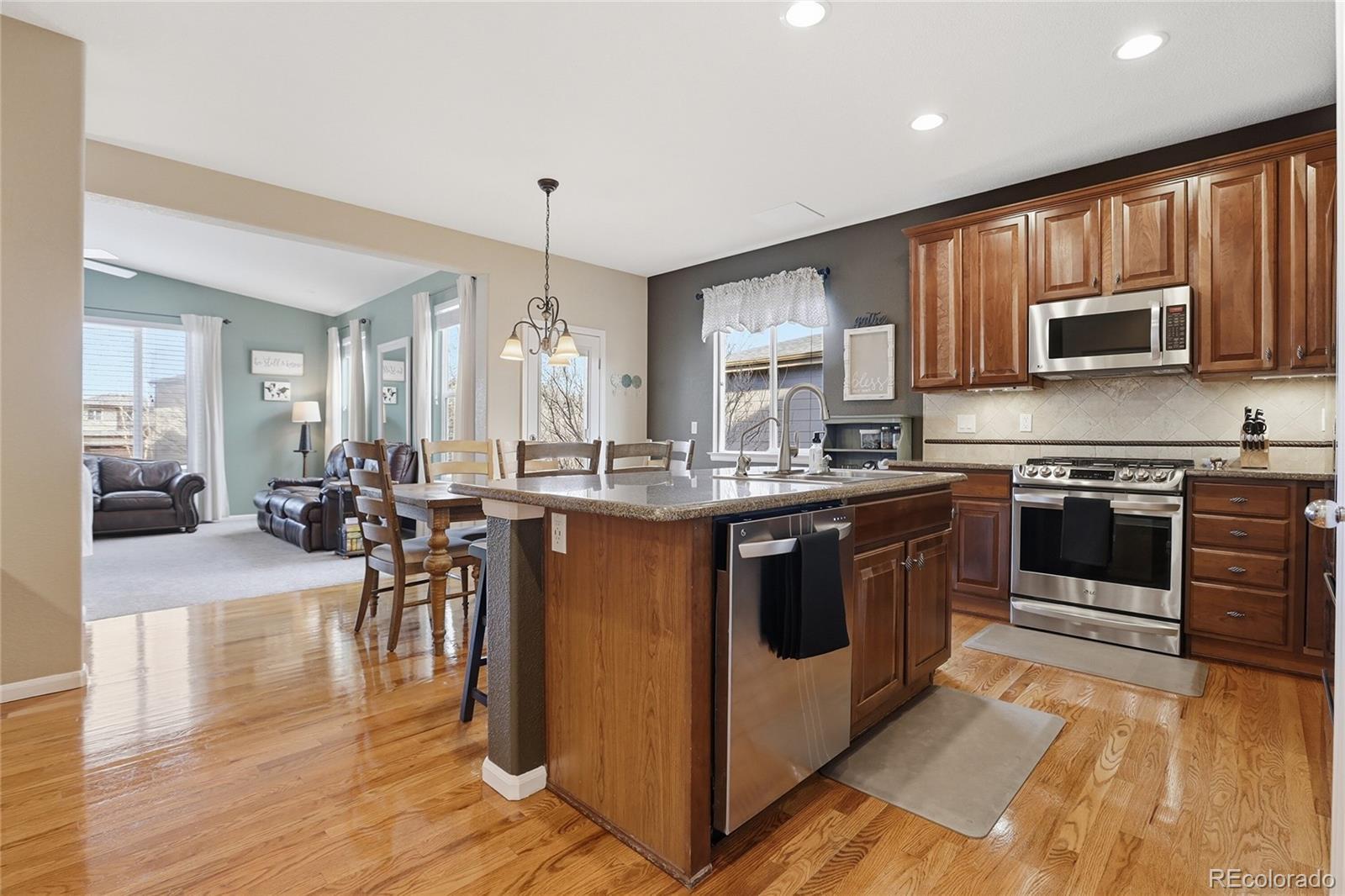Welcome to this beautifully maintained two-story home in the highly desirable Reunion community of Commerce City. Located at 10105 Sedalia Street, this spacious home offers 5 bedrooms and 4 bathrooms with a flexible layout designed for everyday living and hosting guests. Just inside the front door, a bright sitting room provides a versatile space perfect for a music room, library, office, or playroom. The open main level flows into the kitchen and living areas, creating a comfortable gathering space. The kitchen features granite countertops, stainless steel appliances, a tile backsplash, cherry cabinetry, and a convenient butler’s pantry. Much of the main floor includes newly coated hardwood flooring, and the laundry room is conveniently located on the main level. The home also includes a water softener and a reverse osmosis drinking water filtration system. A main-floor bedroom and full bathroom provide an ideal private space for guests or multi-generational living. Upstairs, the spacious primary suite includes a five-piece bath and generous closet space. Two additional bedrooms share a Jack and Jill bathroom, and several upstairs rooms offer beautiful mountain views. The recently finished basement adds even more living space with a bedroom, bathroom, and family room—perfect for movie nights, hobbies, or guests. The backyard features thoughtful landscaping with established perennial plants and a beautiful paver patio ideal for relaxing or entertaining. Just a short walk away is open space with expansive western views. Reunion is a thoughtfully planned community with parks, pools, ponds, trails, green space, and a recreation center with fitness facilities, youth programs, and community events. The neighborhood coffee house is just down the street, and Landmark Academy charter school is only minutes away. Conveniently located near DIA and within easy reach of Denver, this home offers the perfect balance of quiet neighborhood living and city accessibility.