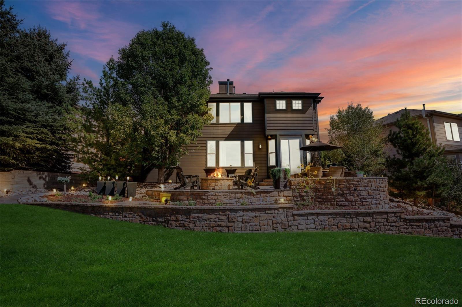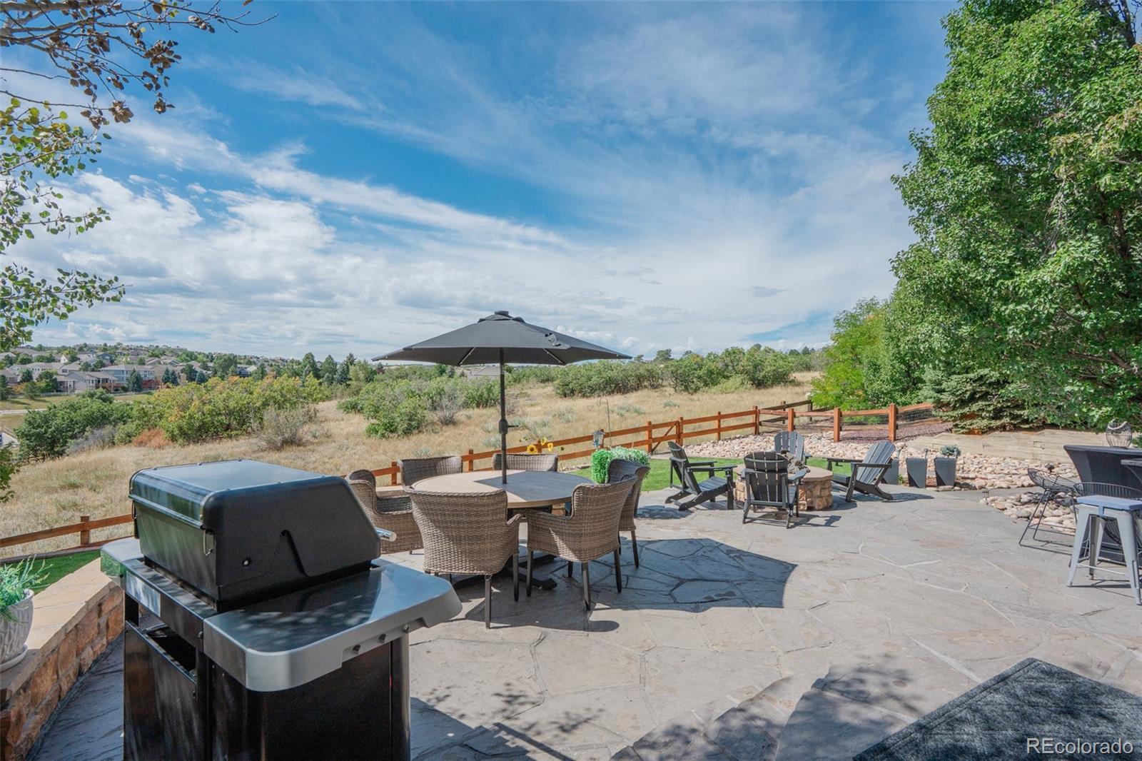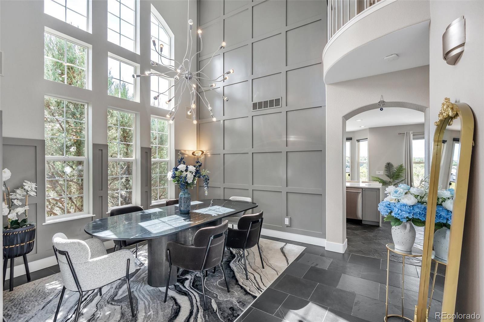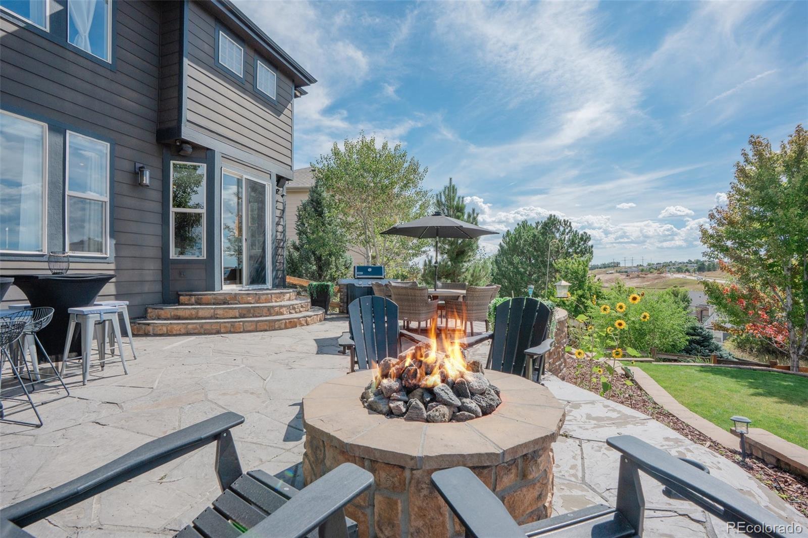Welcome home to this beautiful move-in ready home backing to dedicated open space! Upon driving up, the curb appeal and updates will beckon you to go inside. Entering into this foyer, you'll immediately notice the abundance of natural light and the slate floors throughout with the dramatic rotunda. The living room to your right looks out to the front yard and is a versatile space that could be used as an office. Continuing in, the dining room with the soaring 2 story ceilings, custom wall treatment & one of a kind chandelier along with a wall of windows is a wonderful space for year-round gatherings. Entering into the heart of the home, you'll be greeted by the adjoining refreshed kitchen and family room. The large center island w/quartz counter is perfect to hang out plus you can wash dishes with a view to the open space! The kitchen nook is ideal for informal dining and gathering. You will love the oversized family room is large enough to accommodate the family while you enjoy the marble tile surround fireplace. Upstairs, walking through the double door entry into the primary suite, the vaulted ceilings, views to the open space and adjoining five-piece bathroom are paired w/engineered hardwood floors and tile in the bath. Primary bath is complete with dual vanities, large soaking tub, sep. shower and a custom walk-in closet. There are 3 additional bedrooms upstairs along with another full bath. The 2nd floor laundry room is complete w/cabinets & utility sink. In the basement you'll encounter unfinished space for your future living space & lined crawl space for more storage. Outside, you will love the lg flagstone patio with a seating wall, gas fire pit, lounging and dining areas, along with direct access to the open space, allowing you to easily access the trail system throughout the Castle Pines community. The neighborhood includes pool, clubhouse, park, pickleball courts, & more! Don't wait, see this home today!