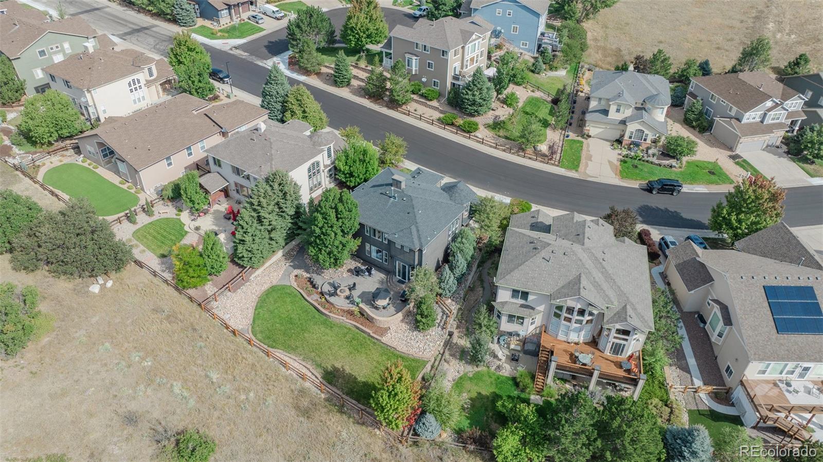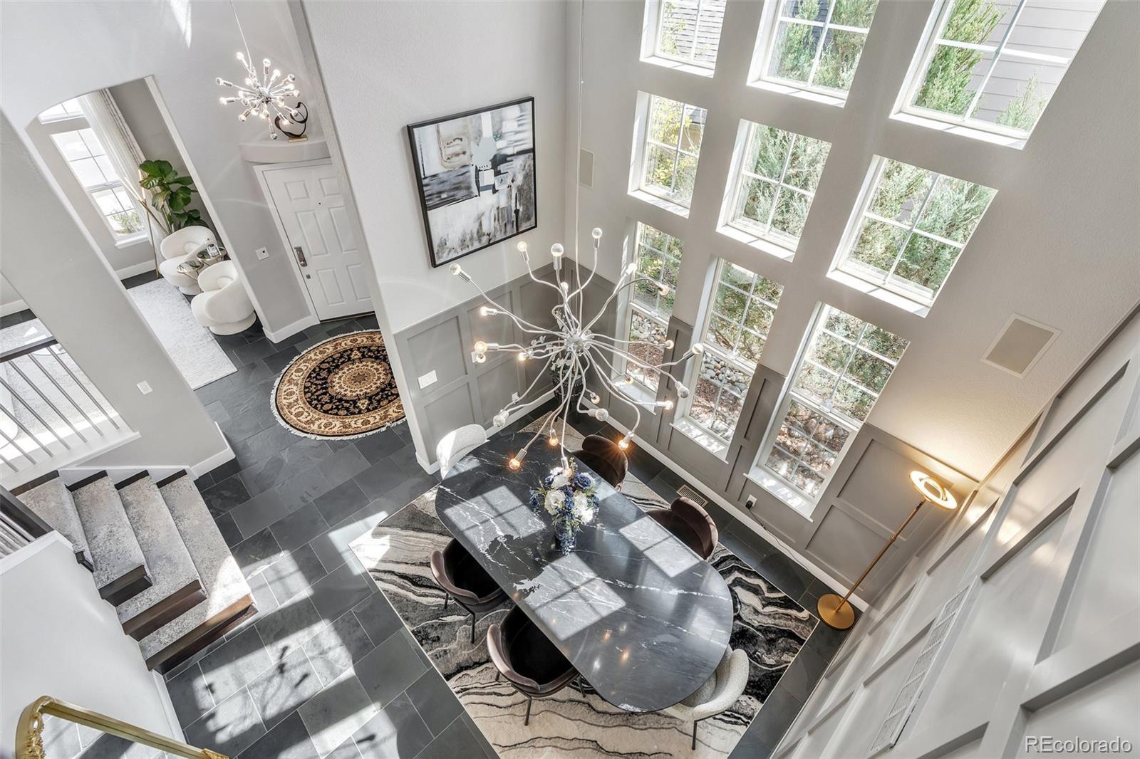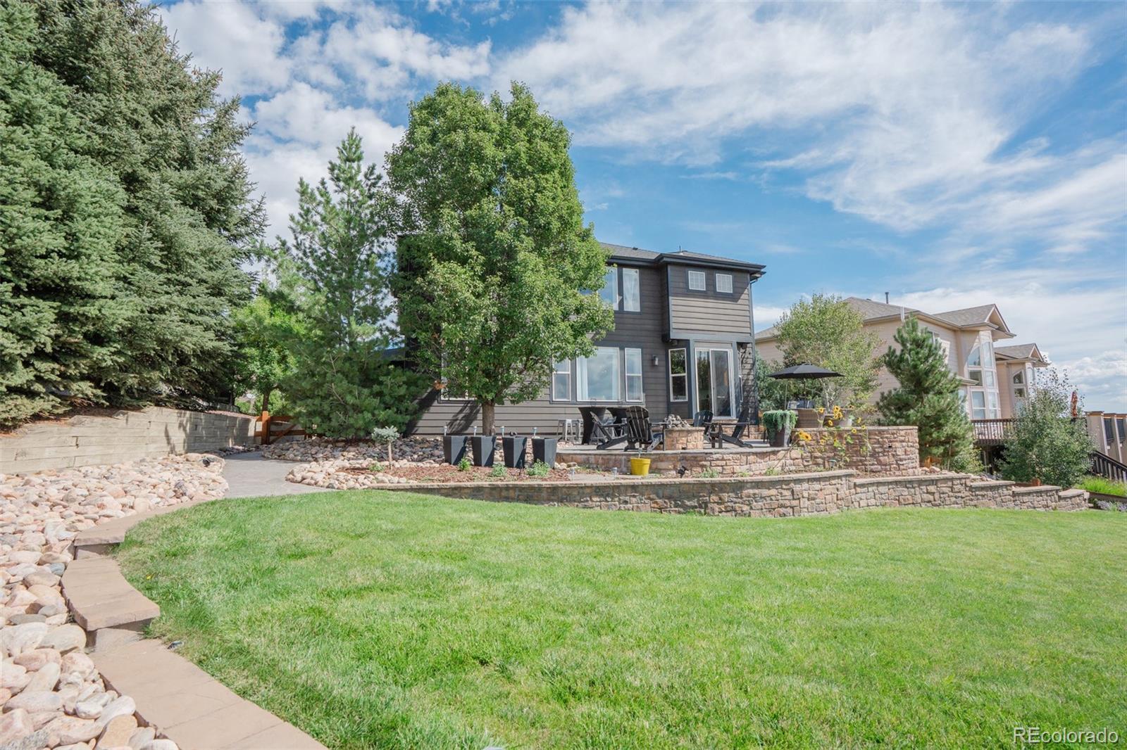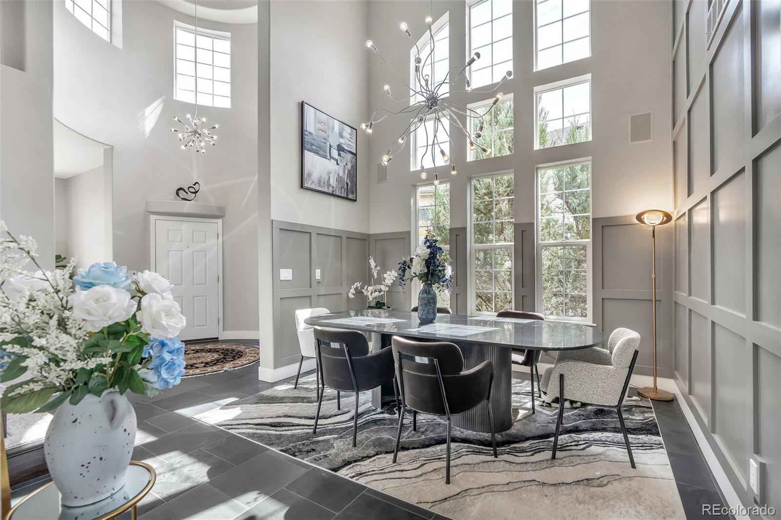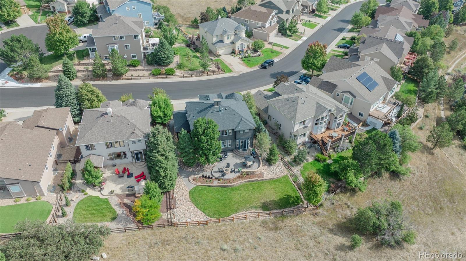 Welcome home to this beautiful move-in ready home backing to dedicated open space! Upon driving up, the curb appeal and updates will beckon you to go inside. Entering into this foyer, you'll immediately notice the abundance of natural light and the slate floors throughout with the dramatic rotunda. The living room to your right looks out to the front yard and is a versatile space that could be used as an office. Continuing in, the dining room with the soaring 2 story ceilings, custom wall treatment & one of a kind chandelier along with a wall of windows is a wonderful space for year-round gatherings. Entering into the heart of the home, you'll be greeted by the adjoining refreshed kitchen and family room. The large center island w/quartz counter is perfect to hang out plus you can wash dishes with a view to the open space! The kitchen nook is ideal for informal dining and gathering. You will love the oversized family room is large enough to accommodate the family while you enjoy the marble tile surround fireplace. Upstairs, walking through the double door entry into the primary suite, the vaulted ceilings, views to the open space and adjoining five-piece bathroom are paired w/engineered hardwood floors and tile in the bath. Primary bath is complete with dual vanities, large soaking tub, sep. shower and a custom walk-in closet. There are 3 additional bedrooms upstairs along with another full bath. The 2nd floor laundry room is complete w/cabinets & utility sink. In the basement you'll encounter unfinished space for your future living space & lined crawl space for more storage. Outside, you will love the lg flagstone patio with a seating wall, gas fire pit, lounging and dining areas, along with direct access to the open space, allowing you to easily access the trail system throughout the Castle Pines community. The neighborhood includes pool, clubhouse, park, pickleball courts, & more! Don't wait, see this home today!