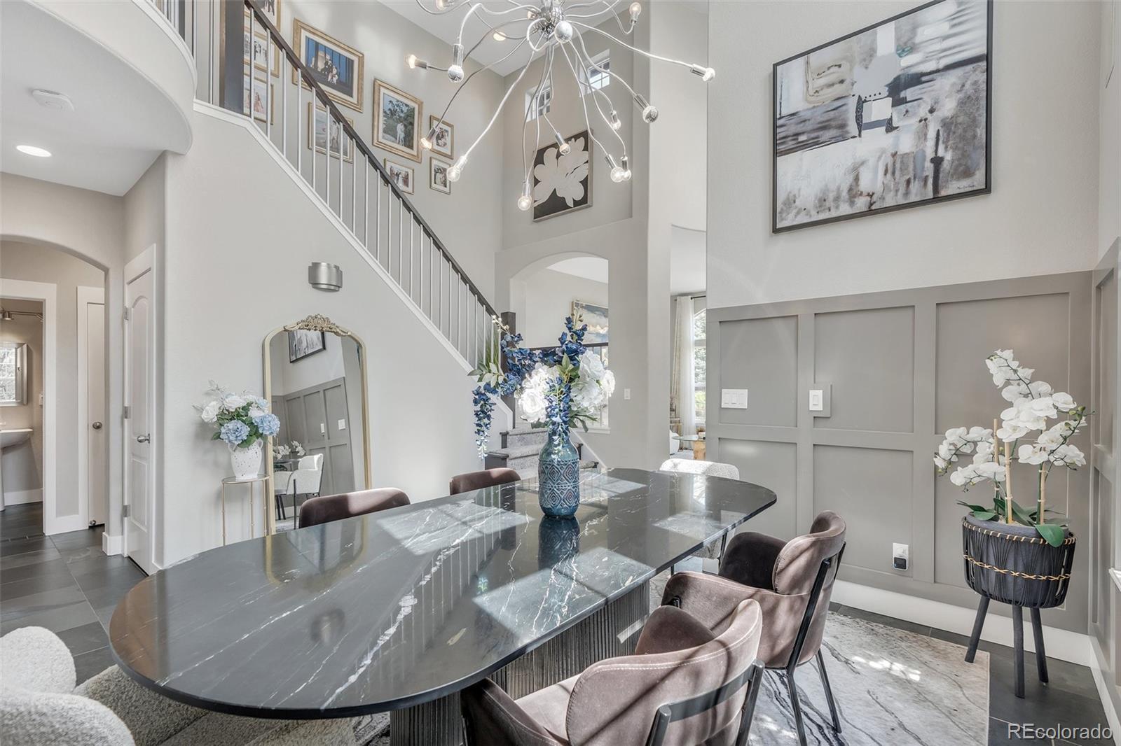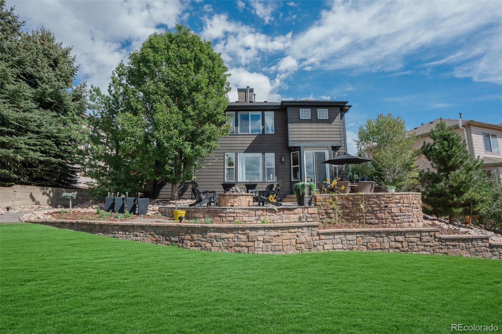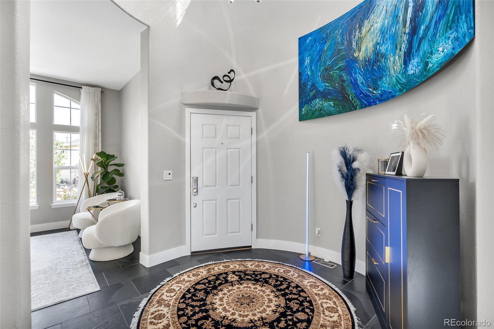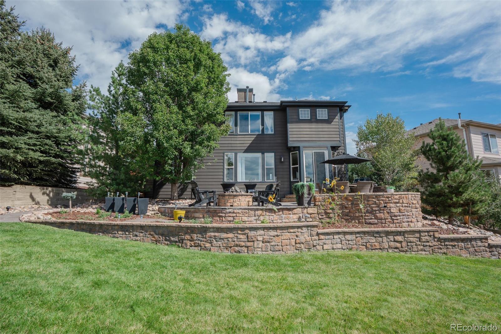 Welcome home to this beautiful move-in ready home backing to dedicated open space! Upon driving up, the curb appeal and updates will beckon you to go inside. Entering into this foyer, you'll immediately notice the abundance of natural light and the slate floors throughout with the dramatic rotunda. The living room to your right looks out to the front yard and is a versatile space that could be used as an office. Continuing in, the dining room with the soaring 2 story ceilings, custom wall treatment & one of a kind chandelier along with a wall of windows is a wonderful space for year-round gatherings. Entering into the heart of the home, you'll be greeted by the adjoining refreshed kitchen and family room. The large center island w/quartz counter is perfect to hang out plus you can wash dishes with a view to the open space! The kitchen nook is ideal for informal dining and gathering. You will love the oversized family room is large enough to accommodate the family while you enjoy the marble tile surround fireplace. Upstairs, walking through the double door entry into the primary suite, the vaulted ceilings, views to the open space and adjoining five-piece bathroom are paired w/engineered hardwood floors and tile in the bath. Primary bath is complete with dual vanities, large soaking tub, sep. shower and a custom walk-in closet. There are 3 additional bedrooms upstairs along with another full bath. The 2nd floor laundry room is complete w/cabinets & utility sink. In the basement you'll encounter unfinished space for your future living space & lined crawl space for more storage. Outside, you will love the lg flagstone patio with a seating wall, gas fire pit, lounging and dining areas, along with direct access to the open space, allowing you to easily access the trail system throughout the Castle Pines community. The neighborhood includes pool, clubhouse, park, pickleball courts, & more! Don't wait, see this home today!