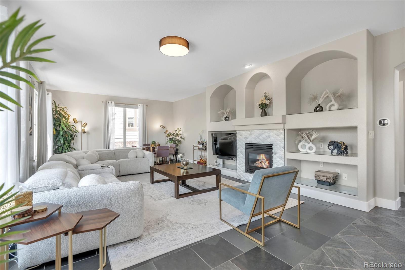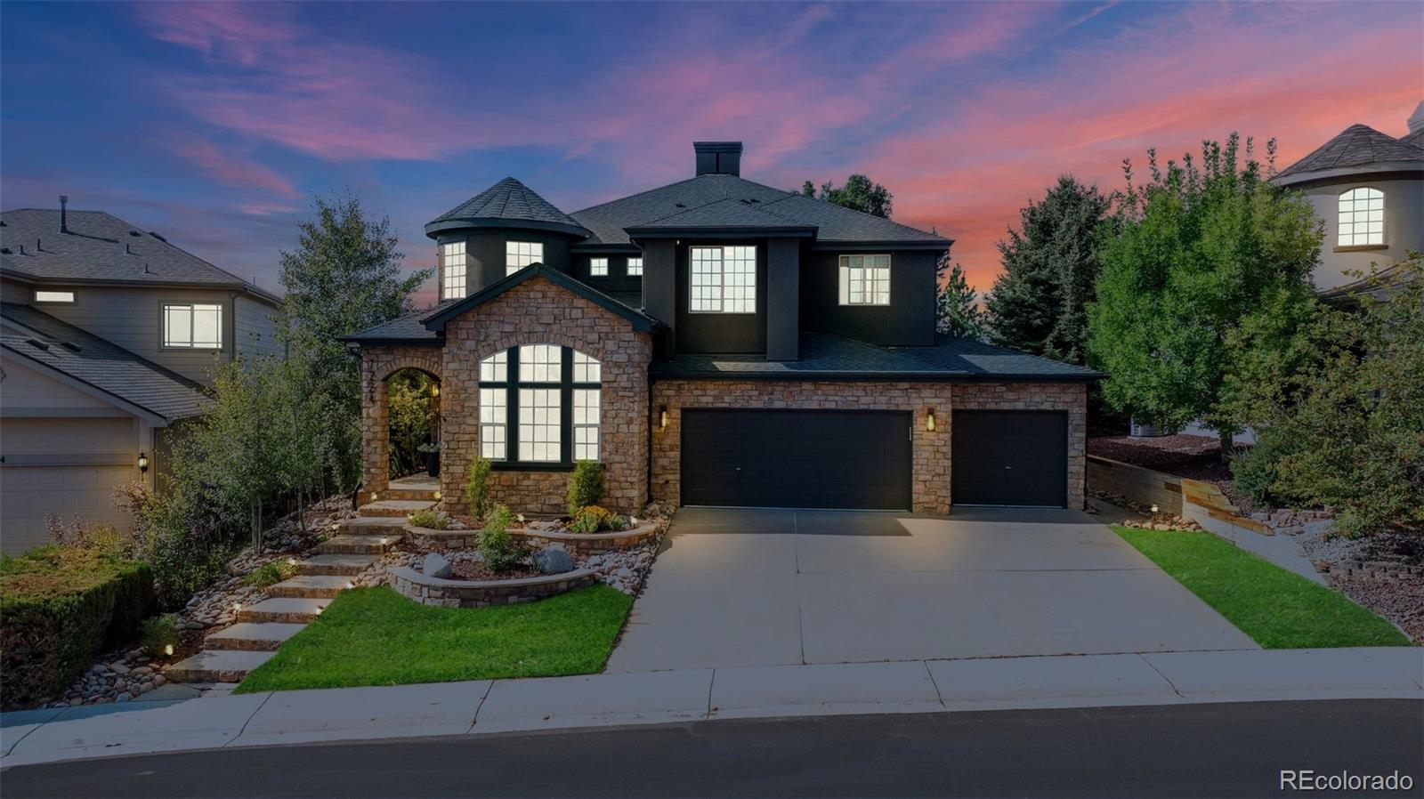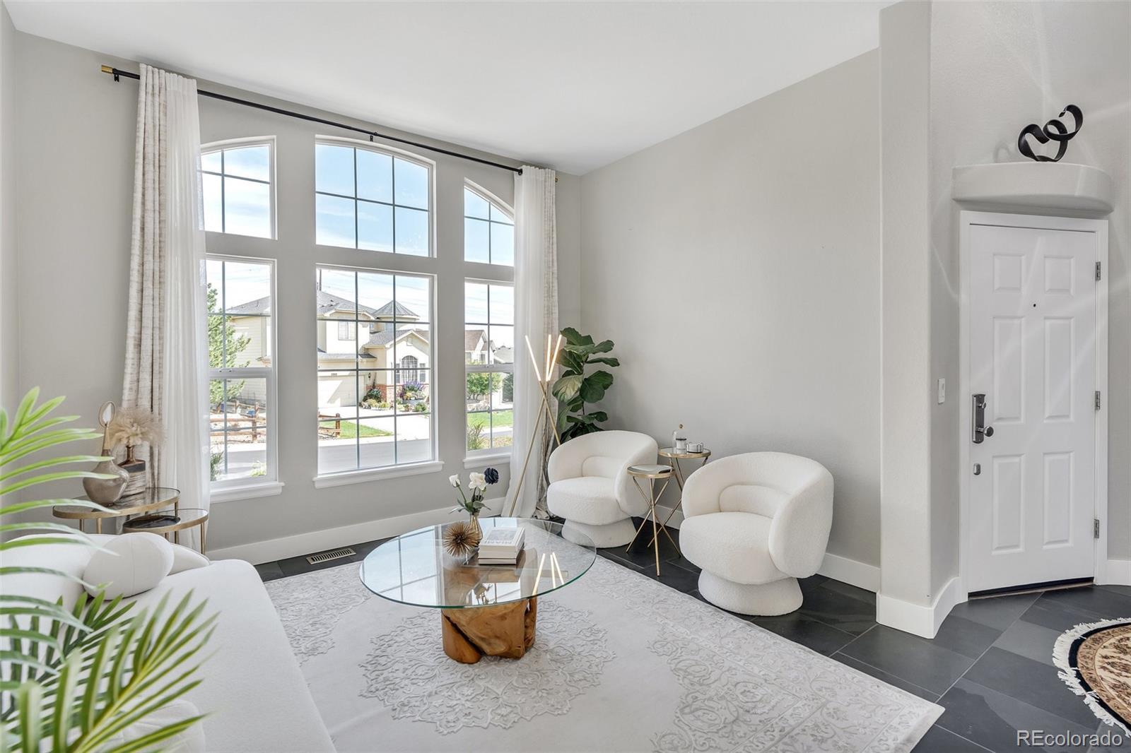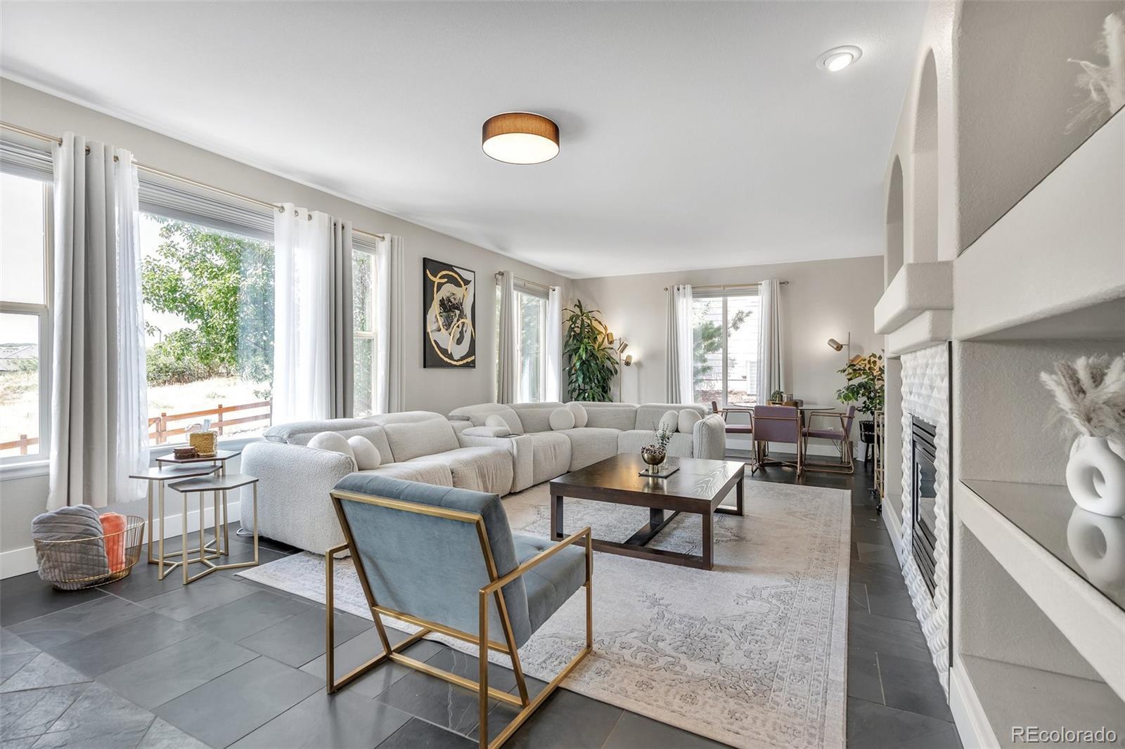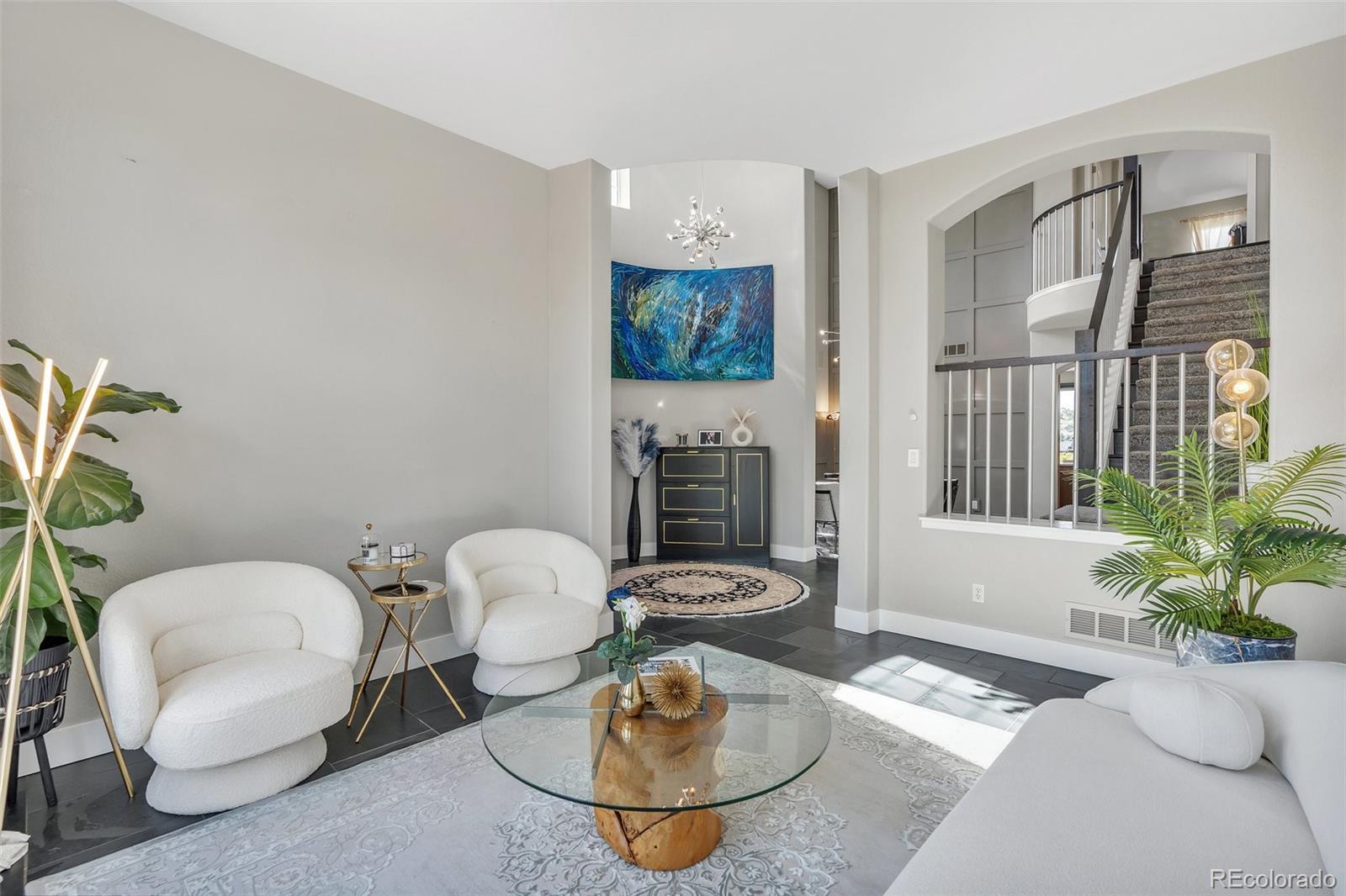 Welcome home to this beautiful move-in ready home backing to dedicated open space! Upon driving up, the curb appeal and updates will beckon you to go inside. Entering into this foyer, you'll immediately notice the abundance of natural light and the slate floors throughout with the dramatic rotunda. The living room to your right looks out to the front yard and is a versatile space that could be used as an office. Continuing in, the dining room with the soaring 2 story ceilings, custom wall treatment & one of a kind chandelier along with a wall of windows is a wonderful space for year-round gatherings. Entering into the heart of the home, you'll be greeted by the adjoining refreshed kitchen and family room. The large center island w/quartz counter is perfect to hang out plus you can wash dishes with a view to the open space! The kitchen nook is ideal for informal dining and gathering. You will love the oversized family room is large enough to accommodate the family while you enjoy the marble tile surround fireplace. Upstairs, walking through the double door entry into the primary suite, the vaulted ceilings, views to the open space and adjoining five-piece bathroom are paired w/engineered hardwood floors and tile in the bath. Primary bath is complete with dual vanities, large soaking tub, sep. shower and a custom walk-in closet. There are 3 additional bedrooms upstairs along with another full bath. The 2nd floor laundry room is complete w/cabinets & utility sink. In the basement you'll encounter unfinished space for your future living space & lined crawl space for more storage. Outside, you will love the lg flagstone patio with a seating wall, gas fire pit, lounging and dining areas, along with direct access to the open space, allowing you to easily access the trail system throughout the Castle Pines community. The neighborhood includes pool, clubhouse, park, pickleball courts, & more! Don't wait, see this home today!