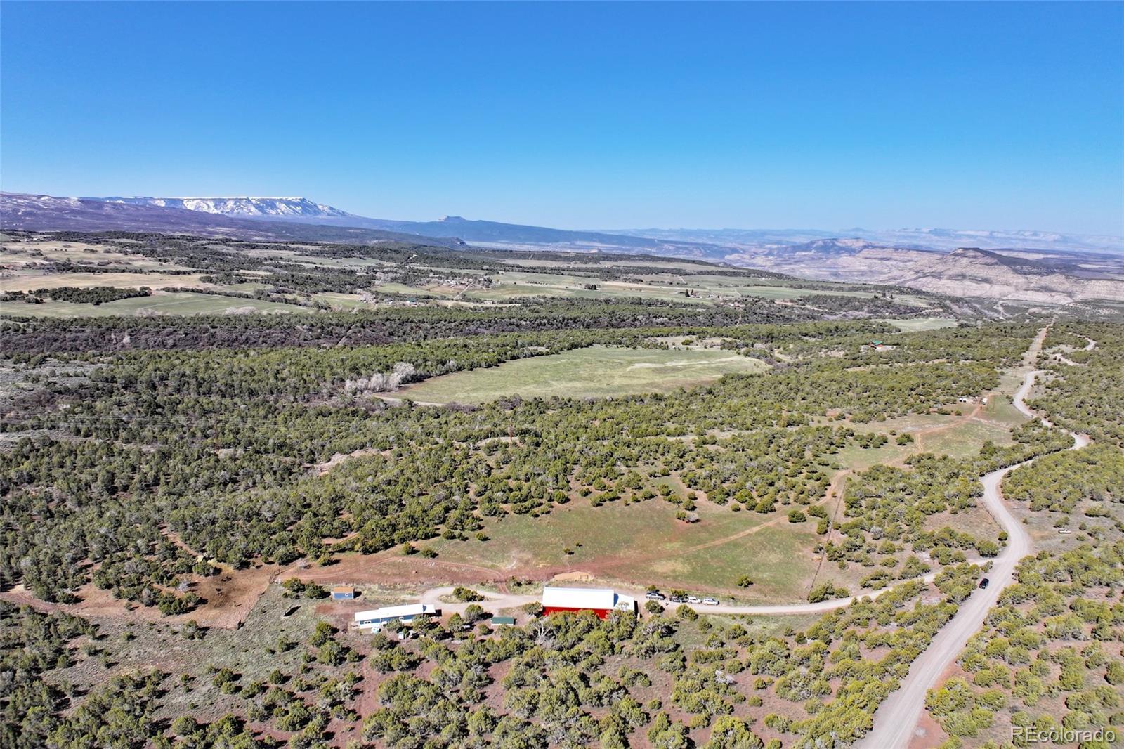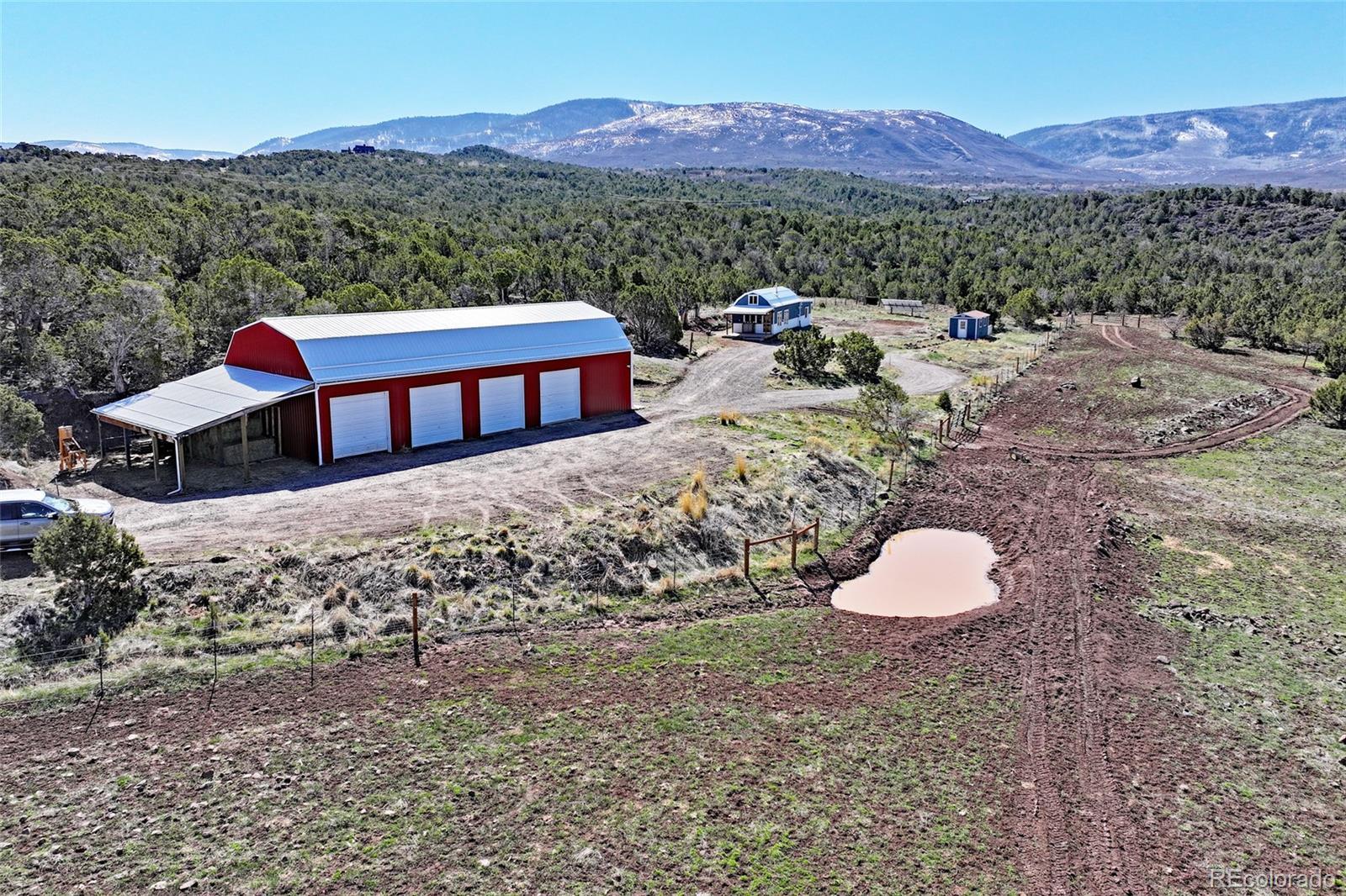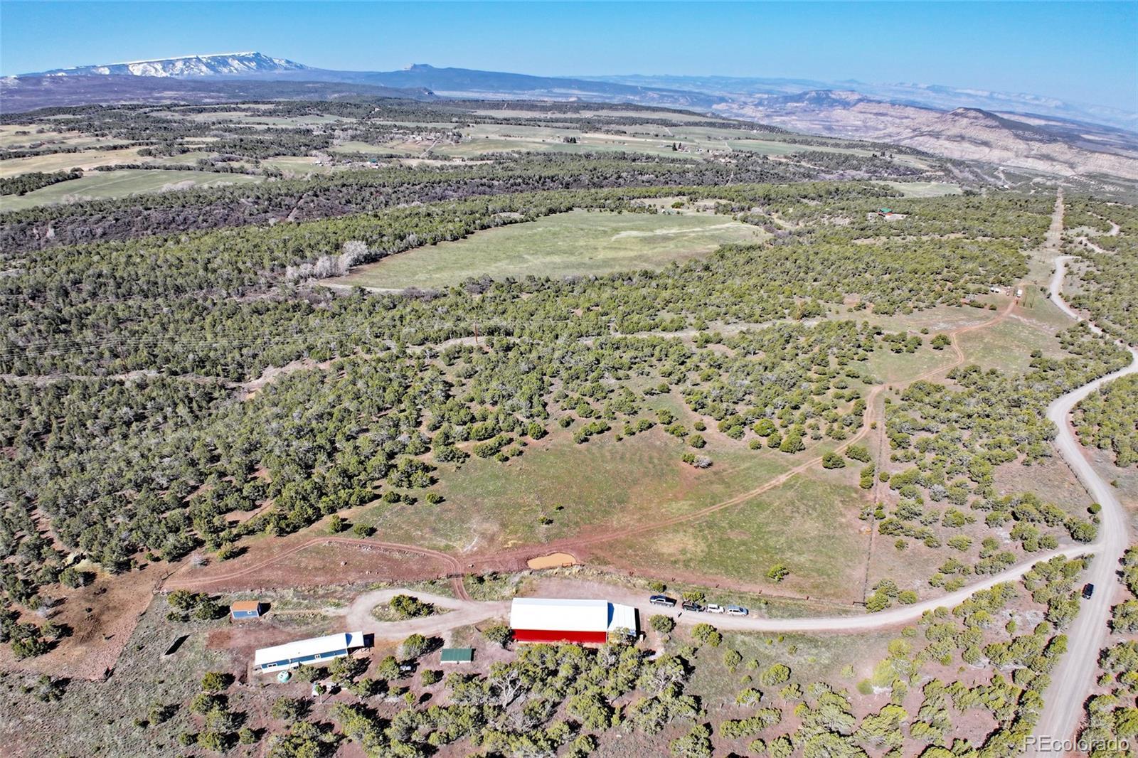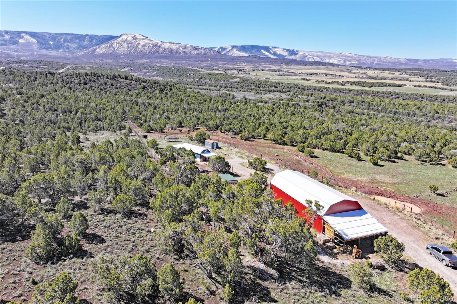 This Colorado off grid modern homestead built in 2018 is move-in ready for your "get-away-from-it-all" dreams. The large graveled drive leads down past the 2,100 sq ft shop to the cute and cozy 840 sq ft custom energy efficient home with one primary bedroom and one loft bedroom. The main living space features vaulted ceilings with custom pine tongue and groove walls and open concept living. Large double bay windows look out over the Grand Mesa giving this home views you'll never tire of. An additional heated and powered guest cabin expands sleeping quarters. The kitchen has a butcher block countertop, new dishwasher, refrigerator, gas range and chest freezer. The full bath includes a deep soak claw tub with shower and vanity. Laundry room area includes a full-size stackable washer and dryer. Step down into a spacious master bedroom with dual walk-in closets. Enjoy the gorgeous views out of the bedroom with the 10 foot wide double sliding glass door providing access to the outside sitting area. Wood stove, wall propane heat, instant hot water heater, concrete/ carpet flooring, recessed lighting, and ceiling fans create efficiency and ease in a country lifestyle. Electric is provided by an off grid solar system with a backup generator. Grid power is on site and can be connected if desired. The home is on a well and septic. Outside additions include a graveled circle drive with gate and security alarm, RV dump, chicken run with coop, and garden area with rain water collection. The 2,100 sq ft shop building has 4 bays, power, and extends with an additional 20x30 hay barn at the end. One bay has a concrete floor with windows and a single door entrance. The other 3 bays are gravel flooring. Ten foot overhead doors allow easy access for large vehicles, equipment and lots of storage area. The pastures are fenced, cross fenced and ready for livestock. Seasonal runoff fills 4 livestock ponds and there is a small spring fed pond.
