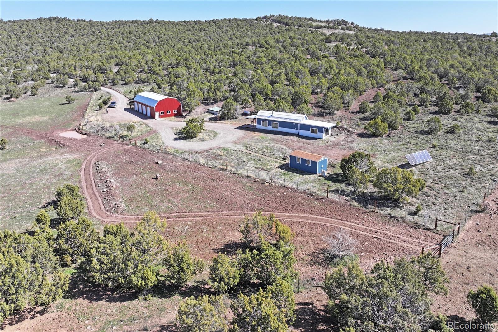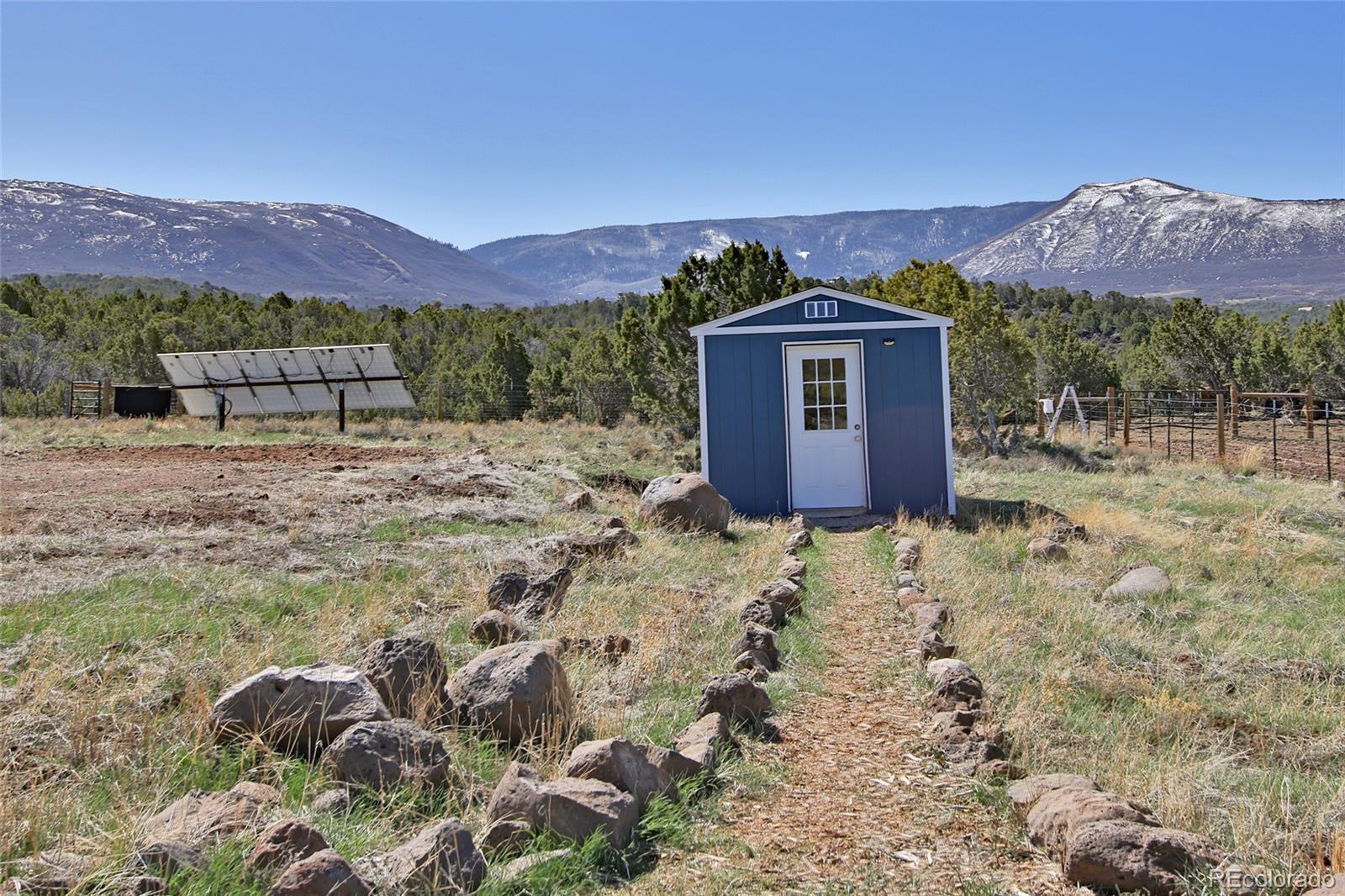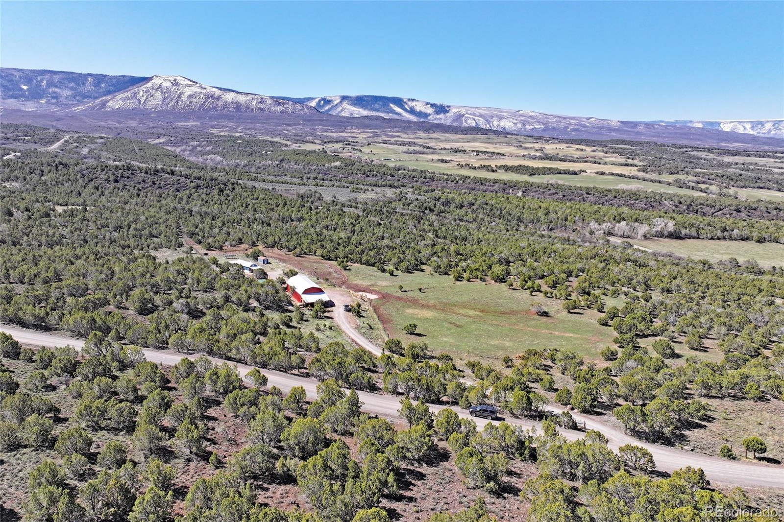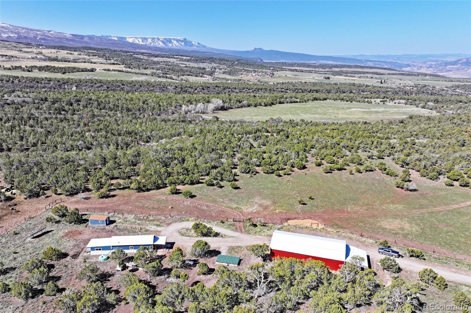 This Colorado off grid modern homestead built in 2018 is move-in ready for your "get-away-from-it-all" dreams. The large graveled drive leads down past the 2,100 sq ft shop to the cute and cozy 840 sq ft custom energy efficient home with one primary bedroom and one loft bedroom. The main living space features vaulted ceilings with custom pine tongue and groove walls and open concept living. Large double bay windows look out over the Grand Mesa giving this home views you'll never tire of. An additional heated and powered guest cabin expands sleeping quarters. The kitchen has a butcher block countertop, new dishwasher, refrigerator, gas range and chest freezer. The full bath includes a deep soak claw tub with shower and vanity. Laundry room area includes a full-size stackable washer and dryer. Step down into a spacious master bedroom with dual walk-in closets. Enjoy the gorgeous views out of the bedroom with the 10 foot wide double sliding glass door providing access to the outside sitting area. Wood stove, wall propane heat, instant hot water heater, concrete/ carpet flooring, recessed lighting, and ceiling fans create efficiency and ease in a country lifestyle. Electric is provided by an off grid solar system with a backup generator. Grid power is on site and can be connected if desired. The home is on a well and septic. Outside additions include a graveled circle drive with gate and security alarm, RV dump, chicken run with coop, and garden area with rain water collection. The 2,100 sq ft shop building has 4 bays, power, and extends with an additional 20x30 hay barn at the end. One bay has a concrete floor with windows and a single door entrance. The other 3 bays are gravel flooring. Ten foot overhead doors allow easy access for large vehicles, equipment and lots of storage area. The pastures are fenced, cross fenced and ready for livestock. Seasonal runoff fills 4 livestock ponds and there is a small spring fed pond.