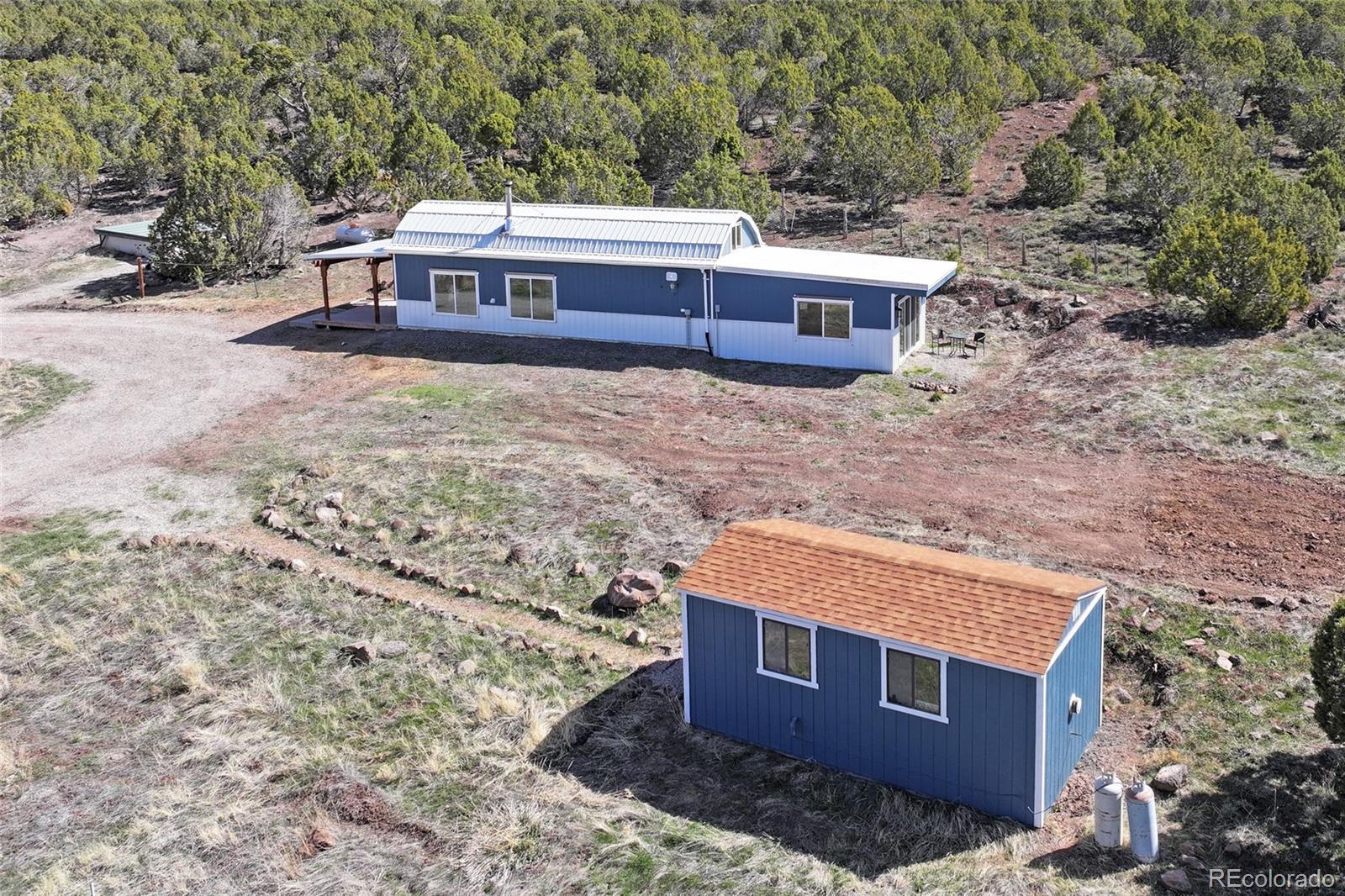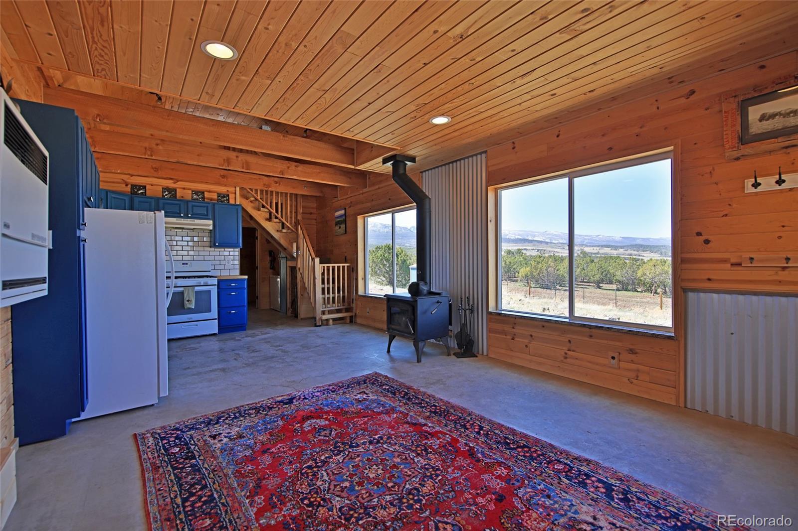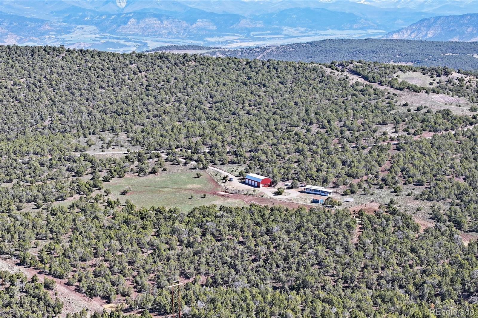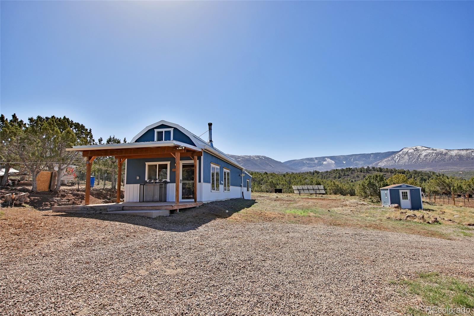 This Colorado off grid modern homestead built in 2018 is move-in ready for your "get-away-from-it-all" dreams. The large graveled drive leads down past the 2,100 sq ft shop to the cute and cozy 840 sq ft custom energy efficient home with one primary bedroom and one loft bedroom. The main living space features vaulted ceilings with custom pine tongue and groove walls and open concept living. Large double bay windows look out over the Grand Mesa giving this home views you'll never tire of. An additional heated and powered guest cabin expands sleeping quarters. The kitchen has a butcher block countertop, new dishwasher, refrigerator, gas range and chest freezer. The full bath includes a deep soak claw tub with shower and vanity. Laundry room area includes a full-size stackable washer and dryer. Step down into a spacious master bedroom with dual walk-in closets. Enjoy the gorgeous views out of the bedroom with the 10 foot wide double sliding glass door providing access to the outside sitting area. Wood stove, wall propane heat, instant hot water heater, concrete/ carpet flooring, recessed lighting, and ceiling fans create efficiency and ease in a country lifestyle. Electric is provided by an off grid solar system with a backup generator. Grid power is on site and can be connected if desired. The home is on a well and septic. Outside additions include a graveled circle drive with gate and security alarm, RV dump, chicken run with coop, and garden area with rain water collection. The 2,100 sq ft shop building has 4 bays, power, and extends with an additional 20x30 hay barn at the end. One bay has a concrete floor with windows and a single door entrance. The other 3 bays are gravel flooring. Ten foot overhead doors allow easy access for large vehicles, equipment and lots of storage area. The pastures are fenced, cross fenced and ready for livestock. Seasonal runoff fills 4 livestock ponds and there is a small spring fed pond.