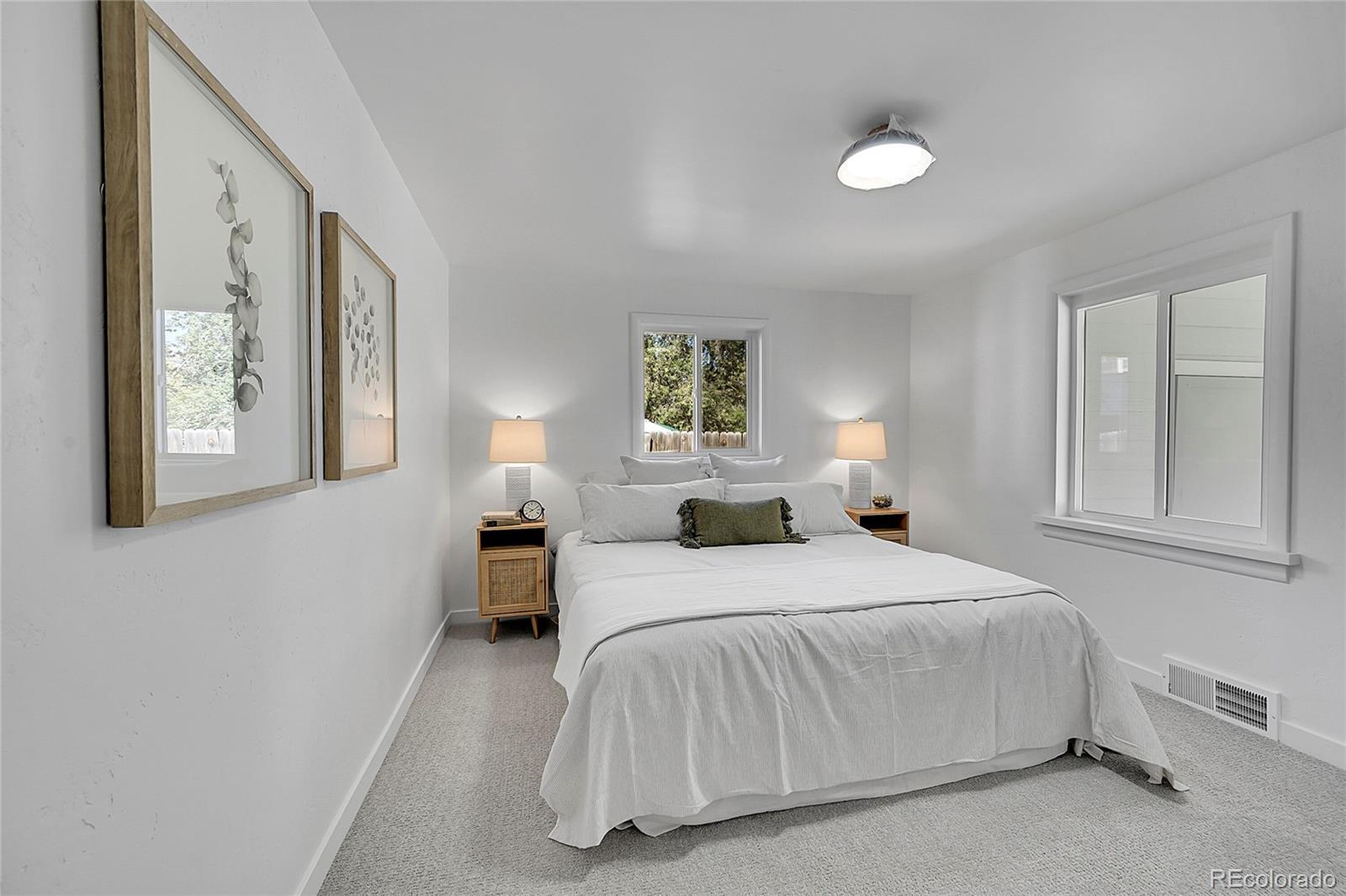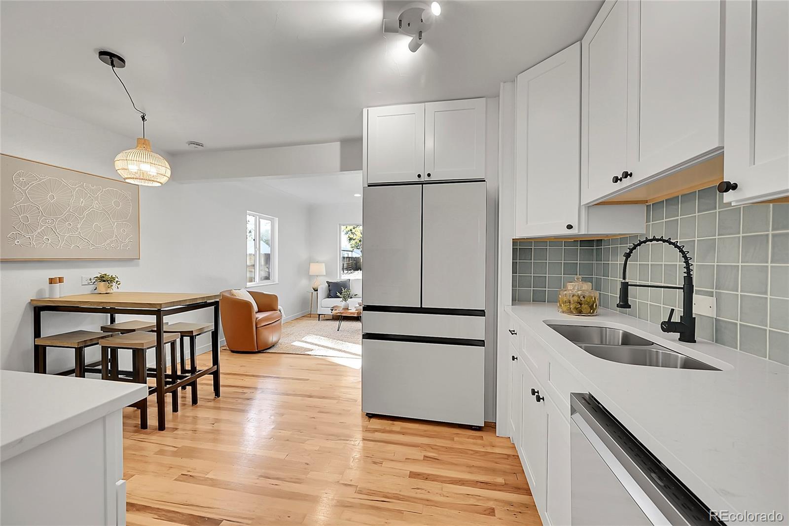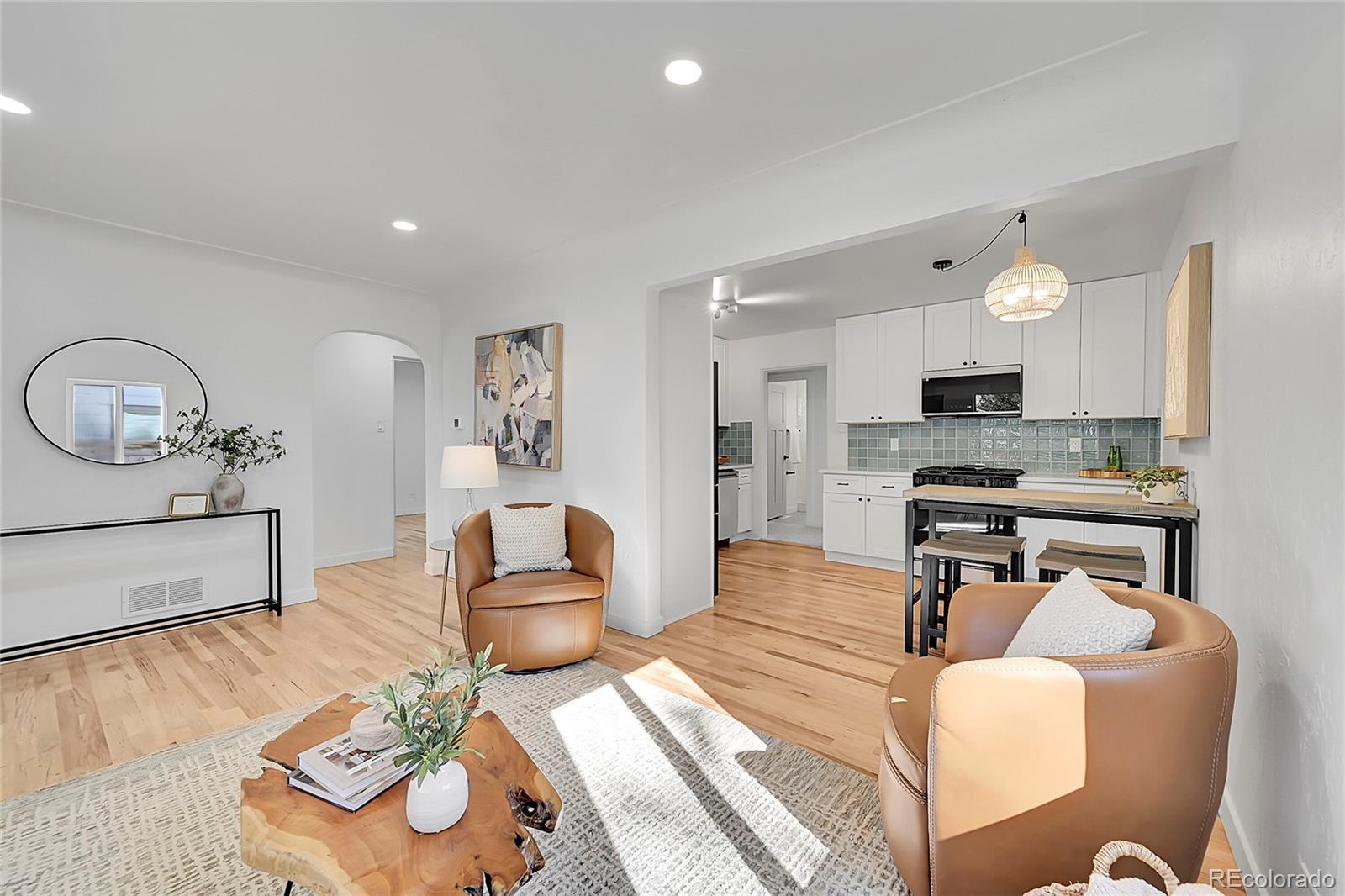Professionally designed, fully renovated and centrally located less than 10 mins from downtown Denver! With excellent curb appeal, new exterior paint, windows, front door, concrete walkway and landscaping, you'll be instantly impressed. Beautiful refinished hardwood flooring leads you into a brand new, open-concept kitchen featuring white shaker cabinetry, slab quartz countertops, designer tiled backsplash, high-end white Bespoke appliances, new hardware and faucet. Primary suite offers plush new carpet and a fully remodeled 3/4 bathroom with penny tiled floor, luxurious shower, new vanity, mirror and lighting. Two additional bedrooms with hardwood flooring, and a fully renovated full bathroom with new tile, bathtub, vanity, shower valve, vanity and mirror. Darling and functional laundry/mud room adds pantry and storage space with built-in white shaker cabinetry. The gorgeous backyard offers plenty of parking options including space for an RV, covered carport and large gravel lot with sliding gate. New fence, sod and fire pit, perfect for chilly winter nights and entertaining. Additional storage space on the side of the carport. This home has all new paint, doors, lighting, windows, furnace, water heater and central AC! Schedule your showing before it's too late.