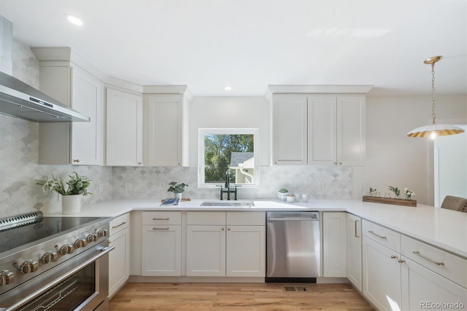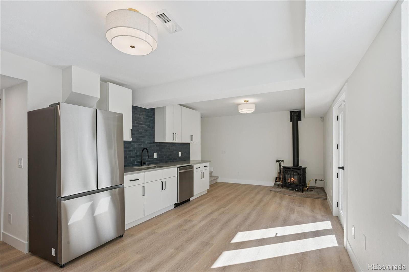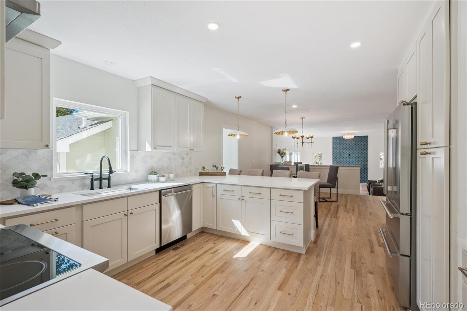 Welcome to this beautifully updated 5-bedroom, 4-bathroom home in the heart of Wheat Ridge, offering nearly 3,750 square feet of living space on a generous 0.6-acre lot. Built in 1998 and thoughtfully remodeled in 2025, this residence combines timeless curb appeal with modern upgrades. The main level features soaring ceilings, a spacious great room with a fireplace, and a gourmet kitchen with soft close cabinetry, quartz countertops, and luxury Forna appliances. The living area flows seamlessly to the patio and expansive backyard, perfect for entertaining. The primary suite is conveniently located on the main floor, complete with dual closets and a luxurious en suite bath with double vanities and a heated bidet seat. Upstairs, you’ll find three large bedrooms, each with built-in desks, plus a versatile bonus room ideal for a home office, playroom, or library. The finished walk-out basement offers a second kitchen, living area, and private bedroom with bath—perfect for multigenerational living, an au pair, or short-term rental income. Additional highlights include two home offices, a three-car oversized garage with RV parking, two fireplaces, and multiple “secret rooms” that add charm and character. The landscaped yard provides SO MUCH space for recreation, gardening, and gatherings, while the location offers quick access to Edgewater Market, Sloan’s Lake, and downtown Denver. This is a rare opportunity to own a spacious, move-in ready home on a large lot in a highly desirable Wheat Ridge neighborhood.