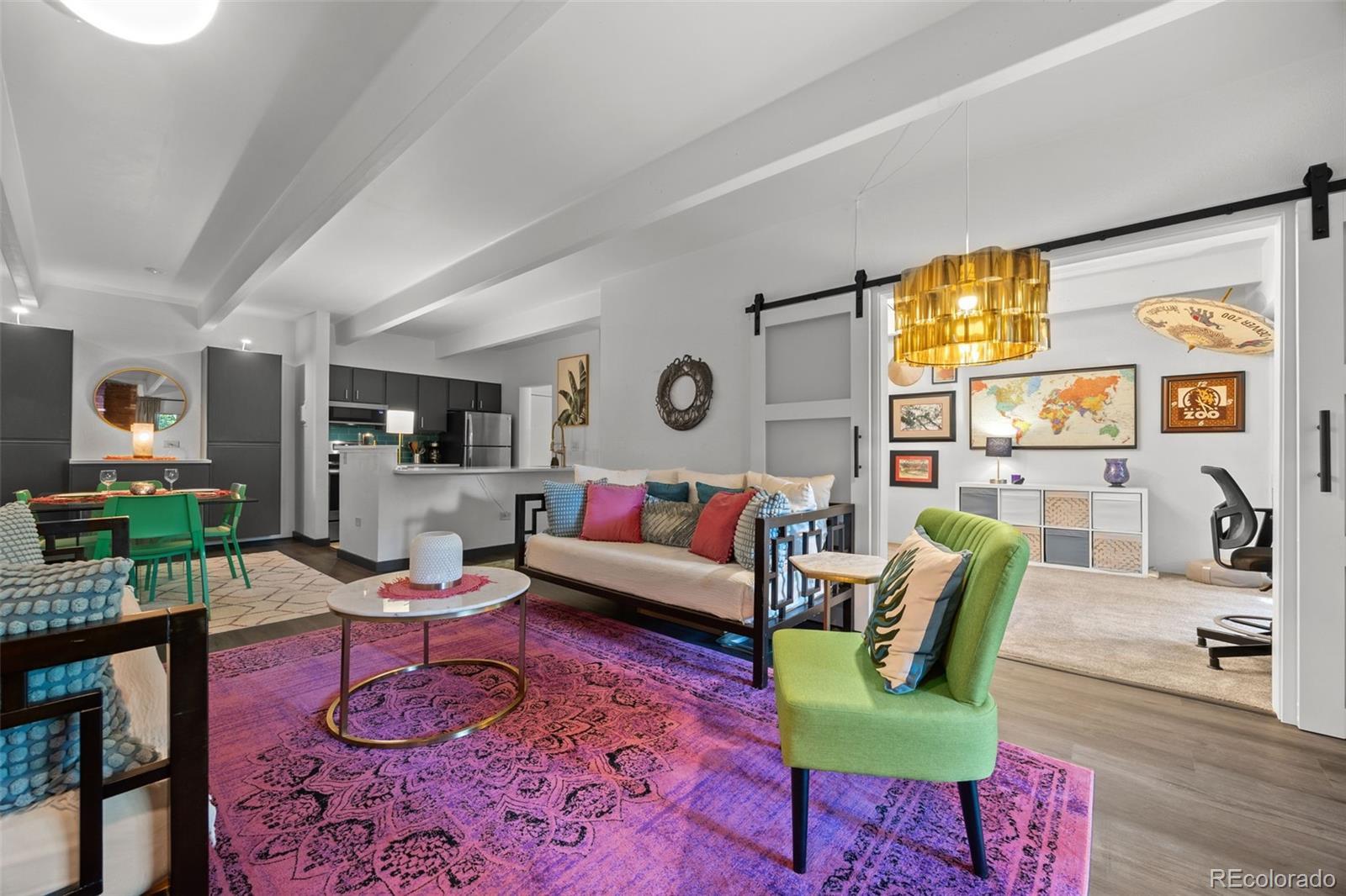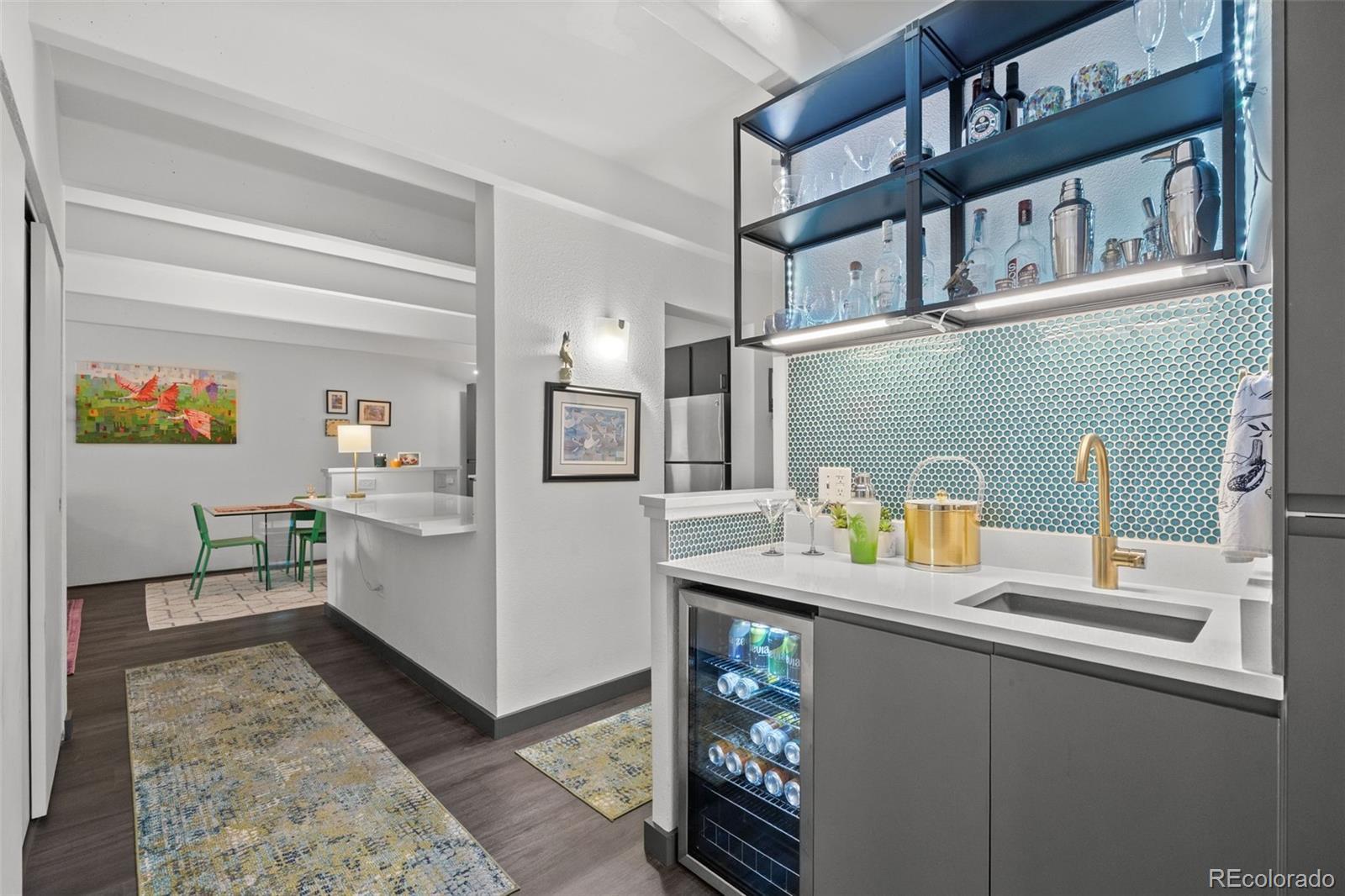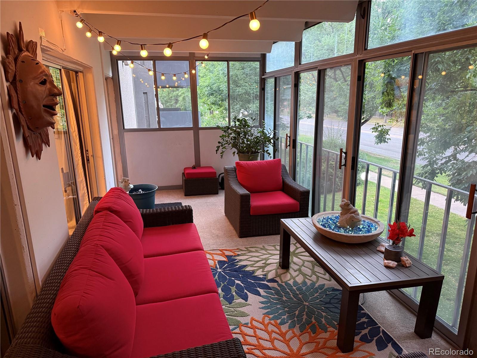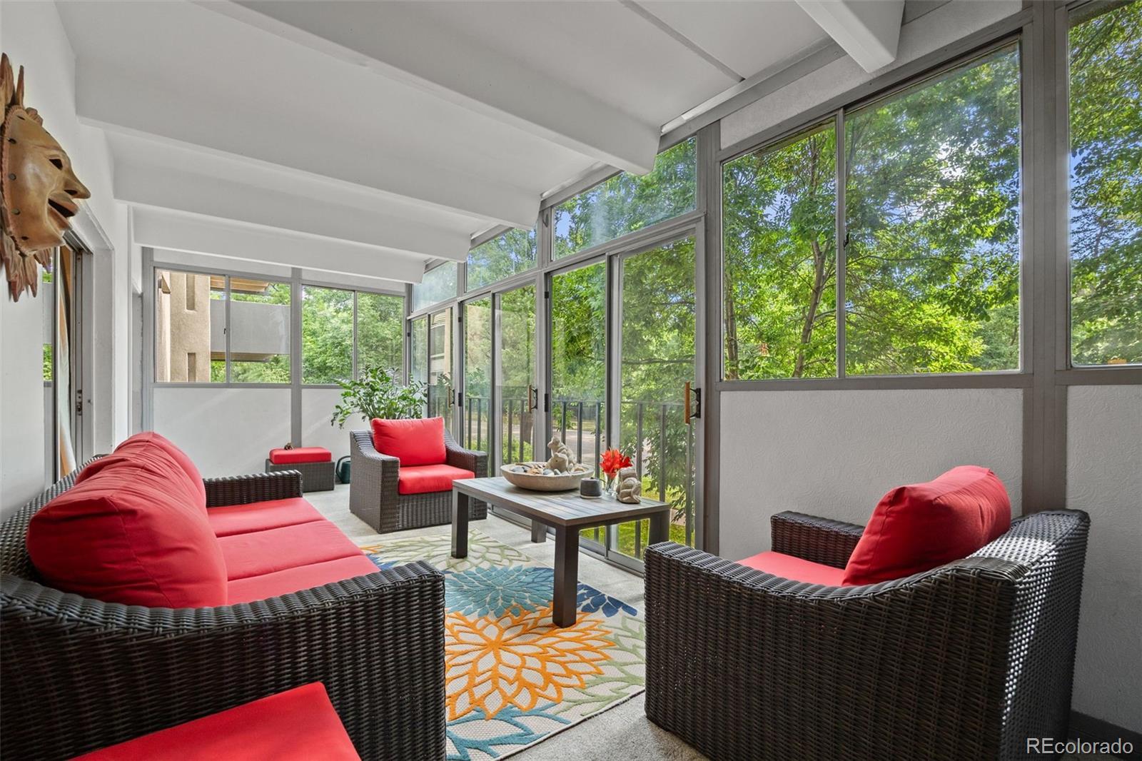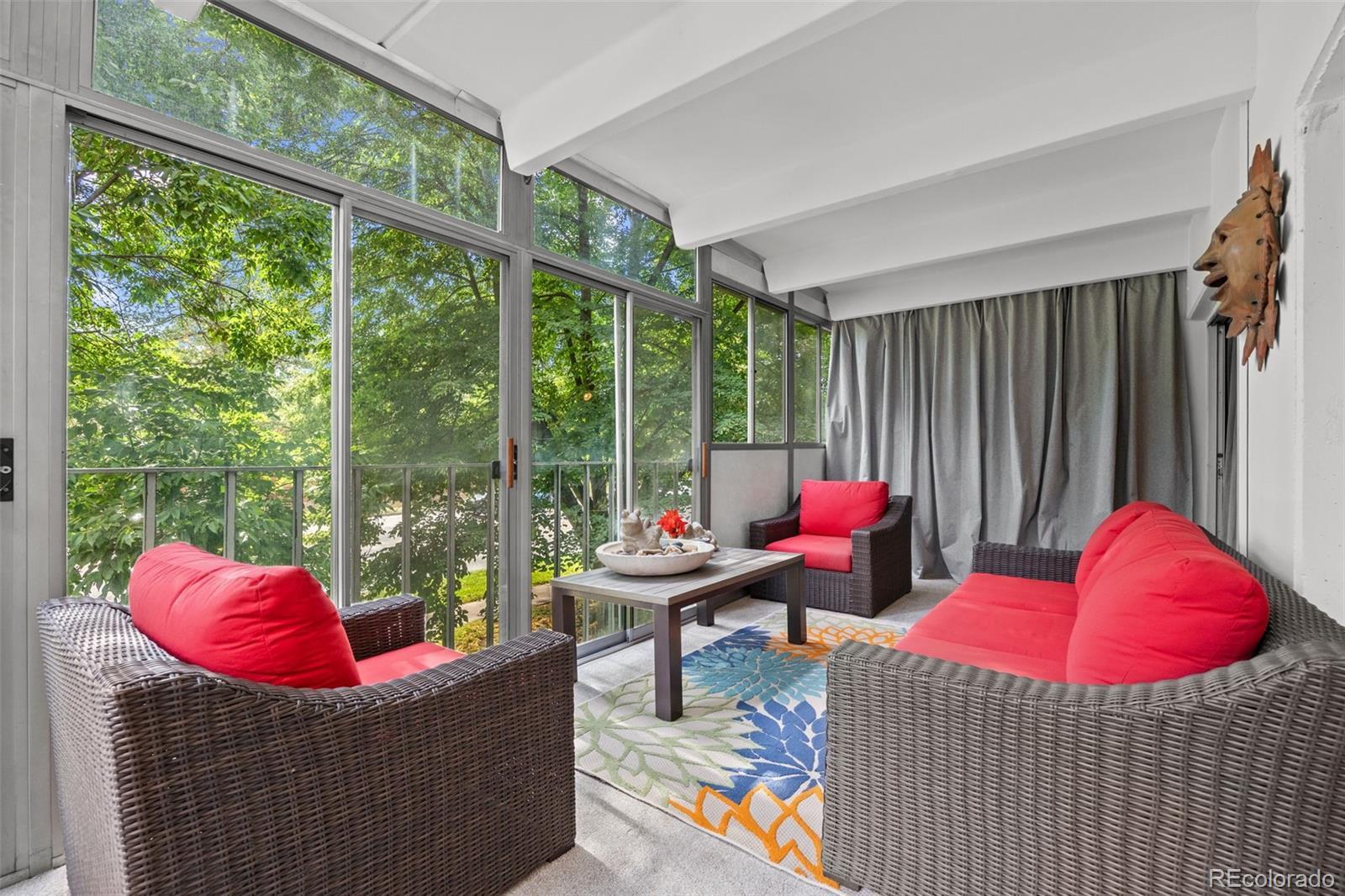 Stylish Urban Living in the Heart of Bonnie Brae. Welcome to the House of Rothschild, an intimate, 38-residence condominium community nestled in one of Denver’s most beloved neighborhoods. Perfectly positioned between Washington Park, Cherry Creek, South Gaylord, and the charm of Bonnie Brae, this location offers walkability, culture, and convenience at your doorstep. Inside this thoughtfully reimagined condo, classic design meets modern sophistication. The owner has opened up the floor plan to create seamless flow between the kitchen, dining, and living spaces, perfect for entertaining or quiet nights in. The kitchen is beautifully updated with sleek finishes and a contemporary aesthetic. Stylish wet bar featuring a beverage refrigerator and statement penny tile backsplash. Additional upgrades include new flooring, modern built-ins in the dining area, barn doors between the second bedroom and living room that add both function and flair. The spacious living room centers around a cozy fireplace, leading to an expansive, enclosed sunroom that adds substantial 3 season flex space, ideal as a home office, reading lounge, or creative studio. Dual bedrooms offer privacy and comfort, each with generous closet space. The building offers exceptional amenities: year-round indoor pool, hot tub, fitness center, game room, clubhouse with kitchenette, hobby room, bicycle storage, and a secure underground garage with reserved parking and additional storage. With all utilities except electricity included in the HOA and laundry just steps from your door, every detail has been designed for ease. Whether you're strolling to Bonnie Brae Ice Cream, enjoying a bike ride through Wash Park, or shopping in Cherry Creek, this is Denver living at its best