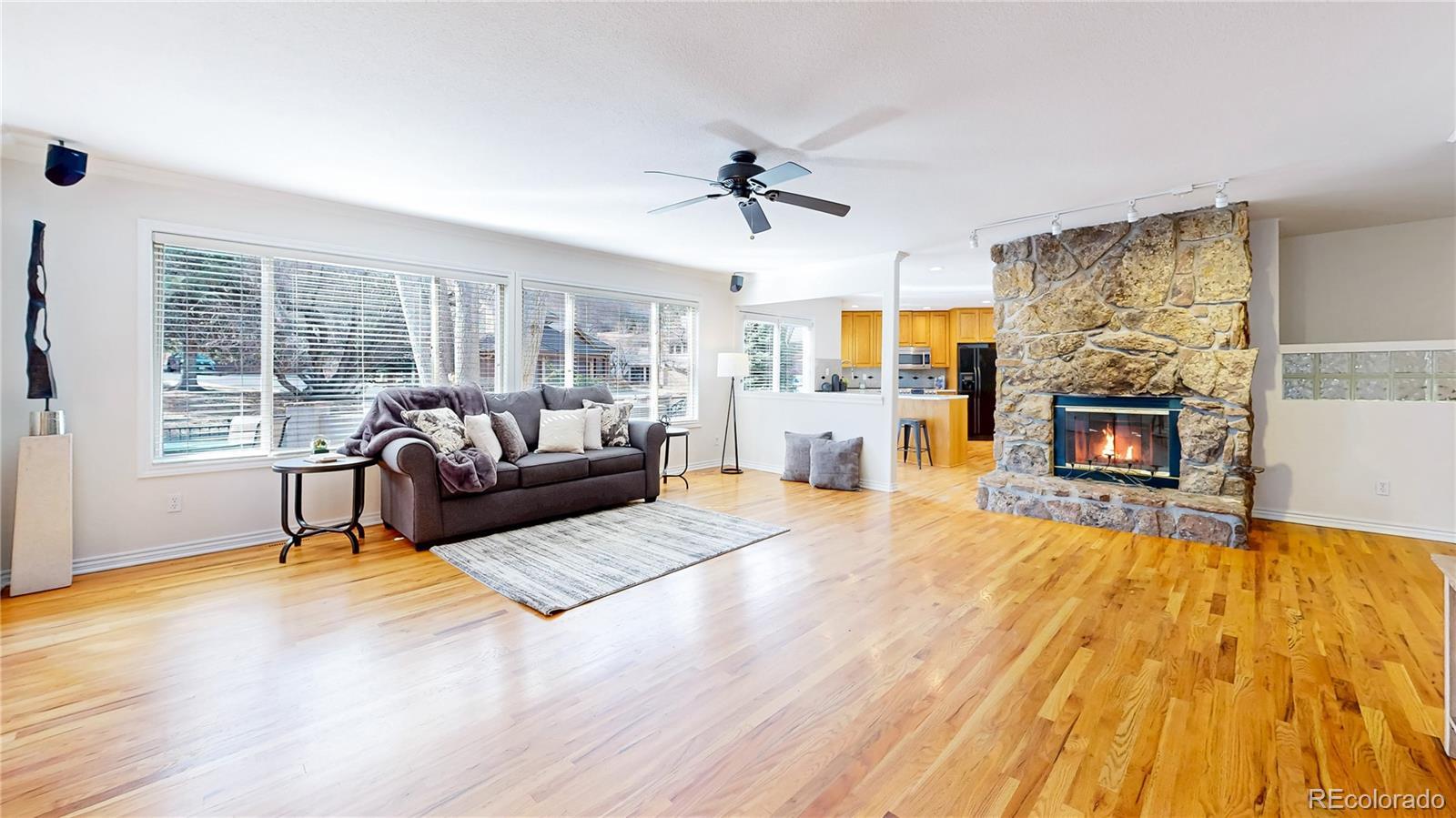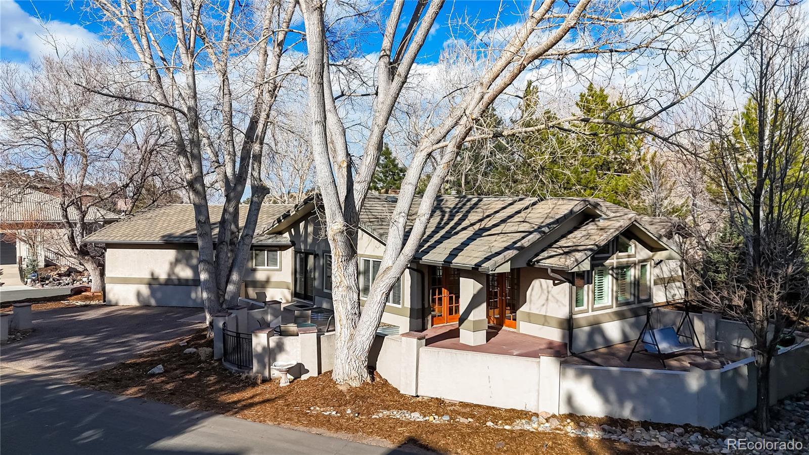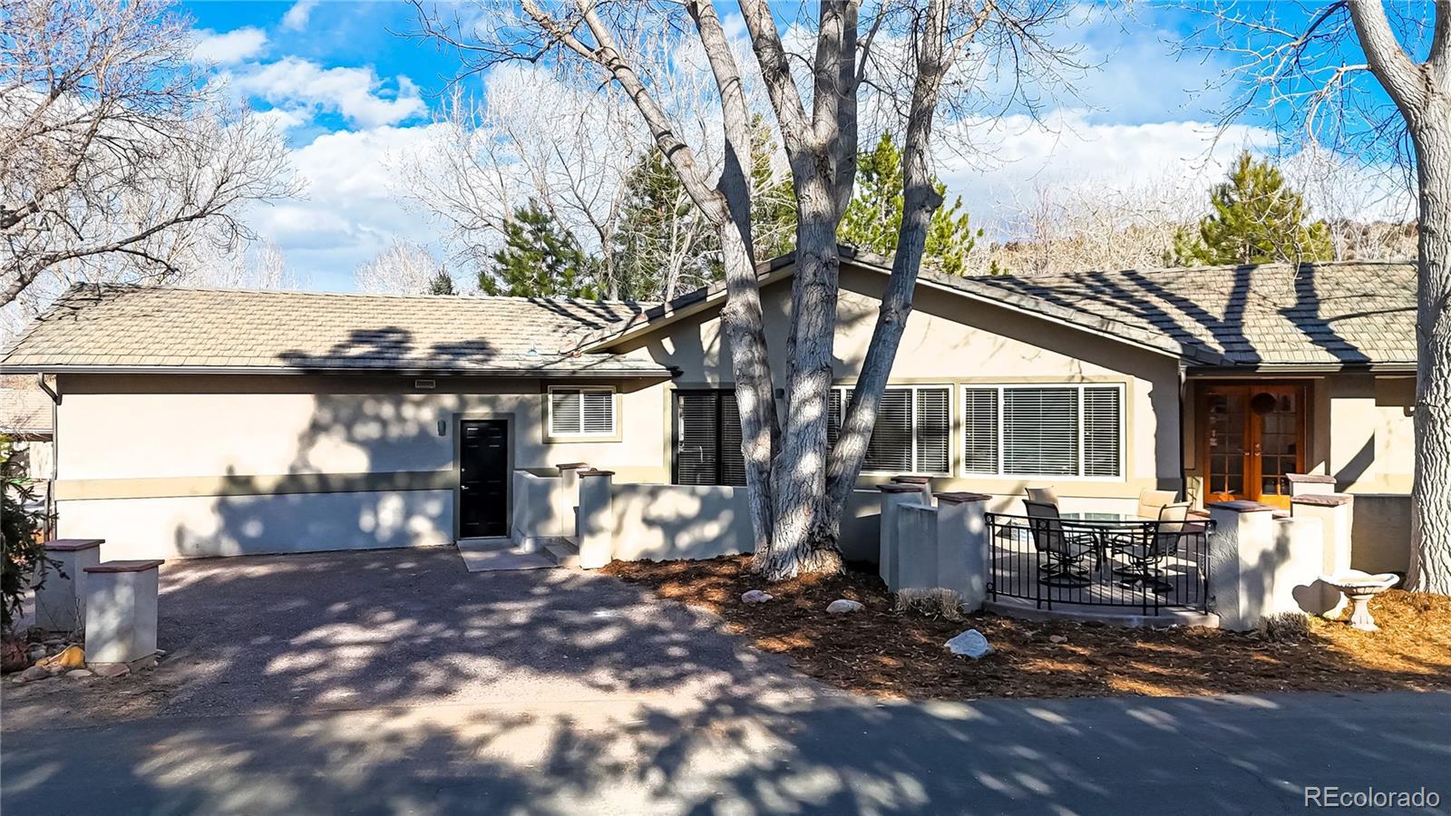 Pro photos in on Friday, February 20th. This ranch-style home offers exceptional comfort and versatility throughout. The kitchen showcases ample counter space with brand-new white quartz, a breakfast bar, natural hardwood flooring, and a gas range. The great room also features hardwood floors, abundant windows, a wood-burning fireplace, and access to the deck and walled flagstone patio. The vaulted main-floor study includes a wet bar, glass French doors, and a private exterior entrance—ideal for a home office or business. The main-floor primary suite boasts a three-sided gas fireplace, walk-in closet, and sliding glass door to a secluded courtyard. The en-suite bath offers a jetted tub, frameless glass shower, and separate commode room. Two additional bedrooms and a full hall bath with tumbled slate and ceramic tile, and the laundry room is conveniently located on the main floor and plumbed for a utility sink. The basement includes a spacious flex room suitable for a bedroom, recreation area, or media room, complete with a wall of closets, two egress windows, and a wood-burning fireplace, plus a 3/4 bath. The interior has been freshly painted and all carpeting replaced. Outside, the walled patio and deck are shaded by mature trees. Landscaping has been refreshed, stucco serviced and sealed, and roof repairs recently completed. A front walled area previously accommodated a hot tub, with electrical still in place. Located across from Arrowhead Golf Course and near Pike National Forest, Roxborough State Park, Waterton Canyon, and Chatfield State Park for hiking, biking, fishing, camping, and water recreation. Roxborough also features a state-of-the-art water treatment plant using ultraviolet purification and a community recycle center with compactors, open-top dumpsters, metal recycling, and electronics and solvent drop-off. There are also miles of trails throughout the neighborhood, and the wildlife and is abundant and always entertaining.