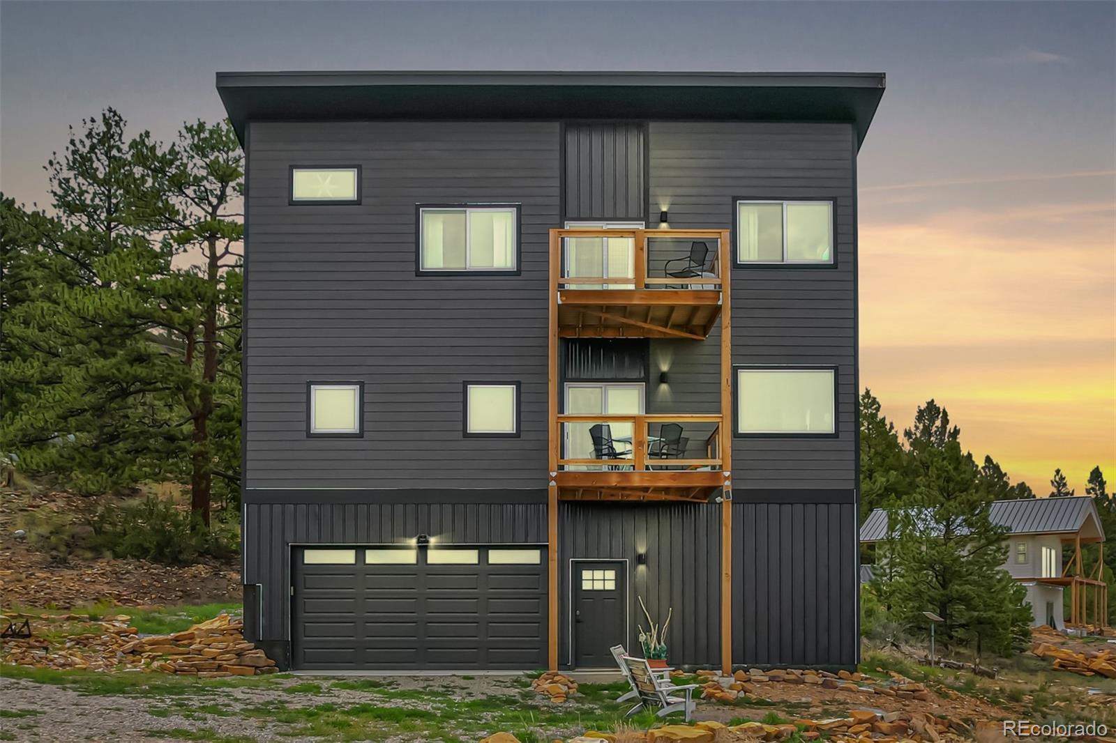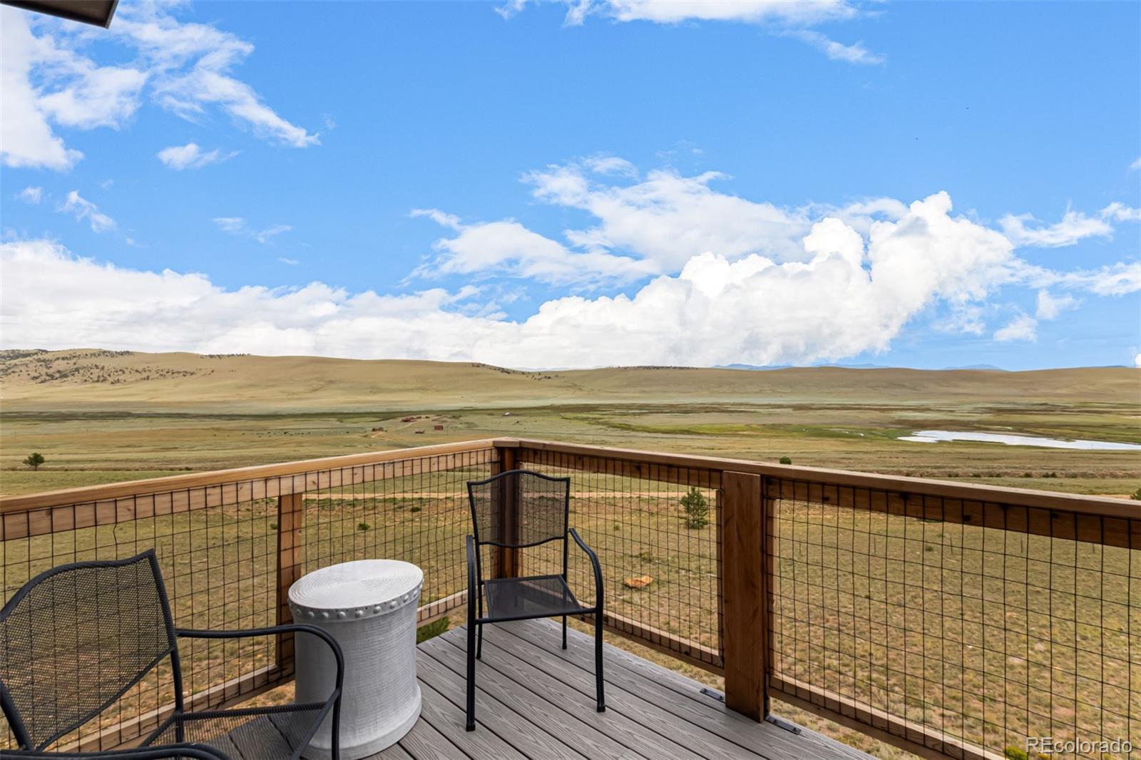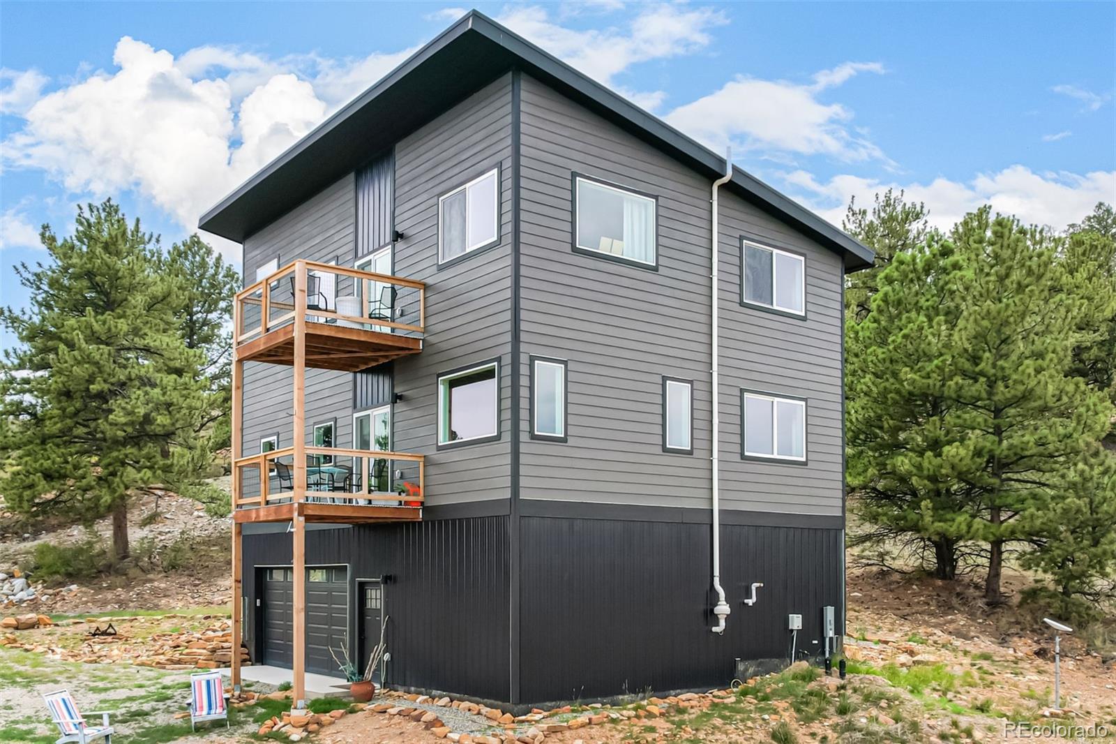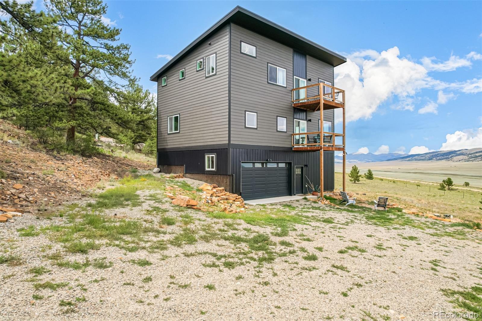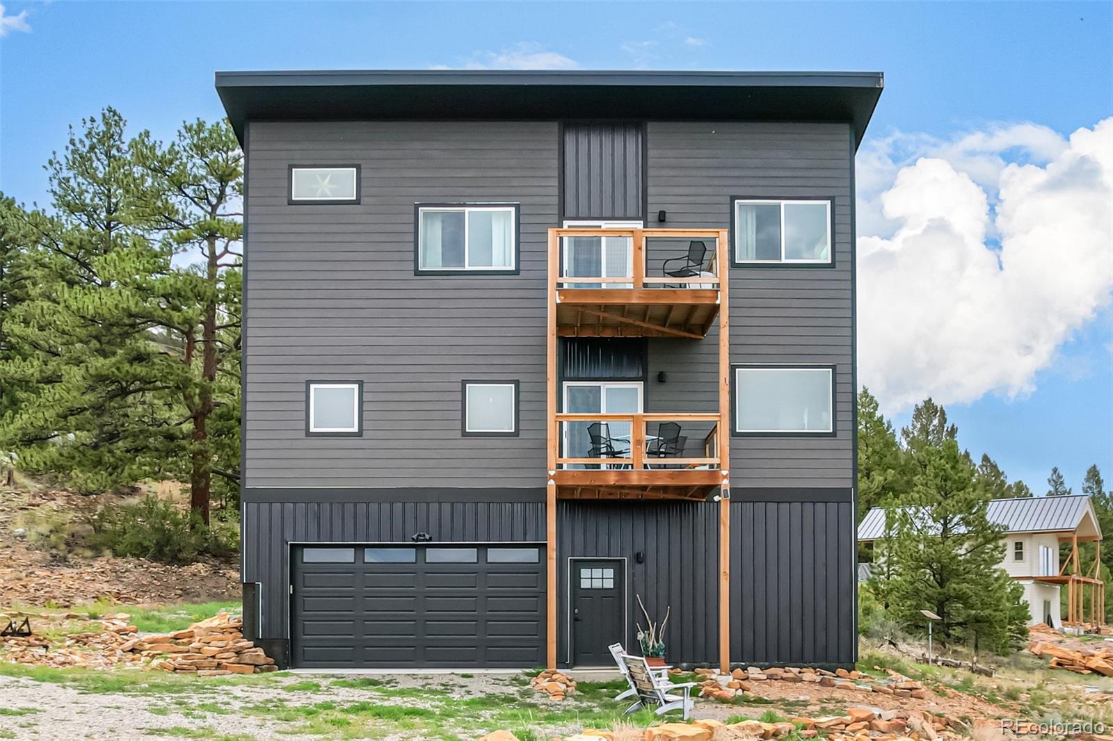 Welcome to this stunning modern mountain retreat in Redhill Forest, offering sweeping valley views and effortless access to everything you love about the Rockies, including 5.5 miles of private fishing rights of the Middle Fork of the South Platte River. Built in 2022 and meticulously maintained by its original owners, this 3-bedroom home also includes two versatile bonus rooms currently used as an office and a family room—both easily convertible into additional bedrooms. The main level features an open-concept layout with a sunlit living room anchored by a cozy gas fireplace, a dining area that opens to a covered balcony with panoramic views, a stylish sitting area, and a beautifully designed kitchen with quartz countertops and stainless steel appliances. A full bathroom and dedicated office complete the main floor. Upstairs, French doors open to a spacious family room, along with the private primary suite featuring its own balcony, two additional bedrooms, and another full bathroom. The lower level includes a two-car garage and generous storage space. Located on a paved road near the community entrance, this home offers both convenience and serenity—plus the bonus of reliable cell service. Only 10 minutes from Fairplay and 45 minutes from Breckenridge, you’ll enjoy the perfect blend of peaceful country living and easy access to dining, shopping, and world-class mountain recreation. All furniture is negotiable.