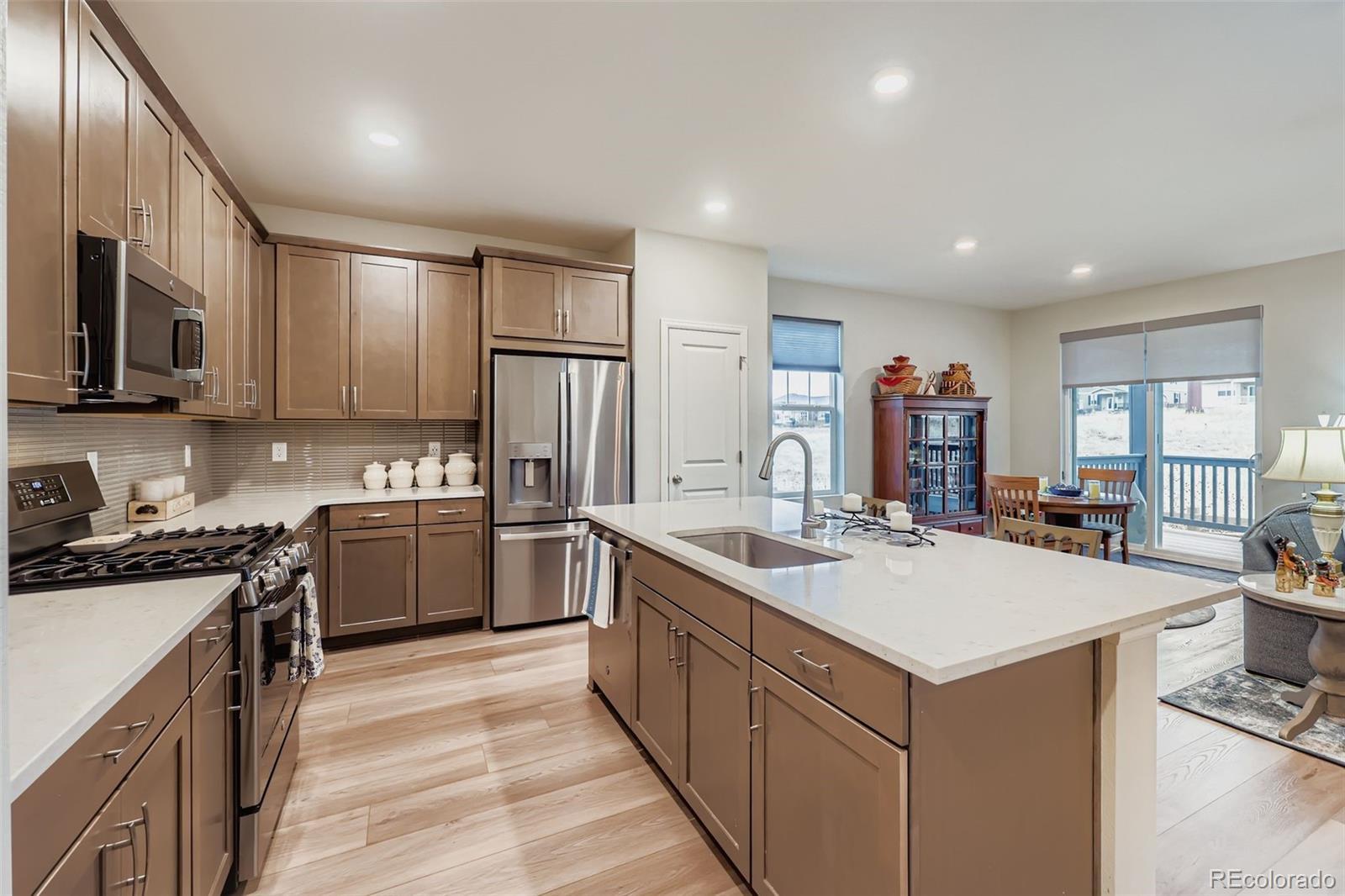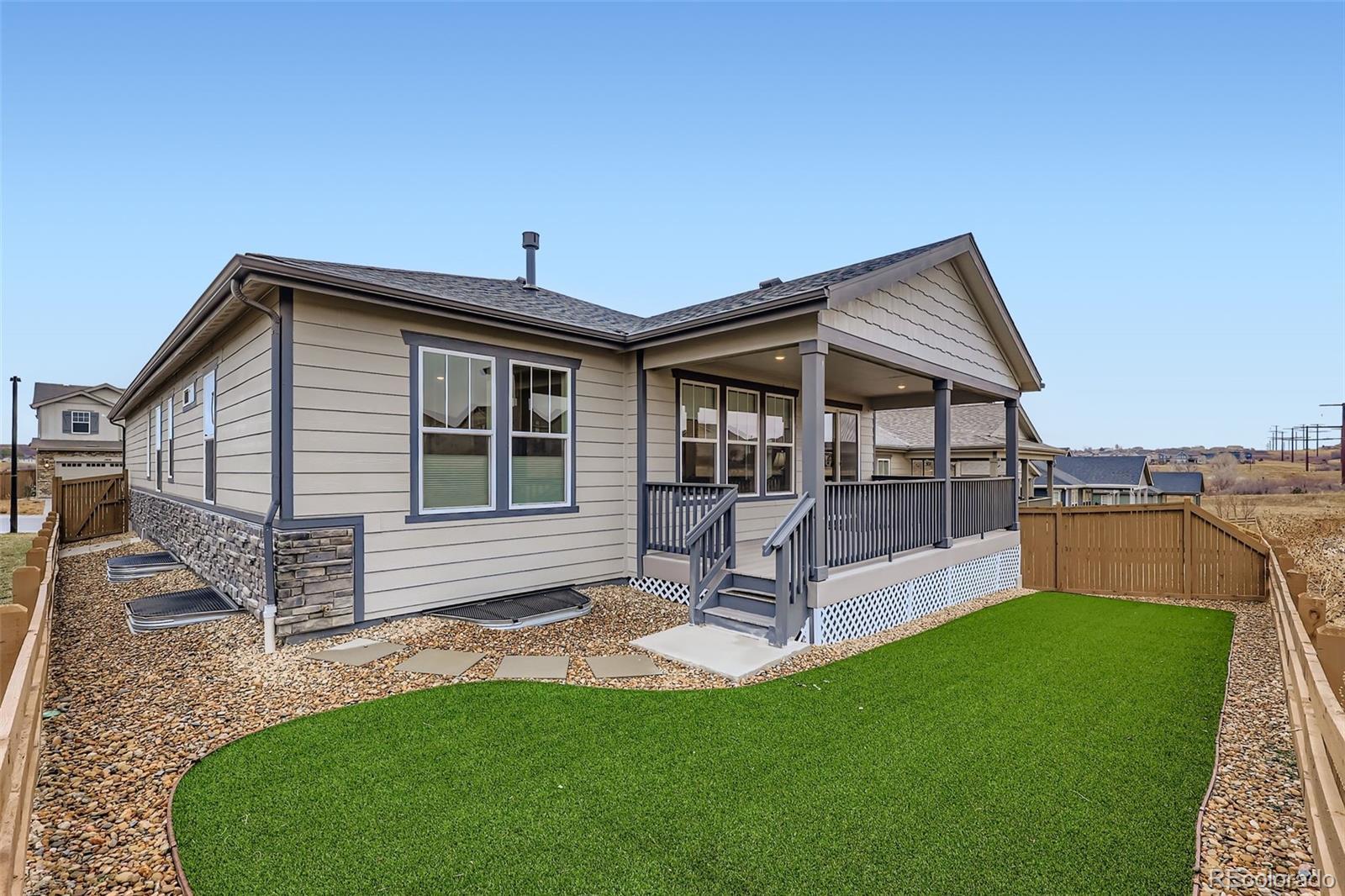 Discover the perfect blend of modern design, comfort, and functionality in this 4-bedroom, 3-bath, ranch-style home located in Terrain Oak Valley in Castle Rock. Built in late 2024, this home is practically new and has been thoughtfully enhanced with move-in-ready updates and upgrades. The bright, open floorplan features 9-foot ceilings, luxury vinyl plank flooring, a gas fireplace, a finished basement, and an upgraded oversized covered patio overlooking a private backyard that backs to open space. The kitchen offers exceptional convenience with a large island and seating, a pantry, quartz countertops, stainless steel appliances, a gas range, and soft-close cabinets and drawers. The spacious primary bedroom is complemented by an en-suite bath featuring a double vanity, shower, walk-in closet, linen closet, and a private water closet. Two additional bedrooms and bathroom are located off the main entry, along with a separate office/TV room with elegant French glass doors that provide versatility and privacy, and a laundry room with linen closet, sits centrally in the home (washer and dryer included). In addition, the conveniently finished basement expands your living space, offering a sizable family/bonus room, a fourth bedroom and a full bathroom, perfect for guests or additional living flexibility. Located within walking distance to parks and trails, and just a short drive to grocery stores, restaurants, historic downtown Castle Rock, the outlet mall, and quick access to I-25, you’ll never be far from anything you need. No need to wait for construction when you can take advantage of this incredible opportunity right now!