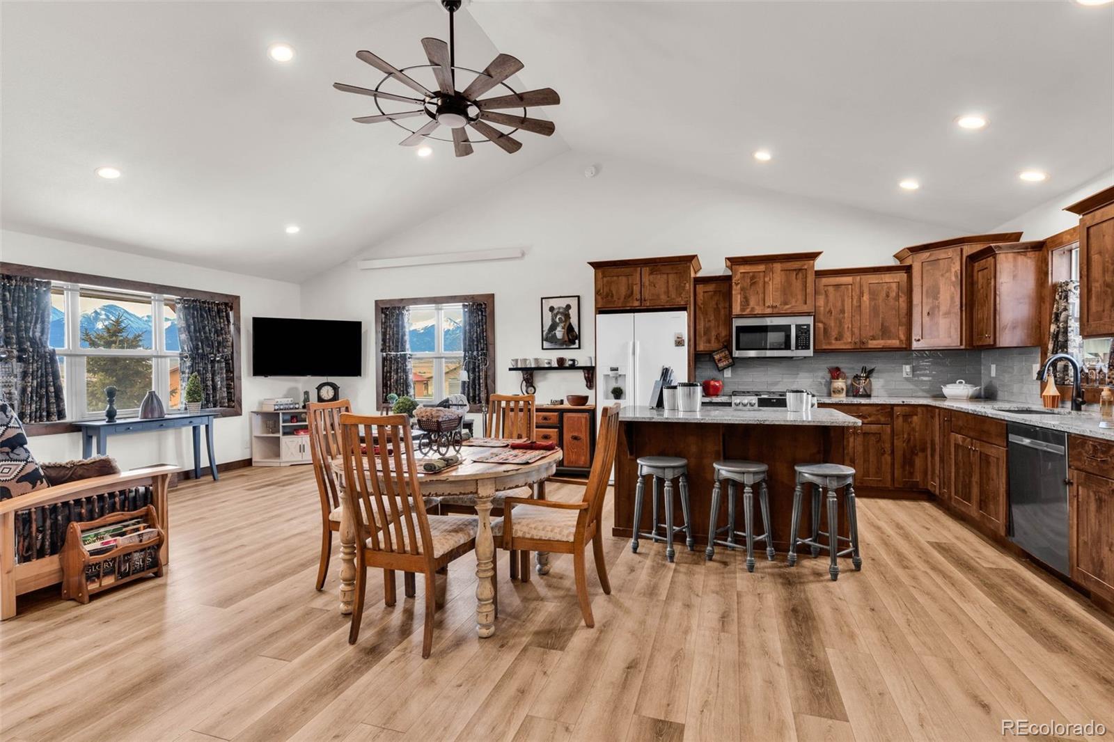 Nestled in the heart of the charming mountain town of Silver Cliff, this beautifully built single-level home offers a peaceful Colorado lifestyle surrounded by wide-open skies, fresh mountain air, and endless outdoor adventure. Built in 2021, the 1,500 sq ft home features 3 bedrooms and 2 bathrooms, providing the perfect balance of comfort and functionality for full-time living, weekend escapes, or hosting family and friends. The open-concept kitchen is designed for connection, featuring quality appliances and granite countertops—ideal for gathering after a day spent hiking, fishing, or exploring the nearby San Isabel National Forest. Durable laminate and vinyl flooring throughout make mountain living easy and low-maintenance, so you can spend less time on upkeep and more time enjoying the outdoors. Set on a spacious 0.23-acre corner lot, the property offers room to relax, take in the views, and enjoy the peaceful rhythm of small-town life. Inside, vaulted ceilings create a light and airy feel, while the cozy wood-burning stove in the living room sets the stage for warm evenings, good conversation, and snow falling softly outside. Whether you’re stargazing under Silver Cliff’s famously dark night skies, sipping coffee on a crisp mountain morning, or coming home after a day of adventure, this home is designed to help you slow down and savor the moment. Additional highlights include an attached two-car garage, thoughtful modern finishes, and the convenience of being sold fully furnished—making this a truly move-in-ready opportunity. With its blend of modern comfort, rustic charm, and unmatched access to the great outdoors, this Silver Cliff home invites you to embrace the best of Colorado mountain living.