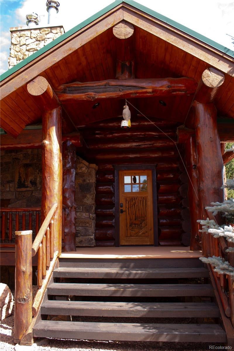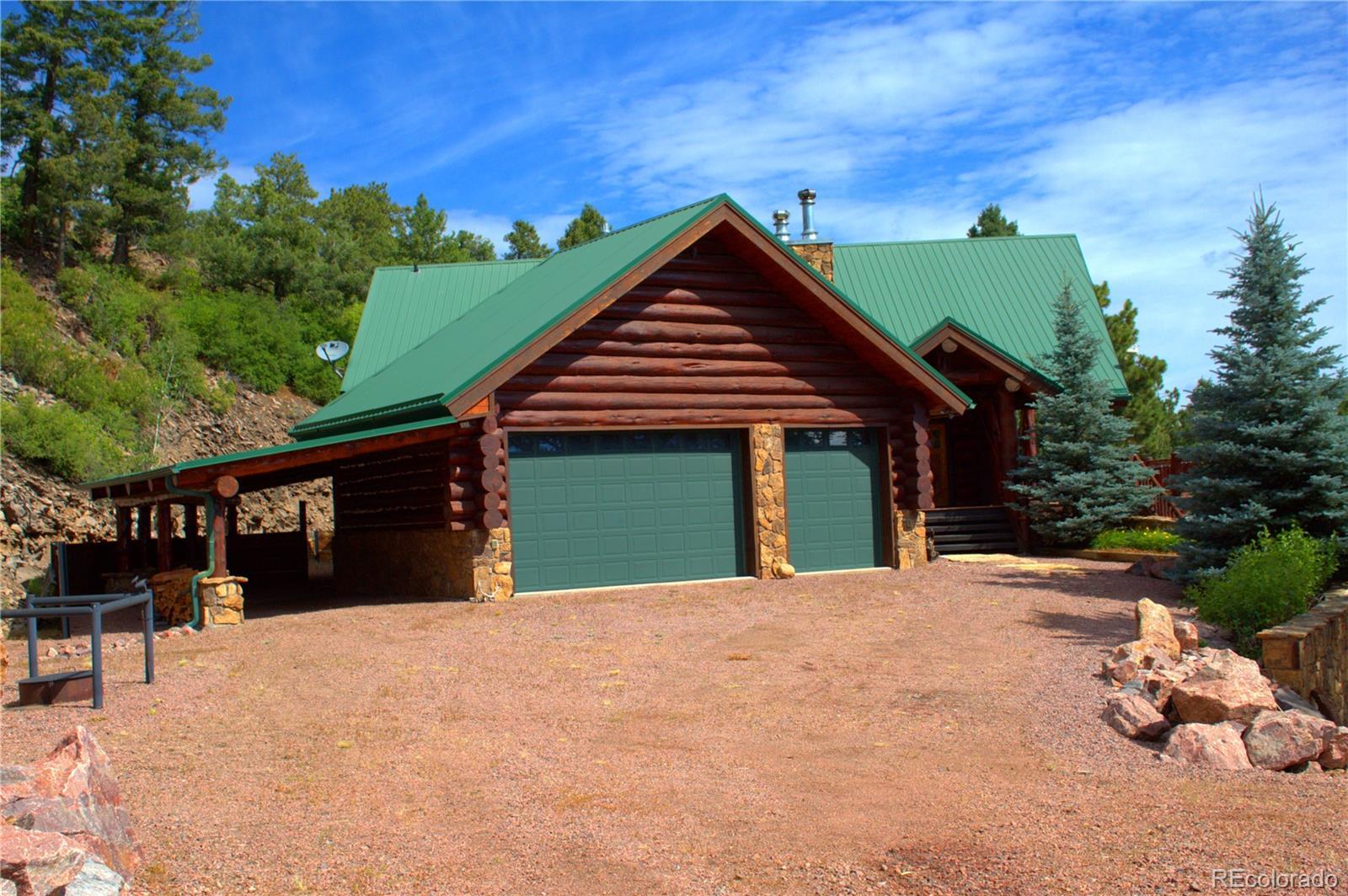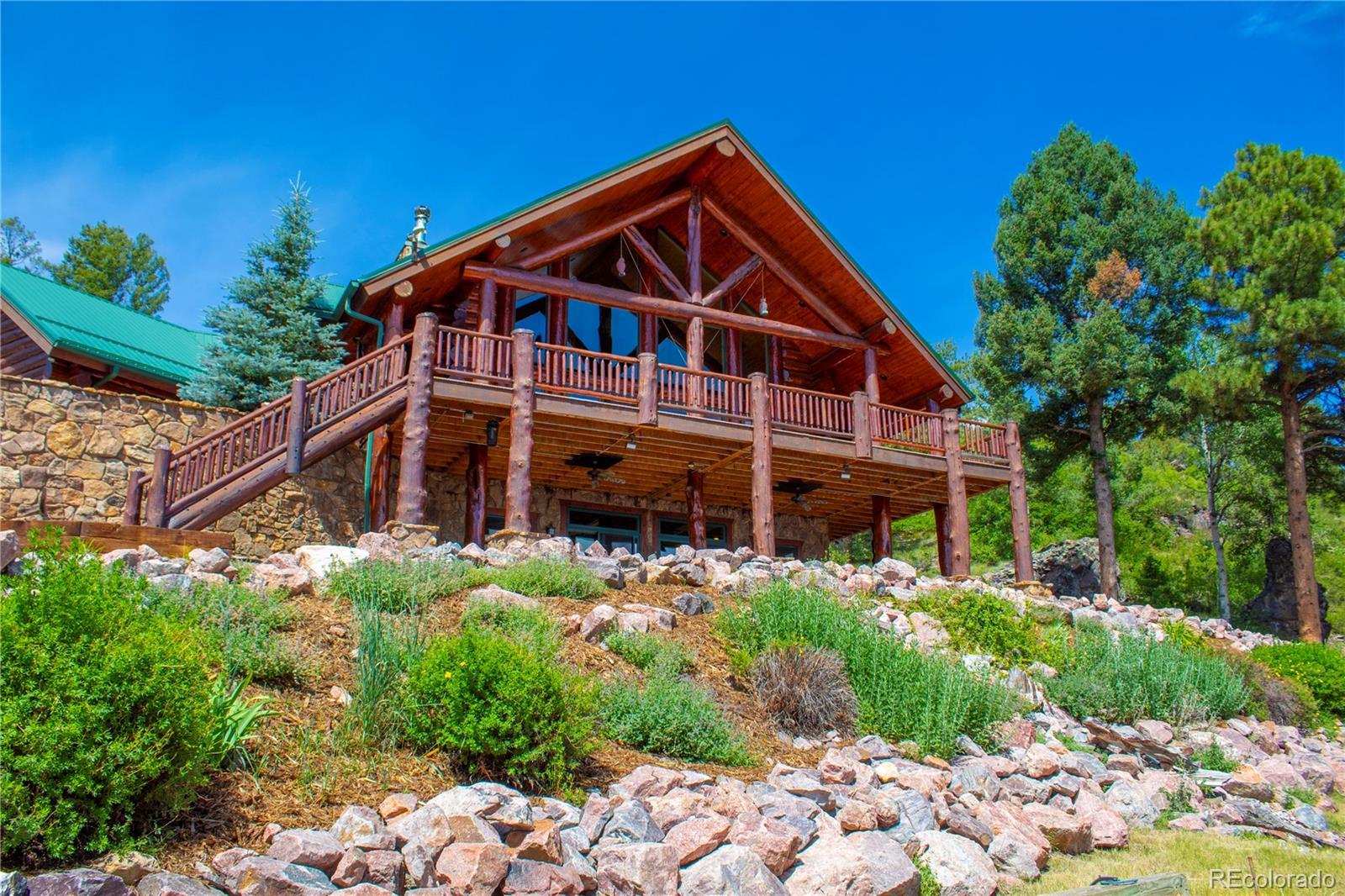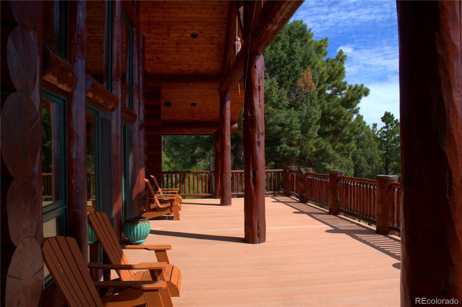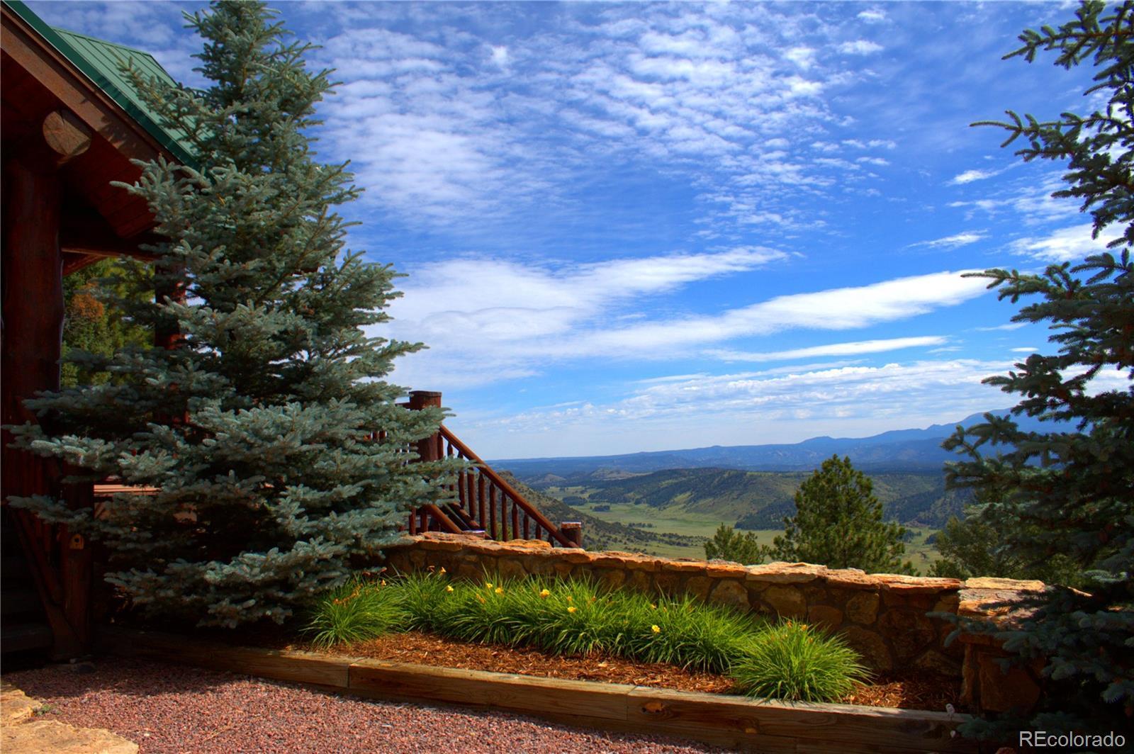Spectacular Mtn Ranch on over 202 acres! 60 miles W of Colorado Springs! This magnificent log home Is perfectly designed around the landscape of 202 Deeded acres and includes an additional 640 acres of state lease for your private recreation and hunting pleasures! Plentiful, trophy deer, elk and turkey only 25 minutes to gold medal fishing! 3BR, 4 BA mountain paradise! The main floor great room boasts vaulted ceilings with gorgeous log beams and plenty of open space to showcase your trophy mounts. The focal point is a beautiful stone WB, FP featuring an incredible mantle with etched wildlife scene in the stone! A gourmet kitchen with extended walk in pantry! Granite countertops, stainless steel appliances, island with 5 burner gas cooktop/custom hood with an eat in dining area.Main floor laundry area and powder room from garage entry. This main area is completed by a guest bedroom suite that is reminiscent of a luxury Colorado cabin! WO main floor to wrap around deck with hot tub area and absolutely breathtaking views of the 640 acre valley and Pikes Peak! The entire upstairs is dedicated to a loft office area and master suite with all the amenities! The 5 piece master bath is gorgeous with custom tile wildlife scene in the shower, wall mounted TV, and a , walk in, cedar closet! On to the walk out lower level! This is a man cave like no other! Massive fireplace with built in gun cabinets on either side, a full bar for entertaining, mounted TVs for all to view! Reloading room that will “blow” your mind! The third and final bedroom and a full bath in the hall finish the space off perfectly! There are many more details regarding numerous features! Huge garage with built-in workbenches with plenty of room for everything! Great pastures, outbuildings, green houses, and a shop that every man dreams of! The shop also houses a kitchen for processing food and wildlife! Call today, this place is One Of A Kind and will not last, nor can it be replicated for the asking price!