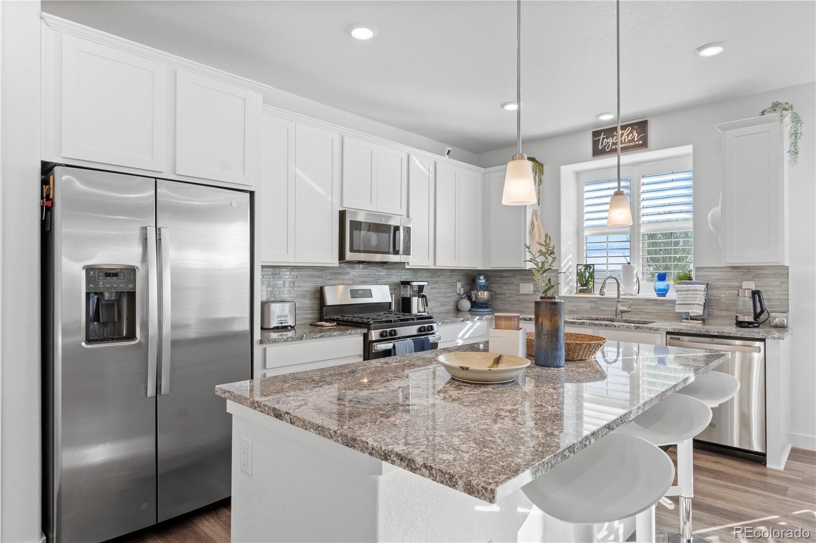What truly sets this low-maintenance single-family home apart is its remarkable lot and stunning design features. Situated to maximize expansive views to the north, this property offers an unmatched sense of openness and privacy. With green space on the north side and another green space directly across the street (both currently being landscaped by the HOA), the home is perfectly positioned for unobstructed views. Enjoy the peaceful setting from the porch, ideally located to take in the scenery. Inside, this 3-bedroom, 2.5-bathroom home boasts a fantastic open floor plan, highlighted by luxury vinyl plank flooring throughout the main level and 10-foot ceilings that create a bright and airy atmosphere. The living room flows seamlessly into the beautifully designed kitchen and dining room. The kitchen features granite countertops, a kitchen island, glass tile backsplash, stainless steel appliances, a gas range, white shaker cabinets, pendant lighting, and a pantry. Upstairs, the oversized primary suite is a true retreat. It features an elegant tray ceiling, an oversized walk-in closet, a spa-like bathroom with dual sinks and a glass-enclosed shower. The two additional bedrooms each have direct access to the second-floor bathroom. Laundry is conveniently located on this level as well. Additional highlights include plantation shutters throughout the main level, an EV charger in the spacious two-car garage, and a solar system with a low monthly payment of just $33, offering significant energy savings. Sterling Ranch is a vibrant community with parks, trails, and fantastic amenities, including Living the Dream Brewery, Atlas Coffee, and a rotation of food trucks. The home is also located one block from the future Burns Regional Park. Reach out to your Realtor to schedule a showing today!