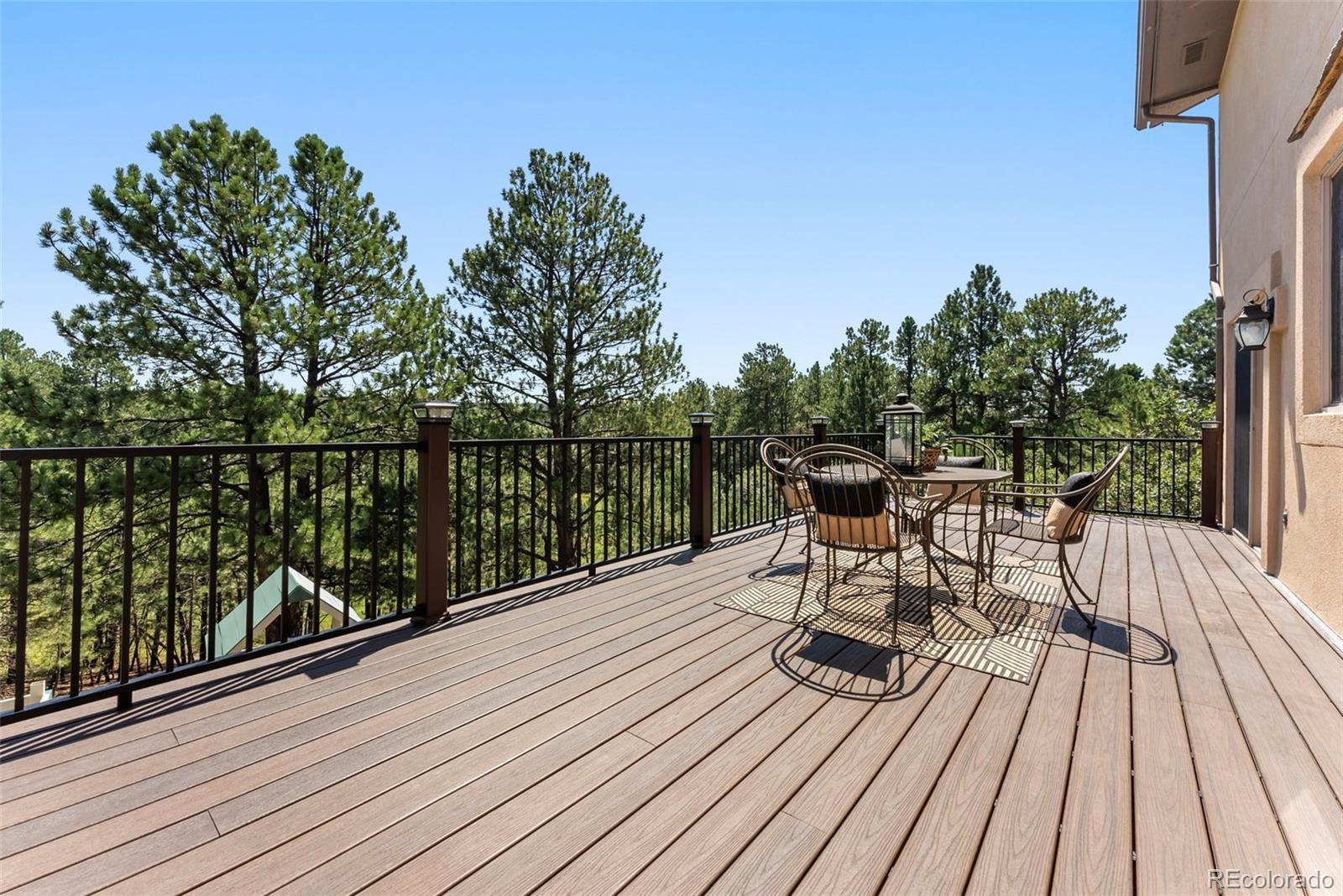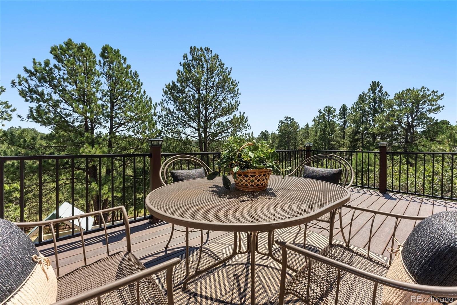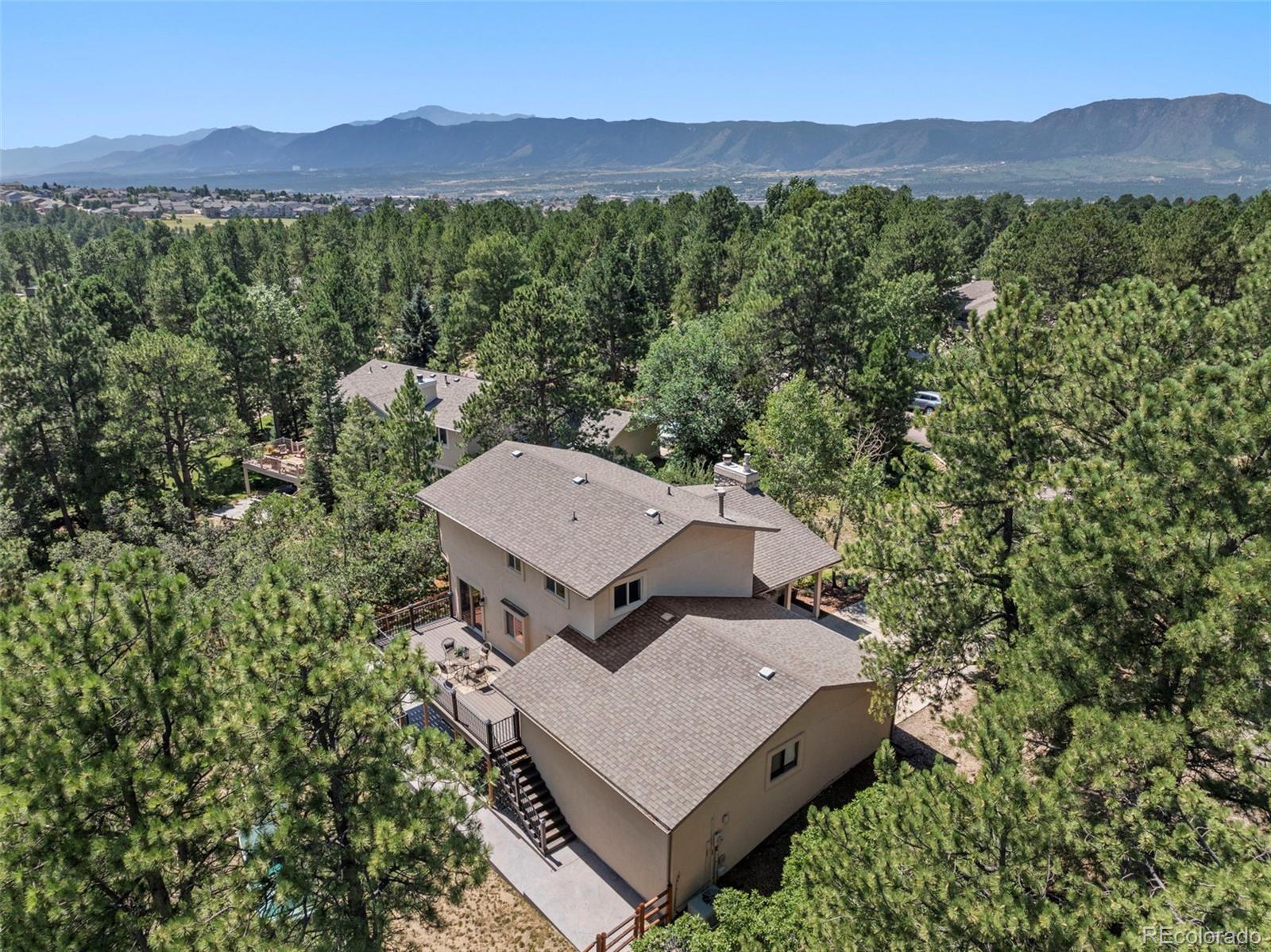 Nestled on a serene cul-de-sac and backing to open space, this beautifully maintained 4-bedroom, 4-bath stucco and stone home sits on a private, treed ½ acre lot offering peace, privacy, and majestic views — all located right near Hole 15 of the prestigious Woodmoor Country Club golf course. Step inside to an inviting Great Room with vaulted ceilings, LVP floors, and a stunning rock fireplace — the perfect space to relax or entertain. The open layout flows seamlessly into the spacious dining area and kitchen. Step out from the kitchen onto a gorgeous Trex deck overlooking the lush greenbelt. The upper level features two bedrooms and two baths, including a spacious master suite with vaulted ceilings and an attached bath. The second upstairs bedroom boasts a large walk-in closet with a nearby full bath. Downstairs, the walkout basement offers a cozy family room with a gas fireplace, a wet bar, two additional bedrooms, and another bathroom. Located in desirable North Woodmoor, this home offers a tranquil, country feel just minutes from I-25, shopping, and top-rated District 38 schools. Impeccably maintained and move-in ready — your dream home on the green awaits!