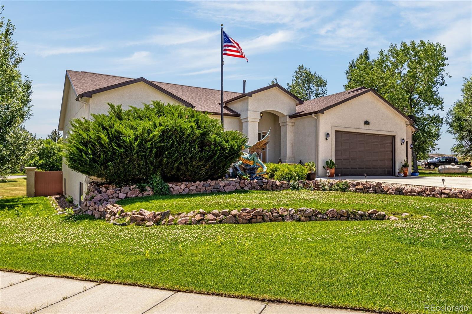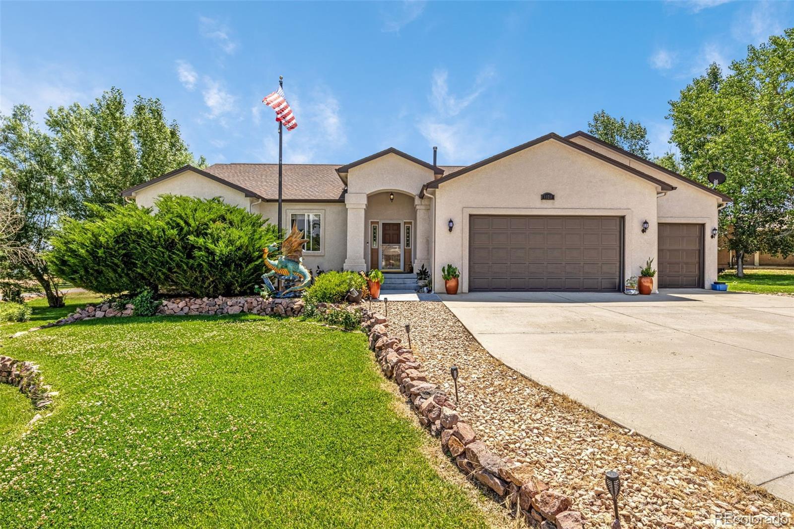 Welcome to this stunning stucco ranch-style home offering 5 bedrooms, 4 bathrooms, a 3-car tandem garage, and over 4,300 square feet of beautifully finished living space. Situated on a spacious .38-acre corner lot, this home combines thoughtful design with luxurious features throughout. Step inside to wood floors and a bright, open-concept floor plan. The main level boasts a spacious living room that flows seamlessly into a chef’s kitchen featuring a large island, granite countertops, double oven, and updated appliances. A formal dining area adjacent to the kitchen provides the perfect setting for meals and gatherings. The main-level primary suite includes a spa-like bathroom with a soaking tub, separate shower, and a large walk-in closet. An additional bedroom and fully updated bath with a soaking tub complete the main level, along with the convenience of one of two laundry rooms—the second located in the fully finished basement. Downstairs, enjoy a beautifully appointed wet bar with a dishwasher, refrigerator, and microwave—perfect for entertaining. A movie theater setup with sound system hookups, a game room, and a cozy wood-burning fireplace add to the home’s appeal. Just outside the basement, you’ll find easy access to a nearby wood stack for chilly evenings. The basement also features three spacious bedrooms, including a Jack and Jill bathroom connecting two of them, plus an additional half bathroom. Outside, relax on the backyard deck, enjoy the corner-lot privacy, and take advantage of the storage shed for your tools or gear. This well-maintained property offers the perfect balance of space, comfort, and convenience set in the southridge neighborhood with easy access to Colorado Springs.