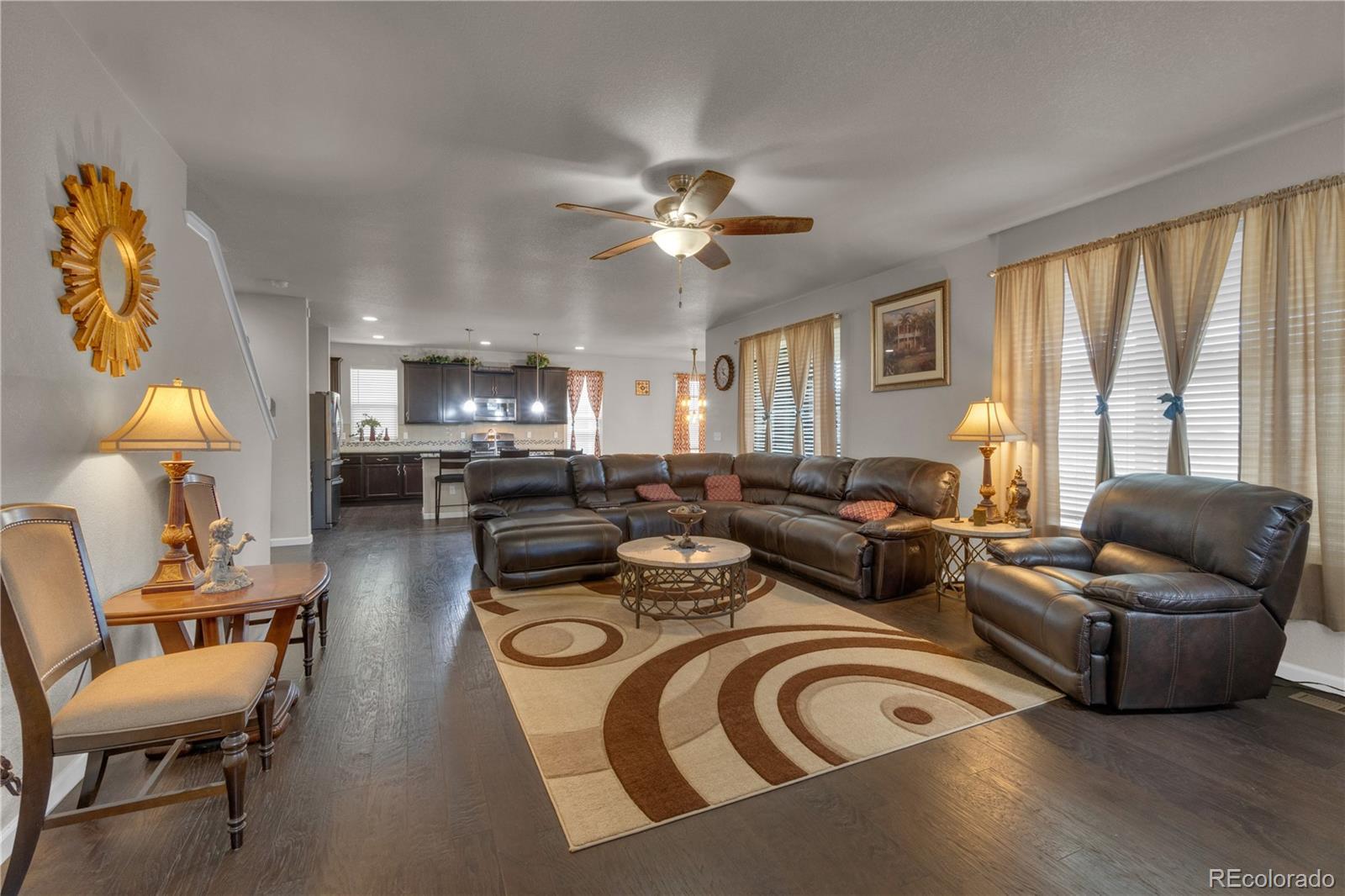 Save money on furniture, the living room and dinning room furniture, including the accessories are included with the home. The dinning room set and living room furniture are basically new, owners were never home to enjoy them. This stunning home showcases wide-plank hardwood floors throughout the main level, including the study/den, formal dining room, expansive family room, and a chef’s gourmet kitchen. The kitchen is equipped with stainless steel appliances, a gas cooktop, slab granite countertops, a spacious pantry, and a large center island that seamlessly connects to the family room—perfect for entertaining. Sliding glass doors from the kitchen nook lead to a generous covered patio, ideal for outdoor gatherings. Upstairs, you’ll find a luxurious master suite featuring an elegant en-suite bath and a massive walk-in closet that conveniently connects to the laundry room. Two additional large bedrooms, a versatile loft area perfect for kids or a home office, and a full bathroom with double sinks complete this level. The finished basement offers even more living space with a large recreation area featuring hardwood floors, two additional bedrooms, and a full bathroom—ideal for guests or extended family.