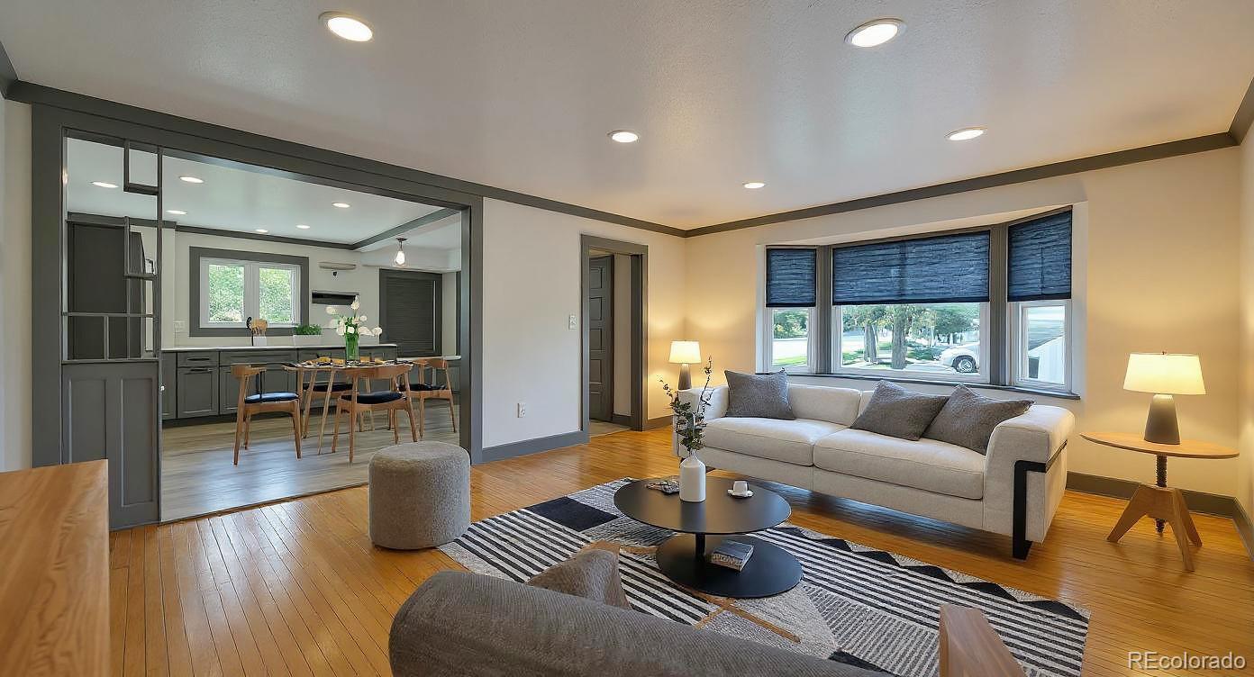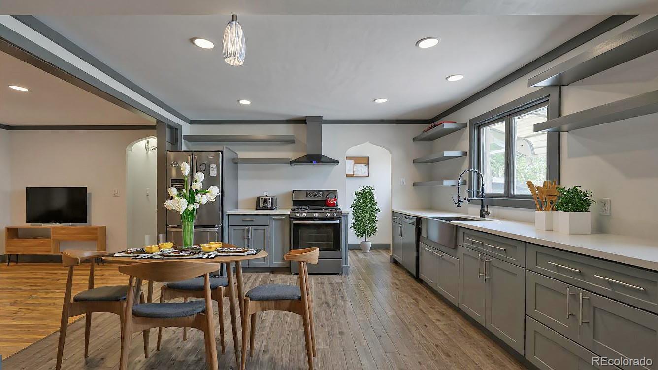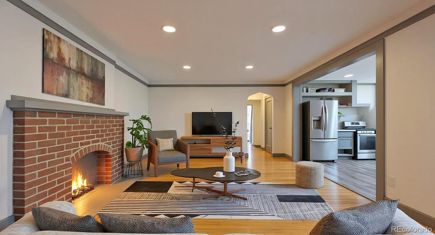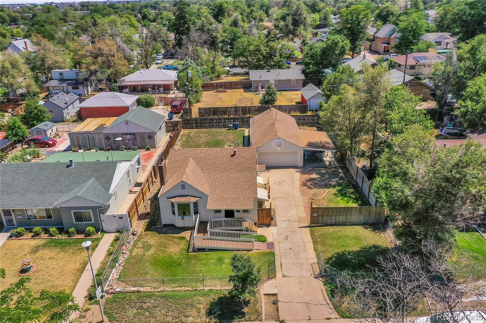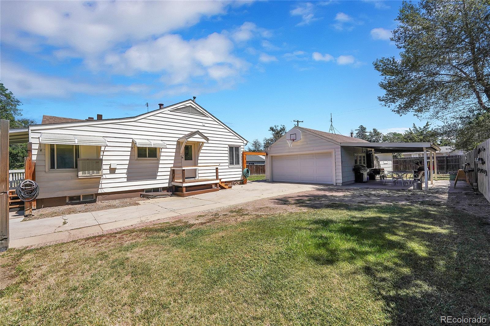 Fully updated 3 bed, 2 bath ranch plan w/ full basement on massive lot has heated 4 car garage (800 sq ft)- a shop lovers dream! Garage is currently 2 cars in front w/ shop area in back which is a heated and finished space, perfect for shop, studio, gym or whatever your heart desires! No fix and flip white program here- homeowners tastefully updated massive kitchen with grey shaker cabinets, quartz counters, floating shelves and black stainless appliances. Washer, dryer, refrigerator and all tv's stay with property. Multiple play areas & patios in fully fenced 9,500 sq ft yard. Virtually every component of home has been updated over time- move in and kick your feet up! Walk or short drive/bike to Stanley Marketplace, Central Park, Westerly Creek Park, Moorhead Recreation Center, Tag Burger Bar, Los Chingones Tacos, Glissade Coffee Company, the list goes on! Some kitchen and living room photos are virtually staged.