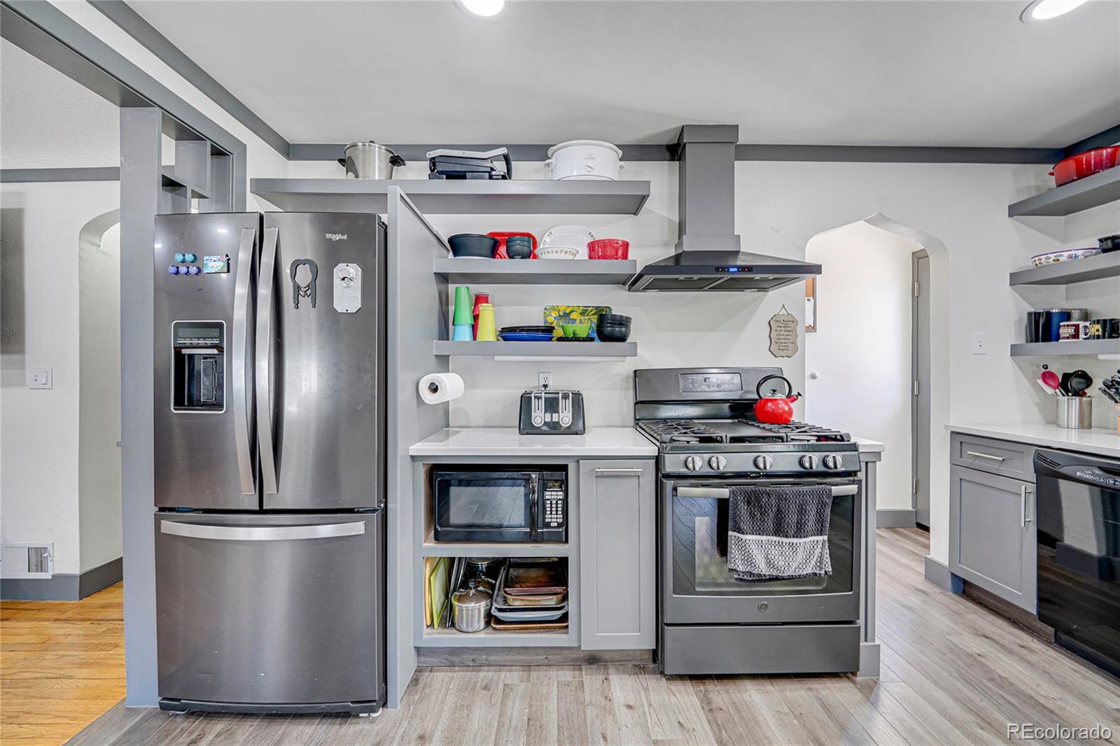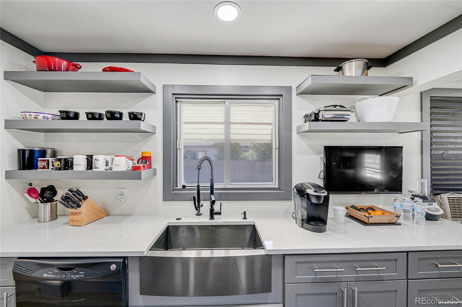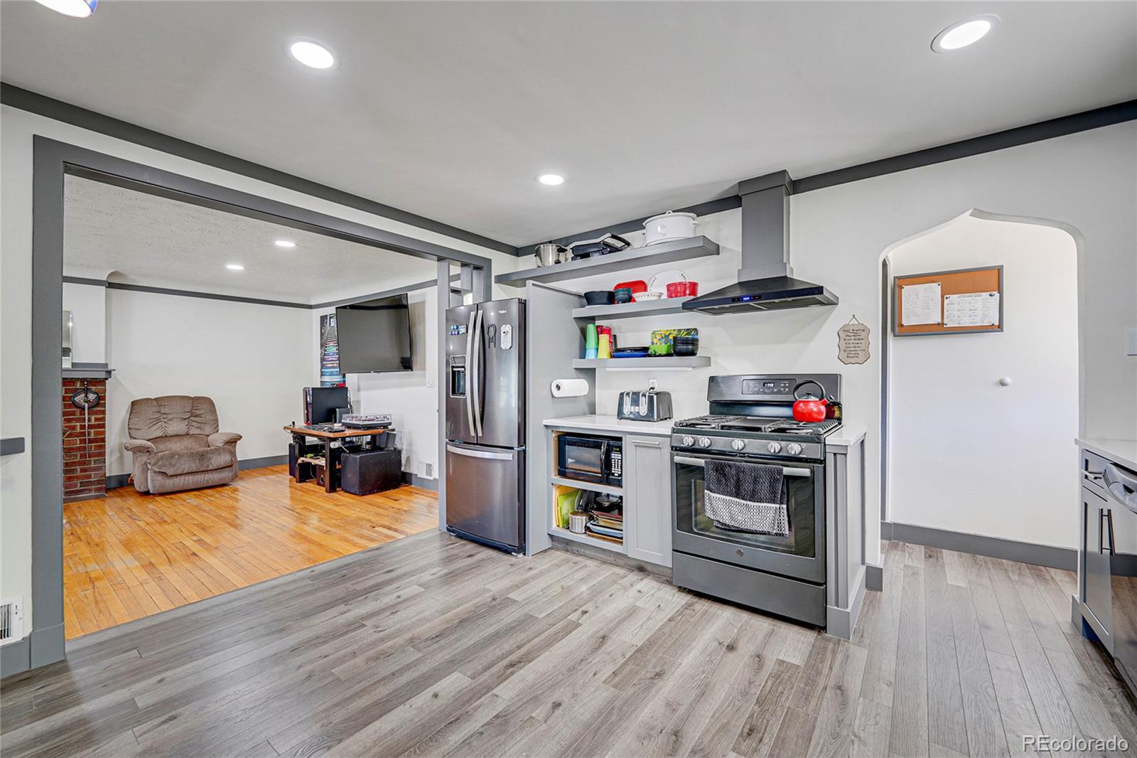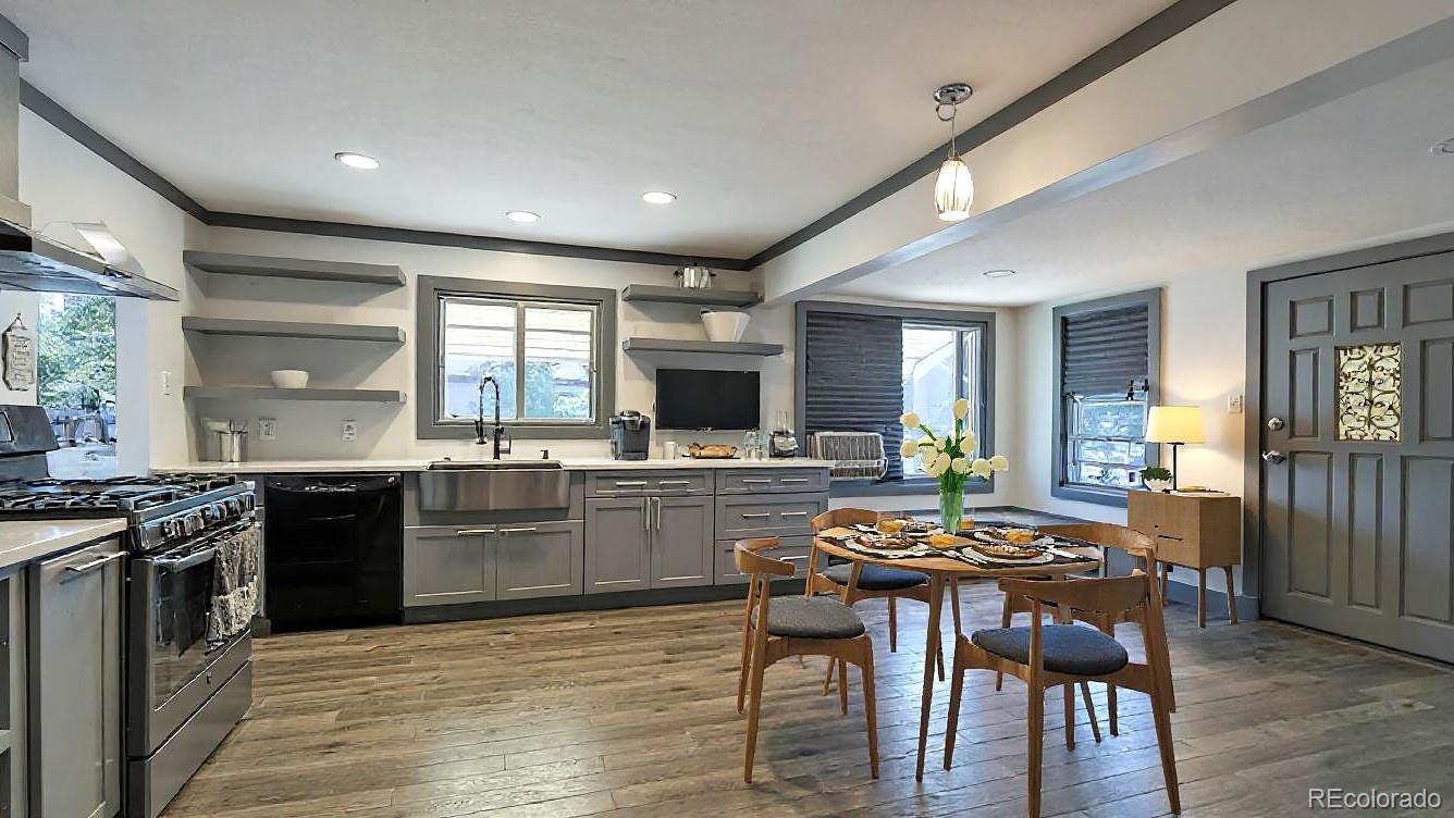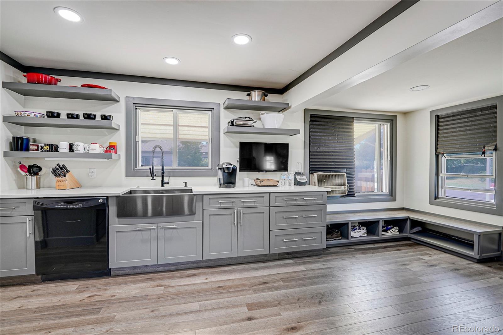 Fully updated 3 bed, 2 bath ranch plan w/ full basement on massive lot has heated 4 car garage (800 sq ft)- a shop lovers dream! Garage is currently 2 cars in front w/ shop area in back which is a heated and finished space, perfect for shop, studio, gym or whatever your heart desires! No fix and flip white program here- homeowners tastefully updated massive kitchen with grey shaker cabinets, quartz counters, floating shelves and black stainless appliances. Washer, dryer, refrigerator and all tv's stay with property. Multiple play areas & patios in fully fenced 9,500 sq ft yard. Virtually every component of home has been updated over time- move in and kick your feet up! Walk or short drive/bike to Stanley Marketplace, Central Park, Westerly Creek Park, Moorhead Recreation Center, Tag Burger Bar, Los Chingones Tacos, Glissade Coffee Company, the list goes on! Some kitchen and living room photos are virtually staged.