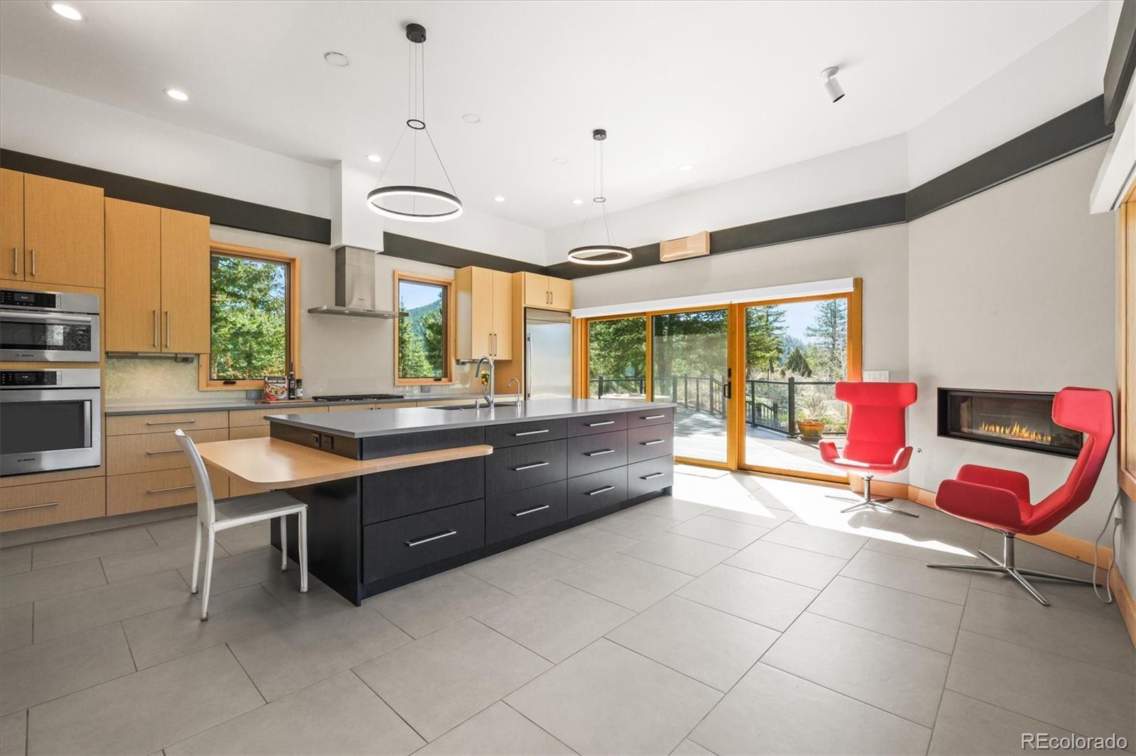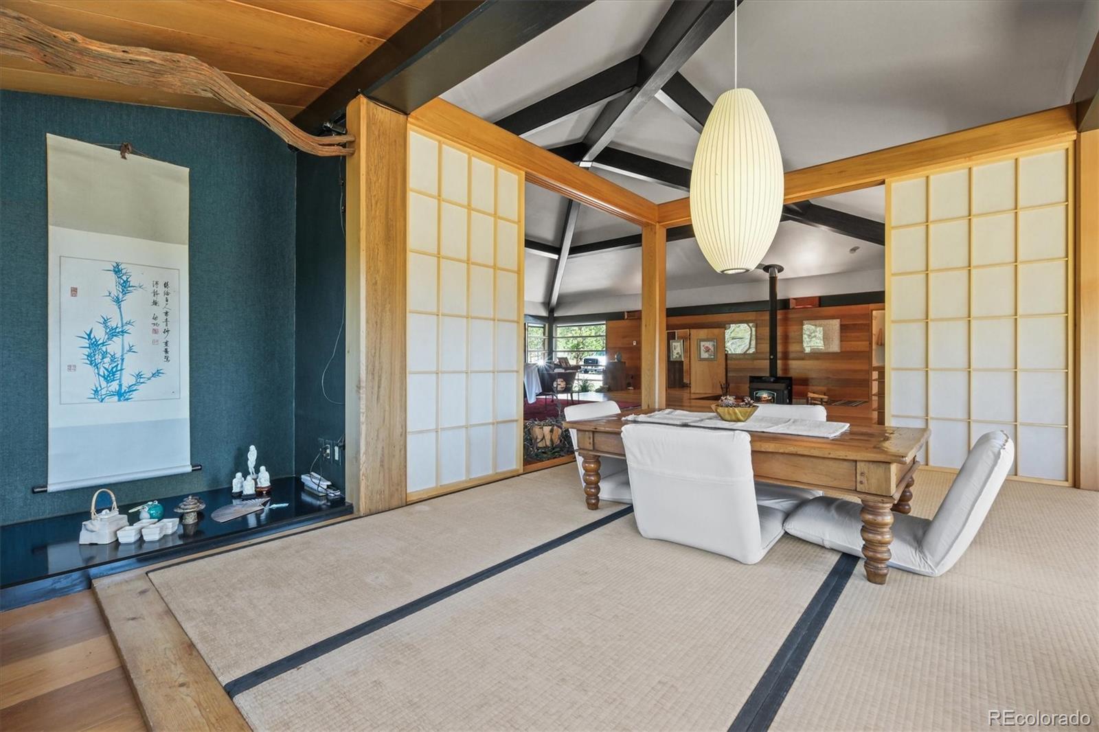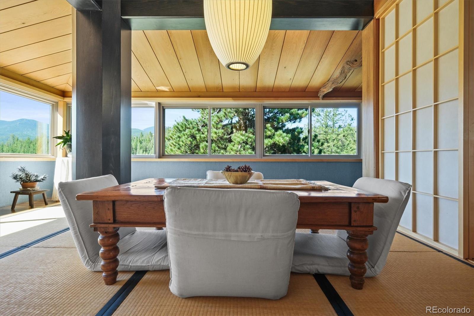 Welcome to Mizukara Ranch—a private retreat nestled on 35 acres with breathtaking mountain views and unique living spaces. This extraordinary home blends natural beauty with modern comfort, offering a serene escape just minutes from everyday conveniences. The expansive great room features soaring ceilings, a cozy fireplace, and abundant natural light, creating a warm and peaceful atmosphere. The meditation room is your retreat, offering stunning views and a calming atmosphere. The heart of the home is the modern 20' x 20' kitchen designed for both function and style. Two tone cabinets and sleek Quartz countertops pair perfectly with Bosch and Jenn-Air appliances. The expansive island offers storage on both sides and there is a walk-in pantry. The corner fireplace and large picture window with inspiring views offer unparalleled ambiance. Oversized sliding doors open to a spacious deck perfect for entertaining or relaxing with a view, and the Butler’s Pantry adds extra convenience. Two bedrooms with en suite bathrooms on the lower level present privacy and views. The luxurious primary suite was designed with accessibility in mind, ideal for someone seeking to age in place. Take the elevator or the stairs and prepare to be enveloped in tranquility. The spa-inspired bath is highlighted by the roll-in shower. Corner fireplace in the bedroom draws your eye to the oversized sliding door with access to the west facing patio and deck with a built in hot tub. Enjoy multiple outdoor living spaces, a putting green, and a beautifully landscaped yard complete with a koi pond and cascading waterfall. It features a worry-free whole house generator! Down the private drive, a separate 1,440 sq ft studio offers flexible space for creative pursuits or guests, featuring vaulted ceilings, a loft, breakfast bar, and private bathroom. The 2 car oversized detached garage has a workshop and storage. This property is like no other, presenting the best of mountain living and 1 hour to skiing!
