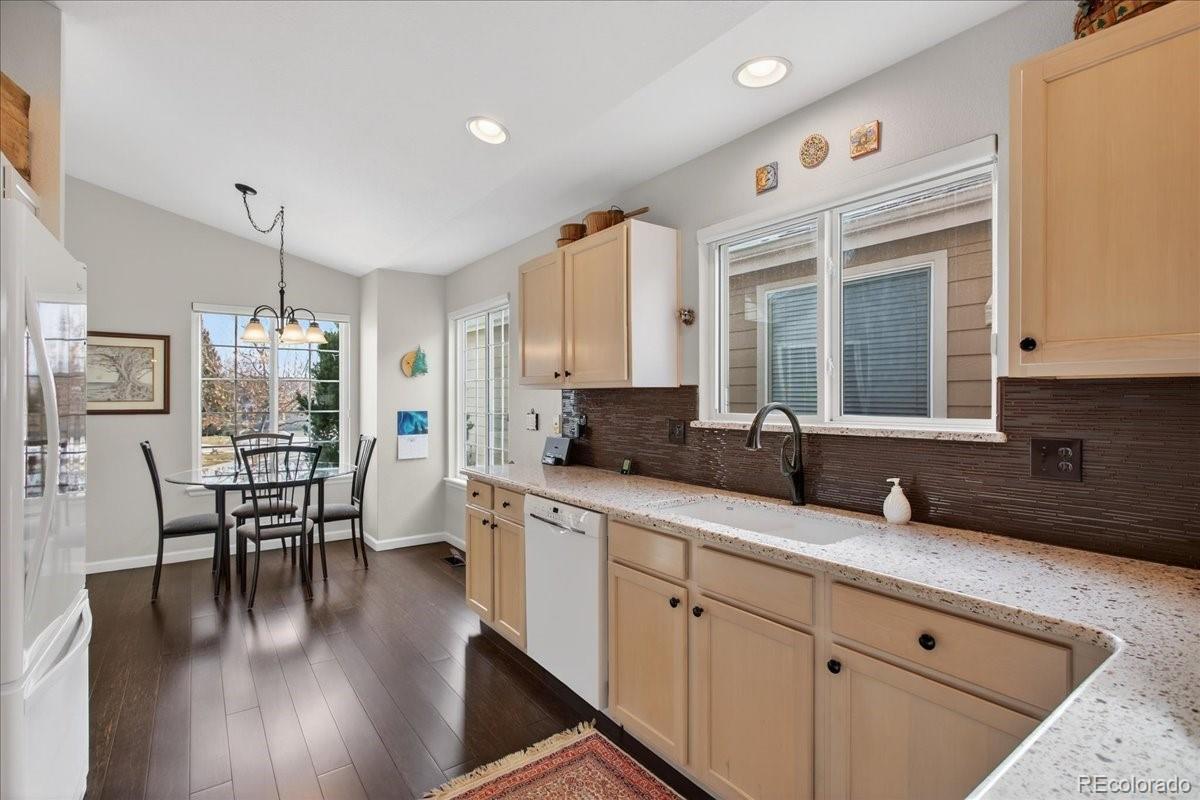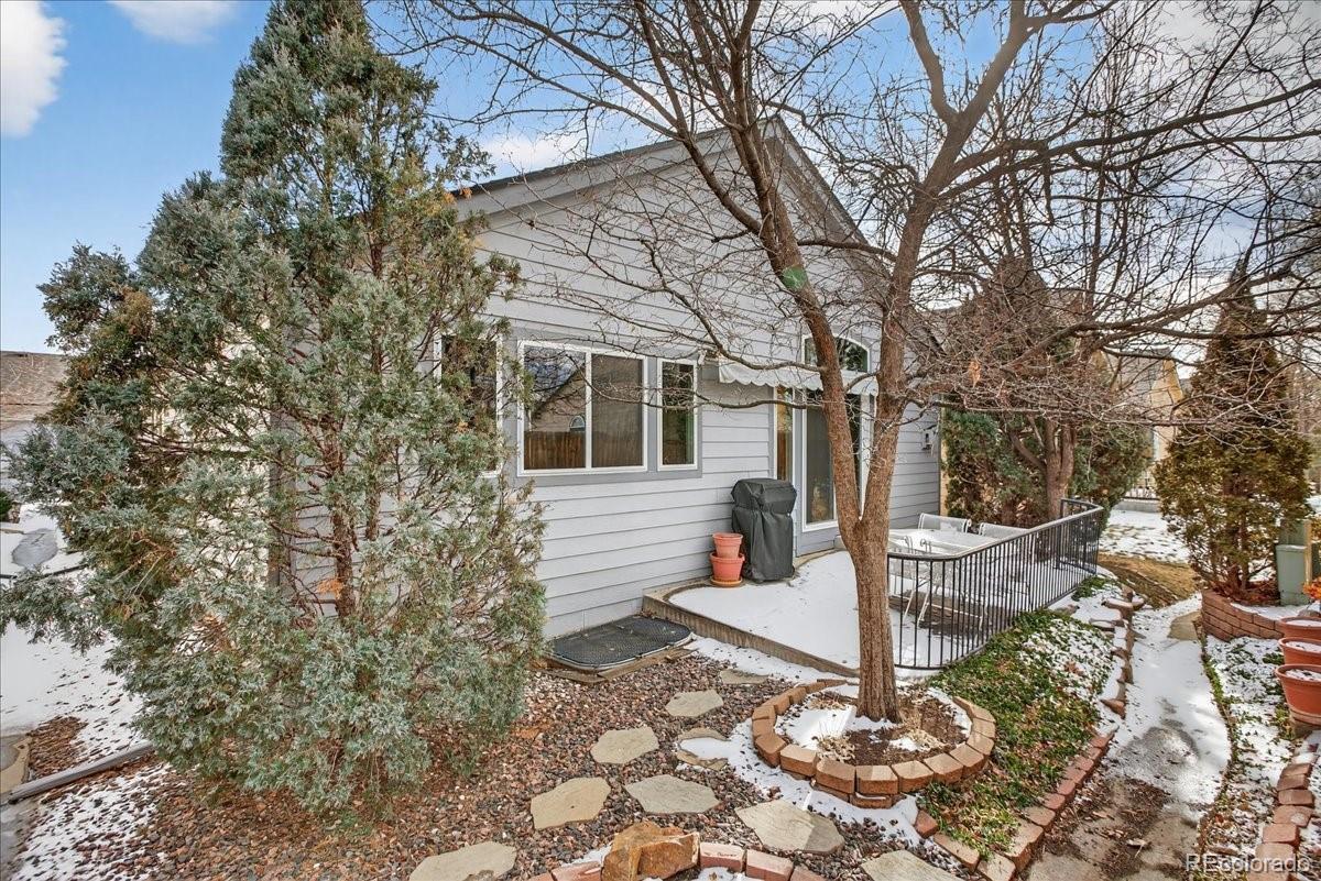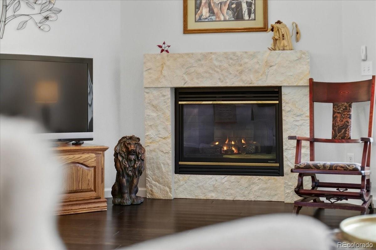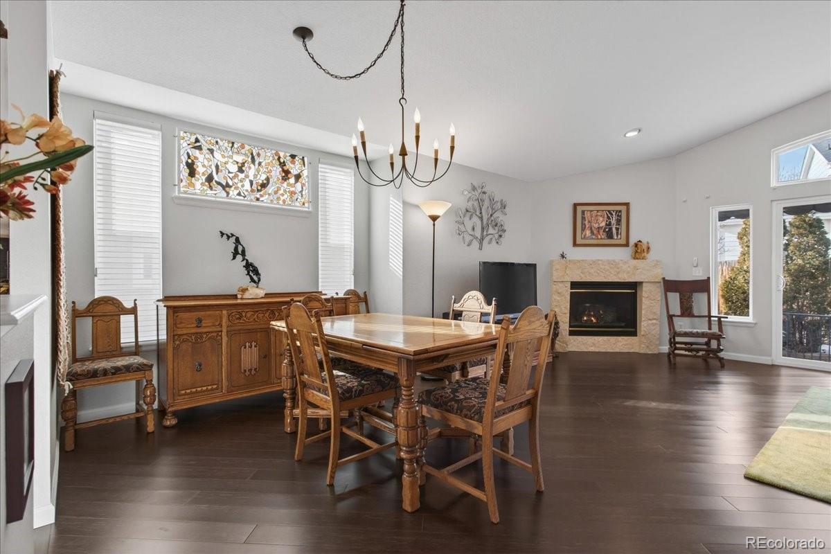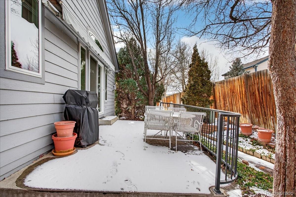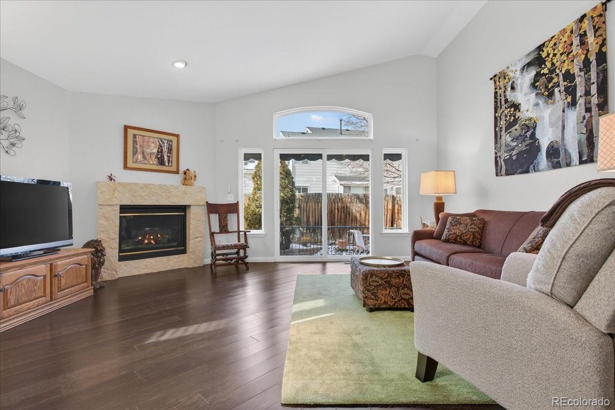 Welcome to a highly desirable ranch home in the gated Township at Dakota Patio Homes! Situated on a quiet cul-de-sac, this residence offers many appealing features: 12 ft ceilings, vaulted spaces, plentiful light, strand-woven bamboo floors throughout the main floor, quality double pane windows, fresh interior paint, and thoughtful updates made by its original owner. The open living room with high/vaulted ceilings is a beautiful space to relax, featuring a custom cement corner gas fireplace (appears to be marble!). Adjacent is the dining room fitted with a fine art stained glass window. The living area opens to the backyard patio featuring low-maintenance rock landscaping and trailing vinca. The kitchen offers a sunny eat-in nook, window over the sink, whitewashed cabinetry, durable Silestone quartz counters, brown glass tile backsplash, and white appliances. You'll love the spacious main floor Primary suite boasting a bank of windows & ensuite 5-piece bath with dual vanity, tiled floor & shower, soaking tub w/ block windows, walk-in closet. On the main you also have a guest bedroom, full bath & laundry room fitted with cabinets. The basement is fully finished with red oak flooring and lots of livable space: rec/bonus area (perfect entertainment room), bedroom with walk-in closet, 3/4 bath with unique green Norwegian granite floor & counters, and utility/storage room. Improvements of note: Landmark Climate Flex Class 4 Roof 2024, 40 gal water heater 2025, new sliding patio door & DP windows throughout 2021, Carrier furnace & AC 2020. Structural /foundation repairs have been completed for which there is full documentation. The HOA is responsible for front yard mowing, snow removal, exterior painting, trash-recycling-water-sewer. Enjoy the community pool and ideal location just off of Belleview, close to shopping & transportation, plus you have the convenience of a low maintenance "lock and leave" lifestyle. Don't miss this opportunity!